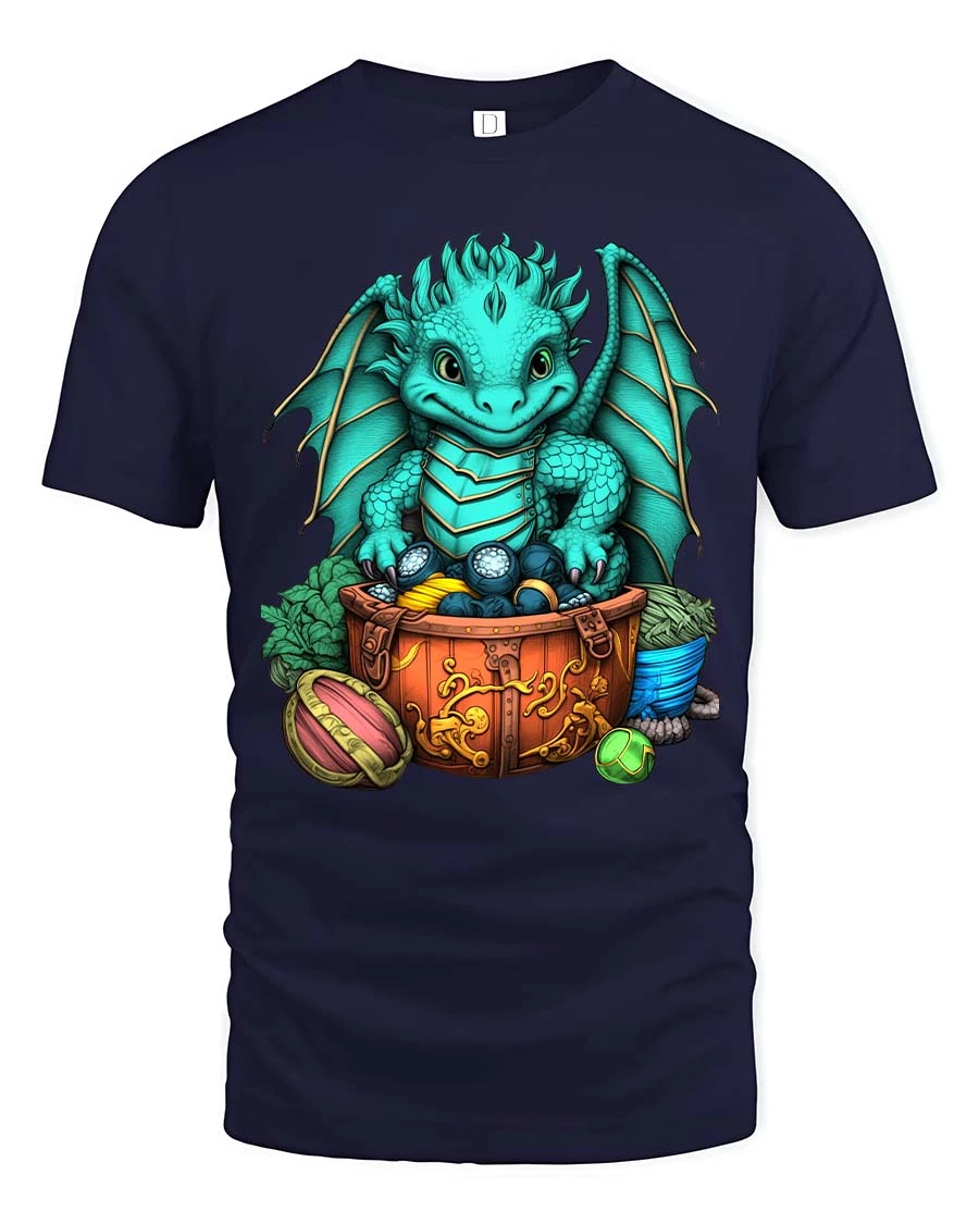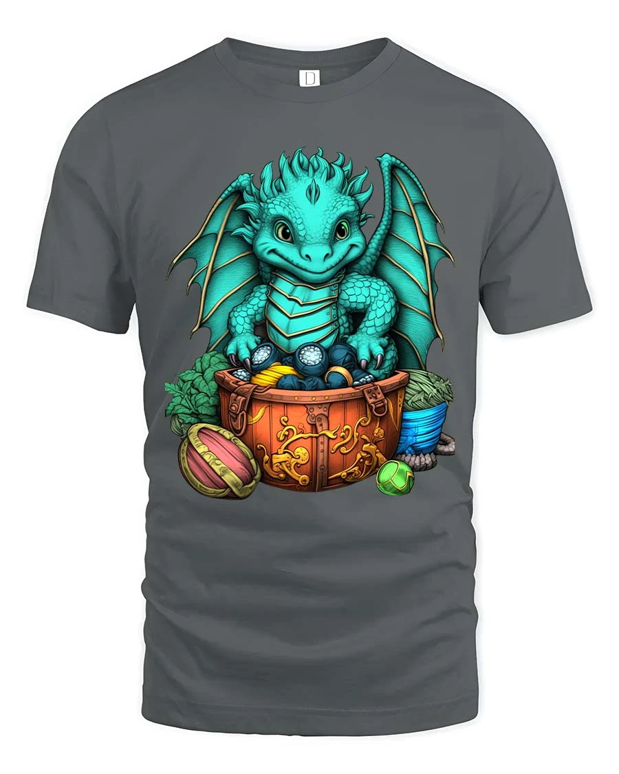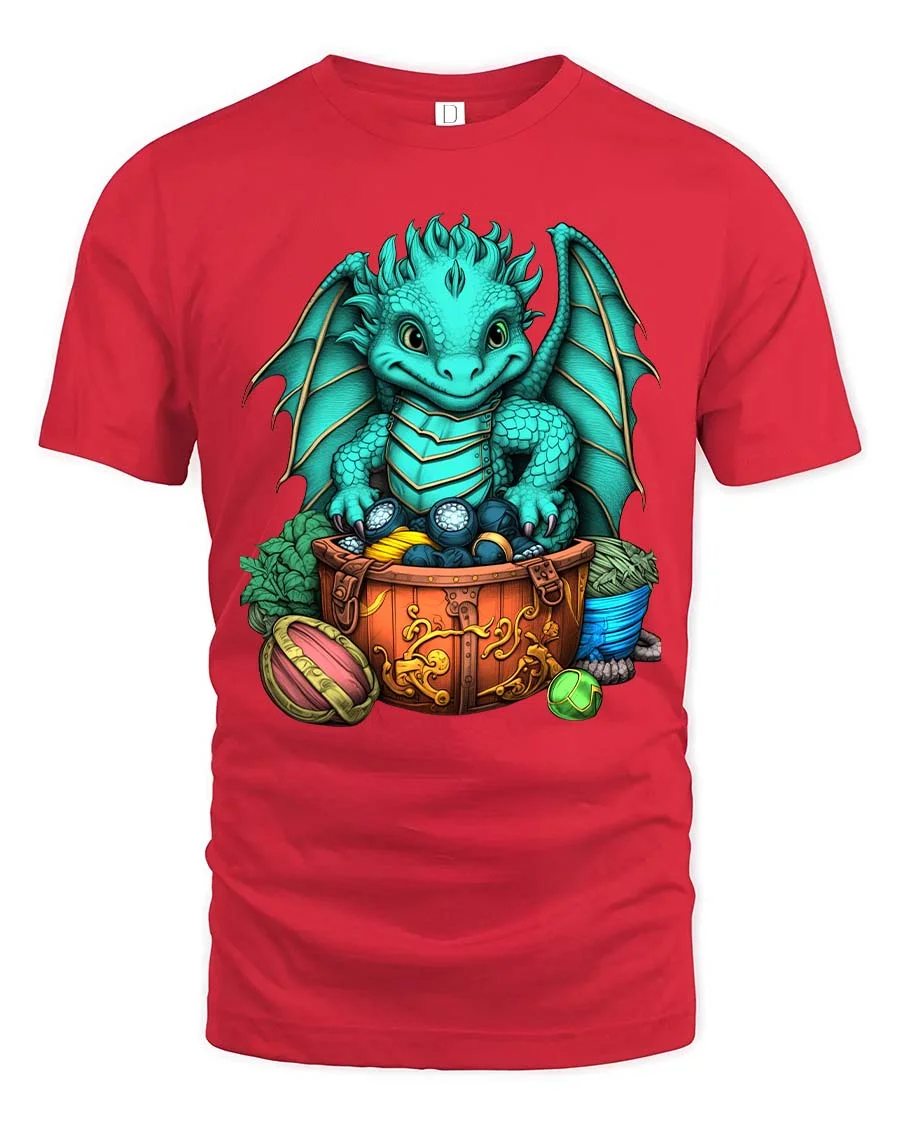 Cute Baby Dragon Treasure Chest Fantasy Graphic T Shirt brings a charming and magical design to life with a playful fantasy theme.