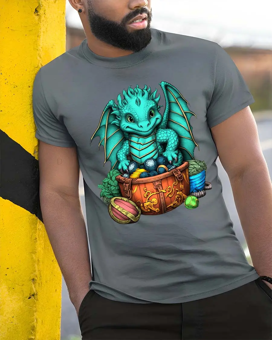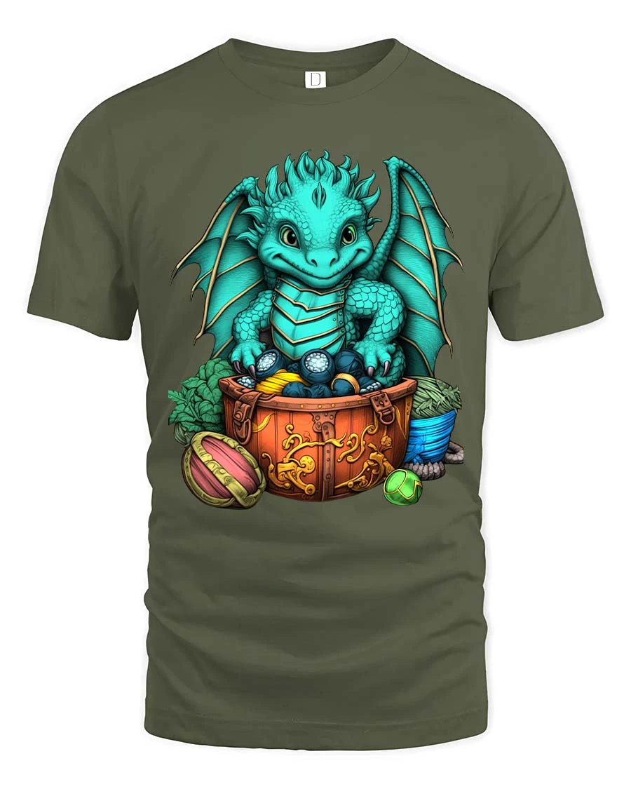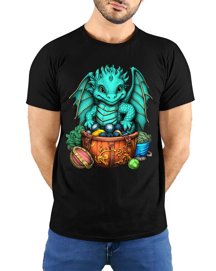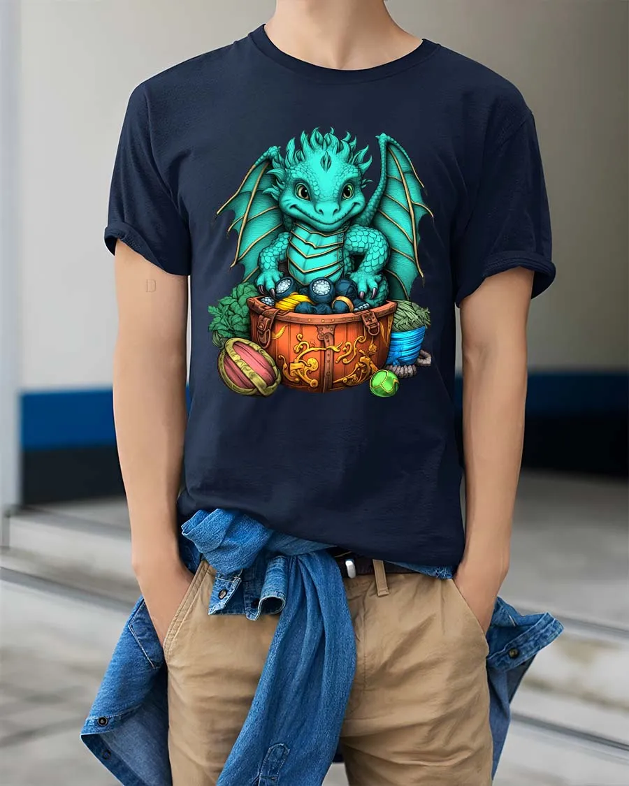 Cute Baby Dragon Treasure Chest Fantasy Graphic T Shirt brings a charming and magical design to life with a playful fantasy theme.