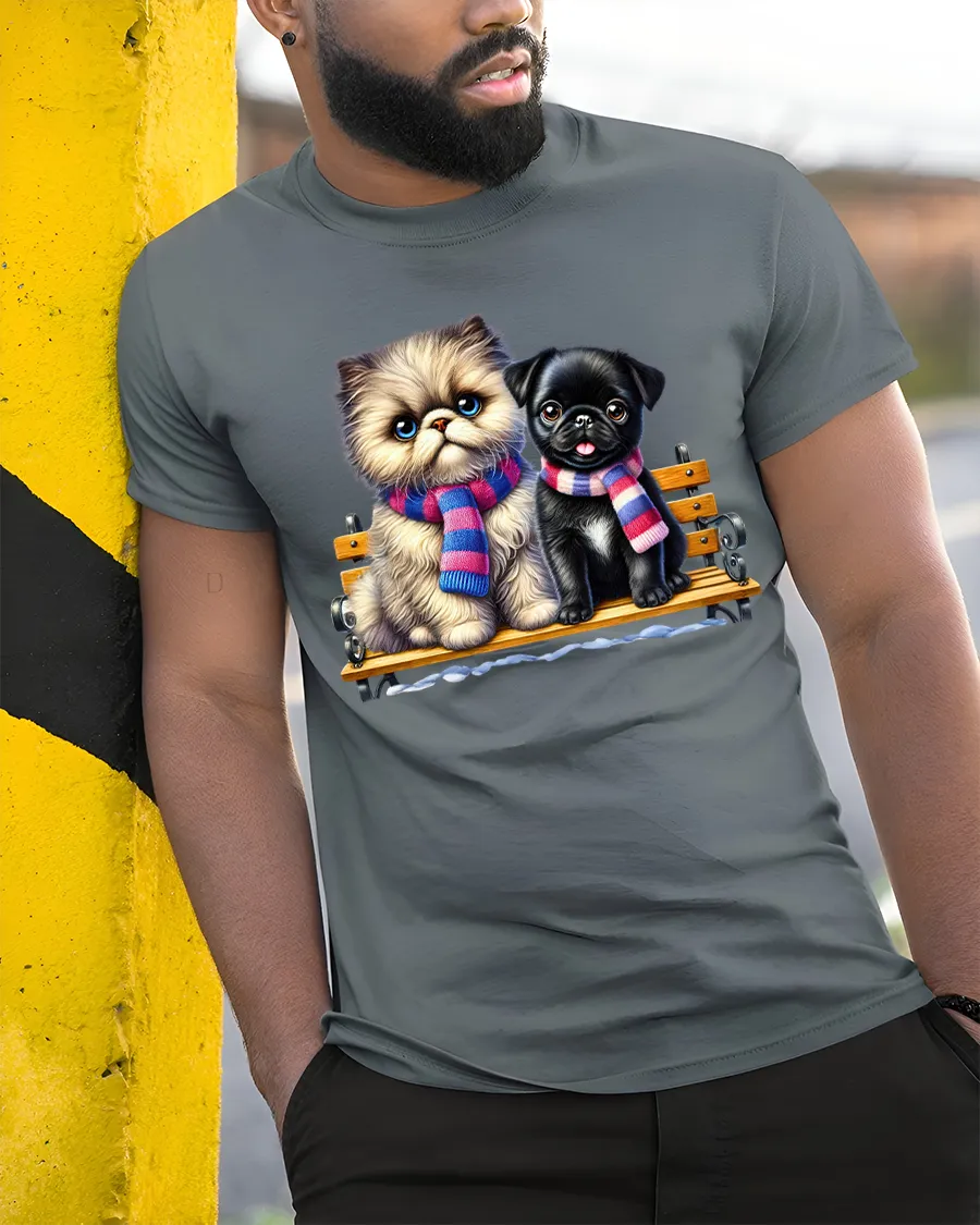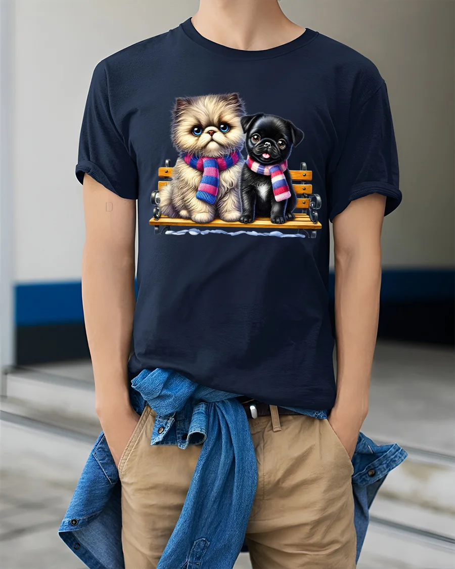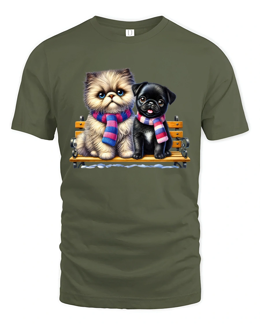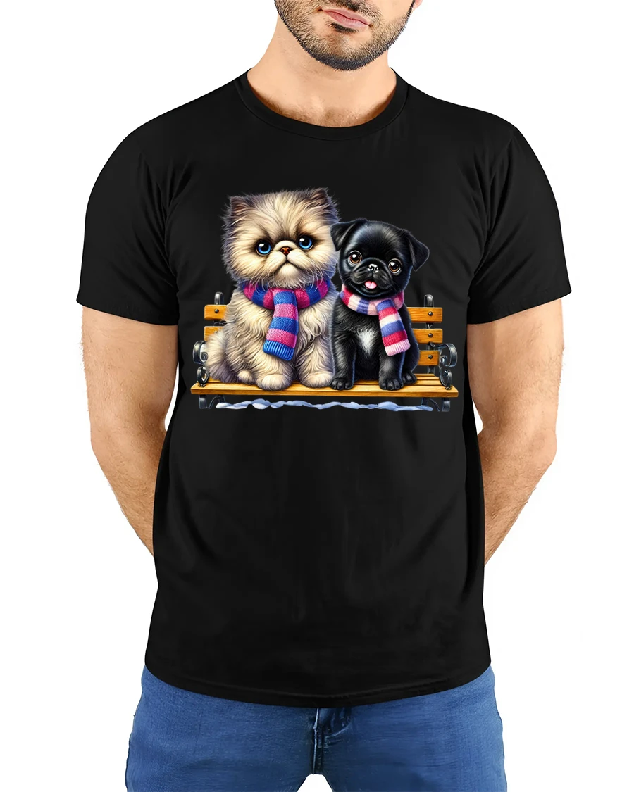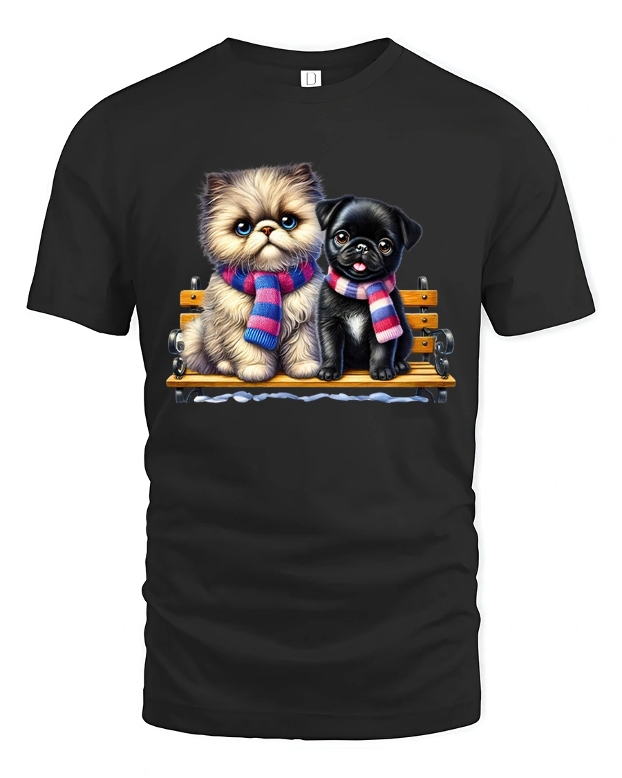 This heartwarming design features an adorable fluffy cat and a little black puppy sitting side by side on a bench, both wearing matching striped scarves. The playful details and cozy winter vibe make it perfect for animal lovers who adore charming, feel-good designs.