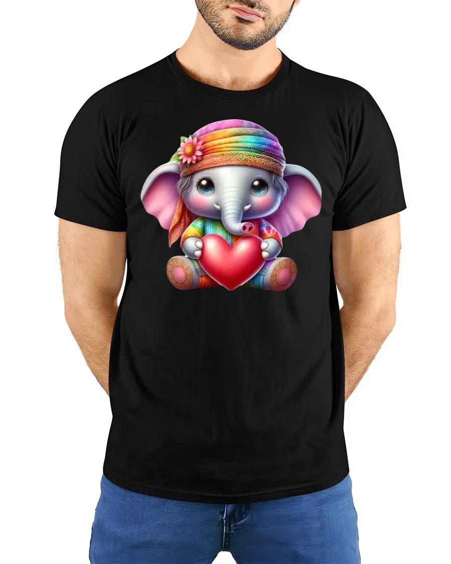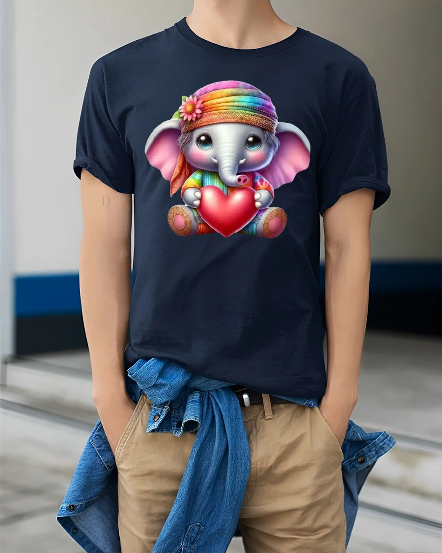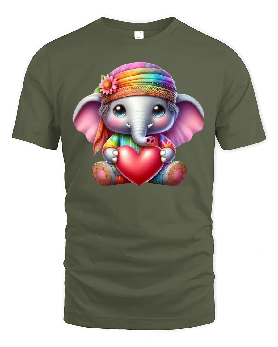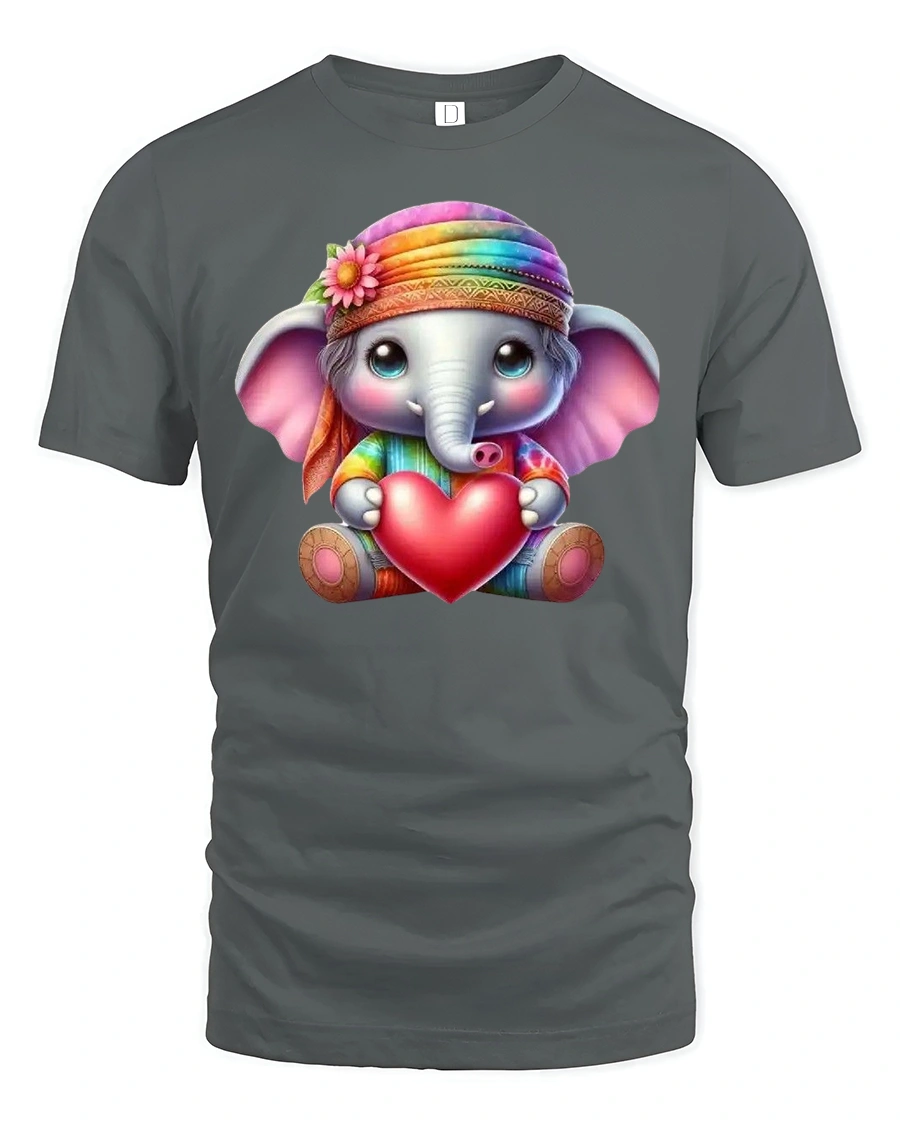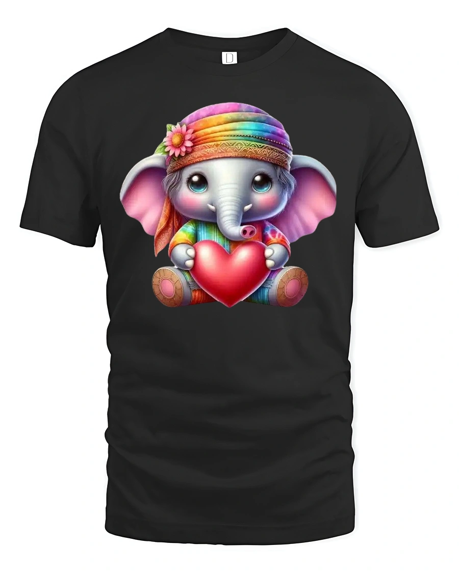 Featuring a baby elephant holding a red heart and dressed in a rainbow outfit with a flower headband, this design captures joy and kindness in every detail.