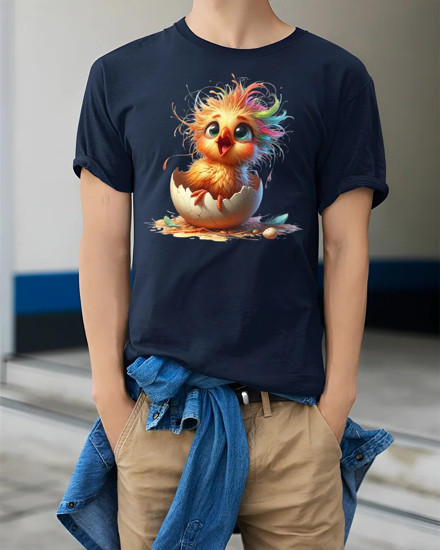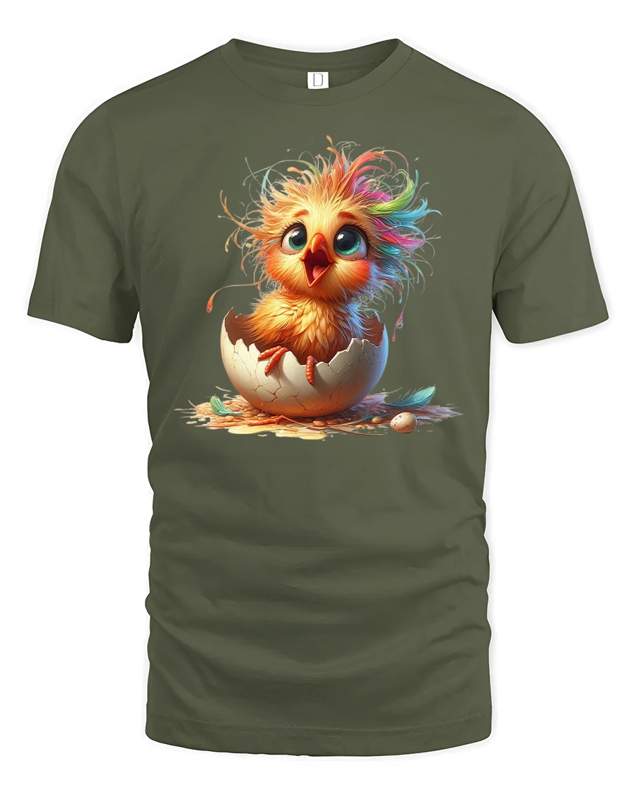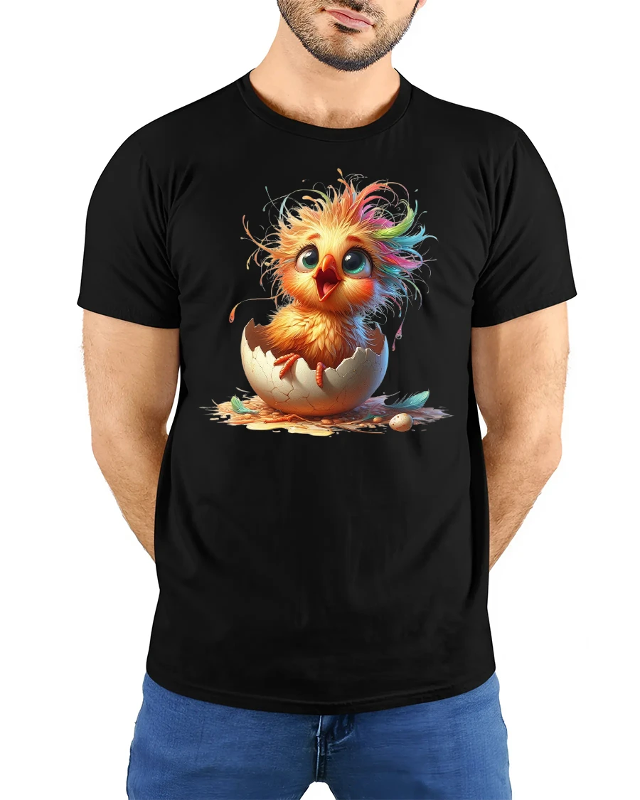 Featuring a bright, fluffy baby chick bursting out of its eggshell with rainbow-tinted feathers and wide eyes, this tee radiates joy and new beginnings.