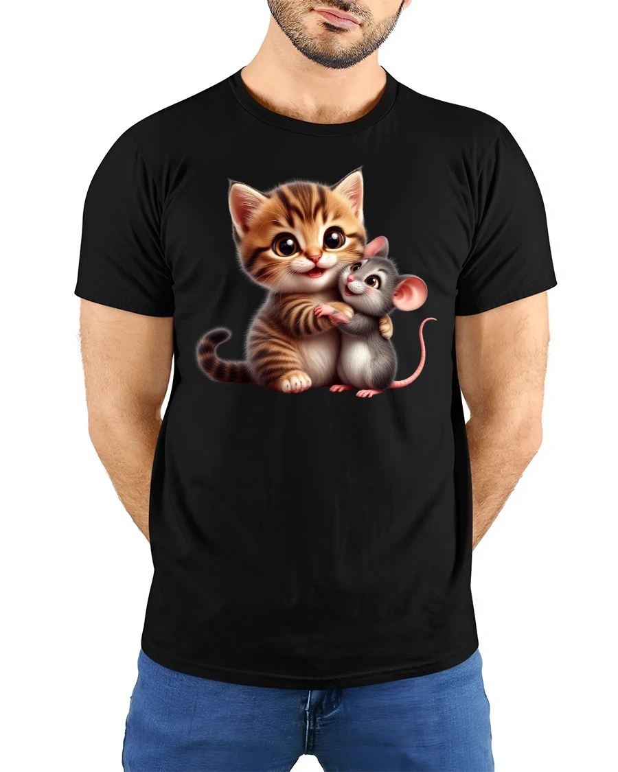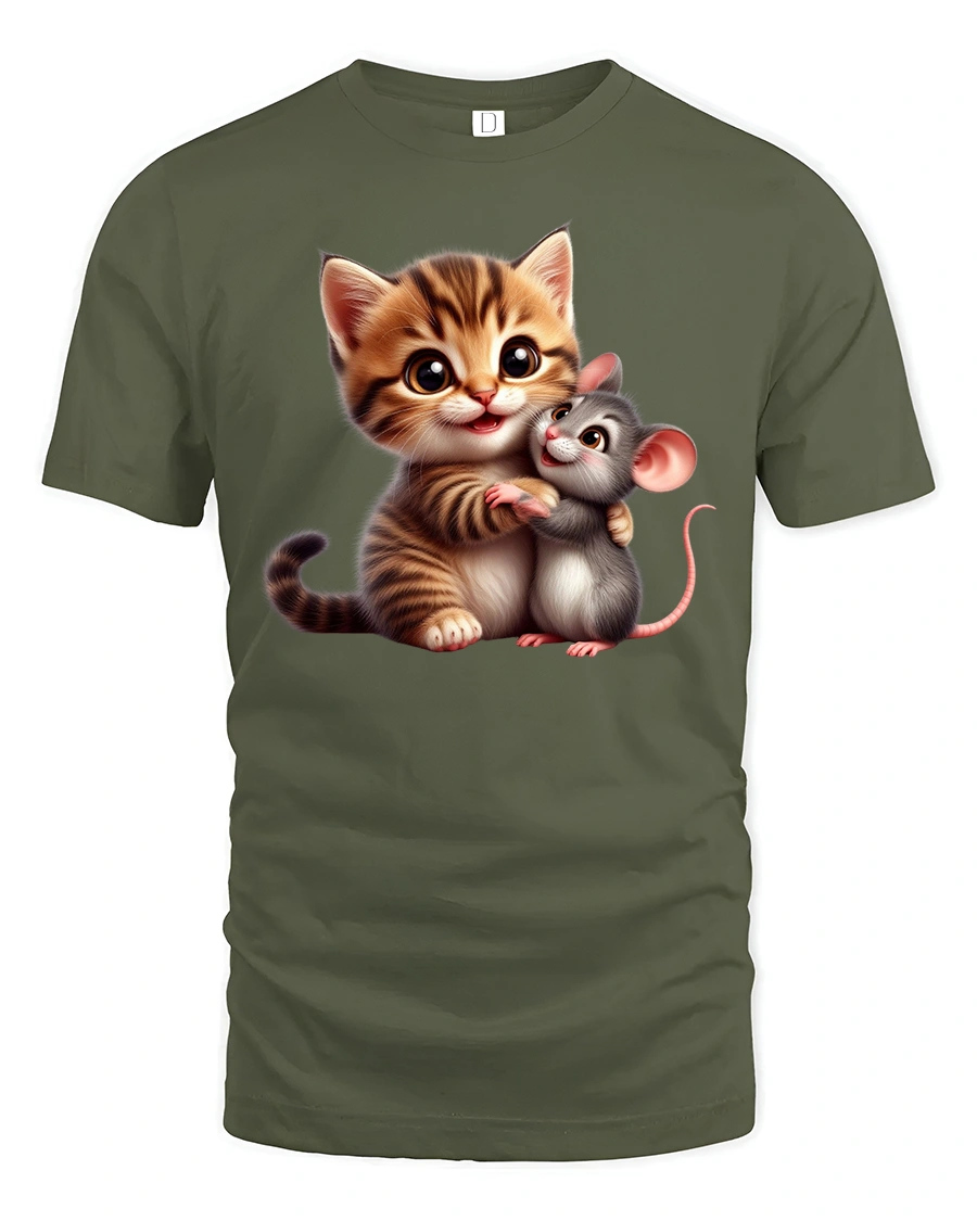 This Cute Kitten and Mouse Friends Adorable Animal Hug Graphic Tee captures the heartwarming bond between two unlikely friends—a fluffy baby kitten and an adorable little mouse sharing a sweet hug. The charming design features expressive eyes, soft details, and a warm, playful atmosphere that appeals to both kids and adults who love cute animals and uplifting artwork.