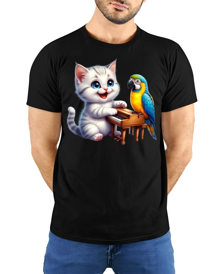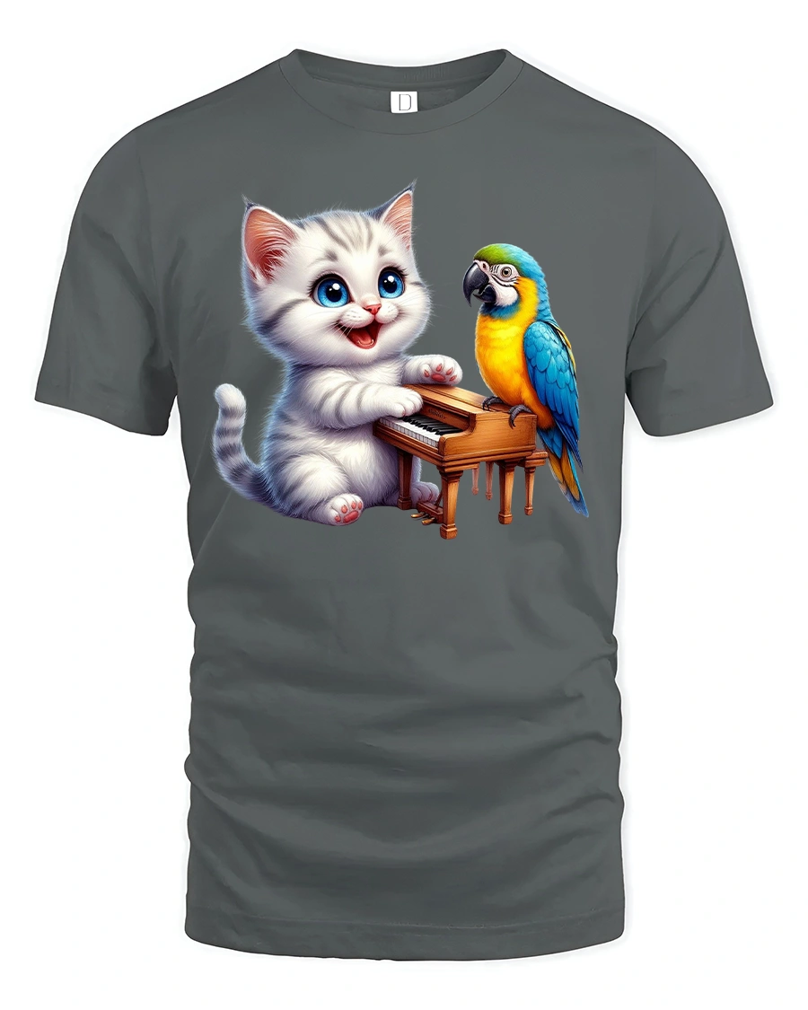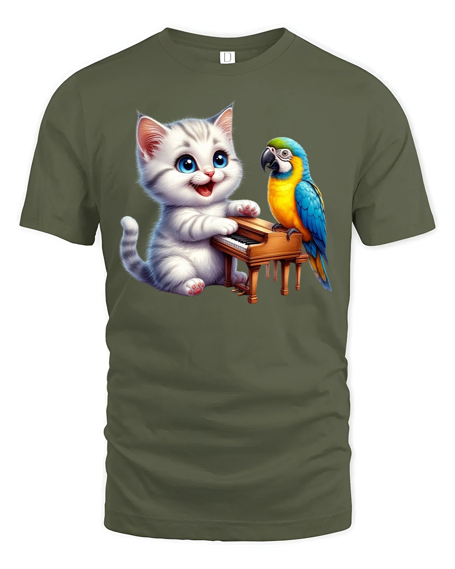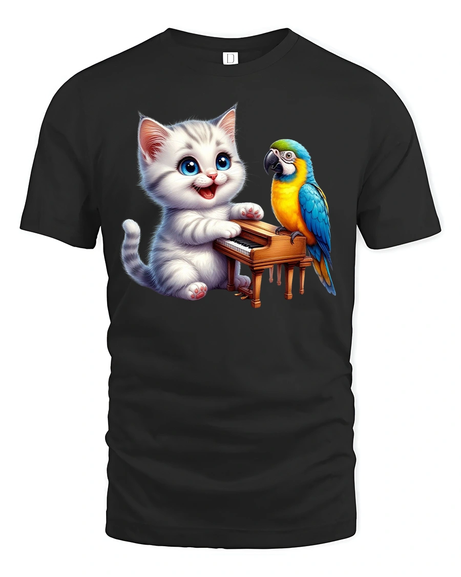 This playful tee features a cute kitten playing a tiny piano while a colorful parrot sings along — a delightful mix of music, friendship, and fun.