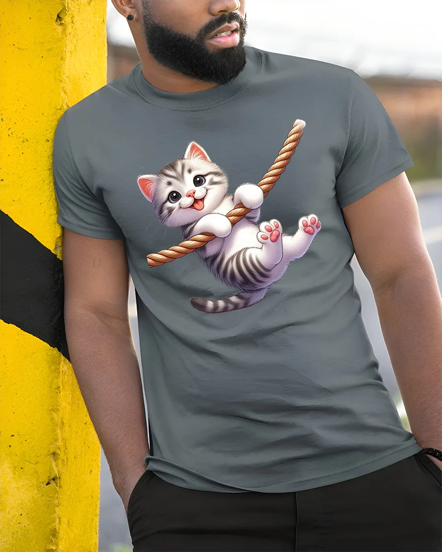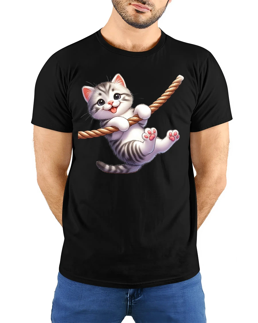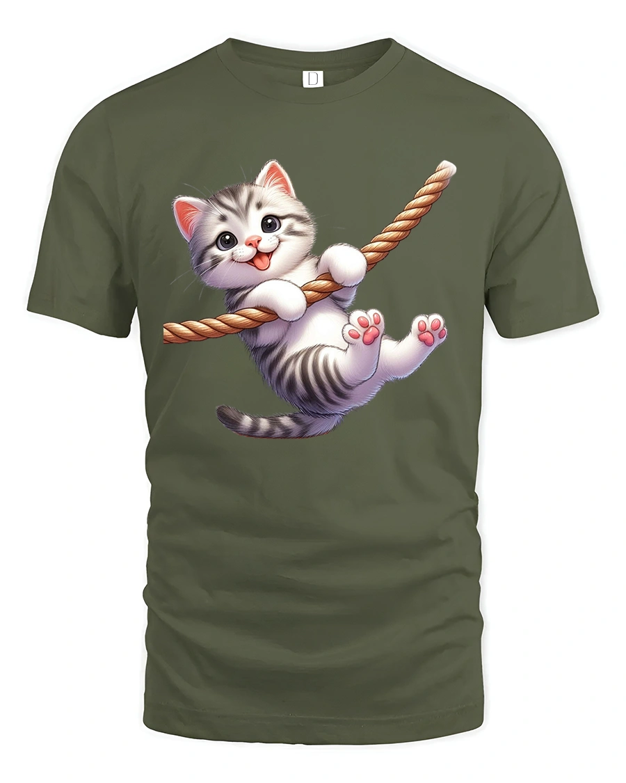 Cute Kitten Rope Swing Tee brings instant smiles with an adorable kitten happily swinging on a rope in a playful cartoon style.