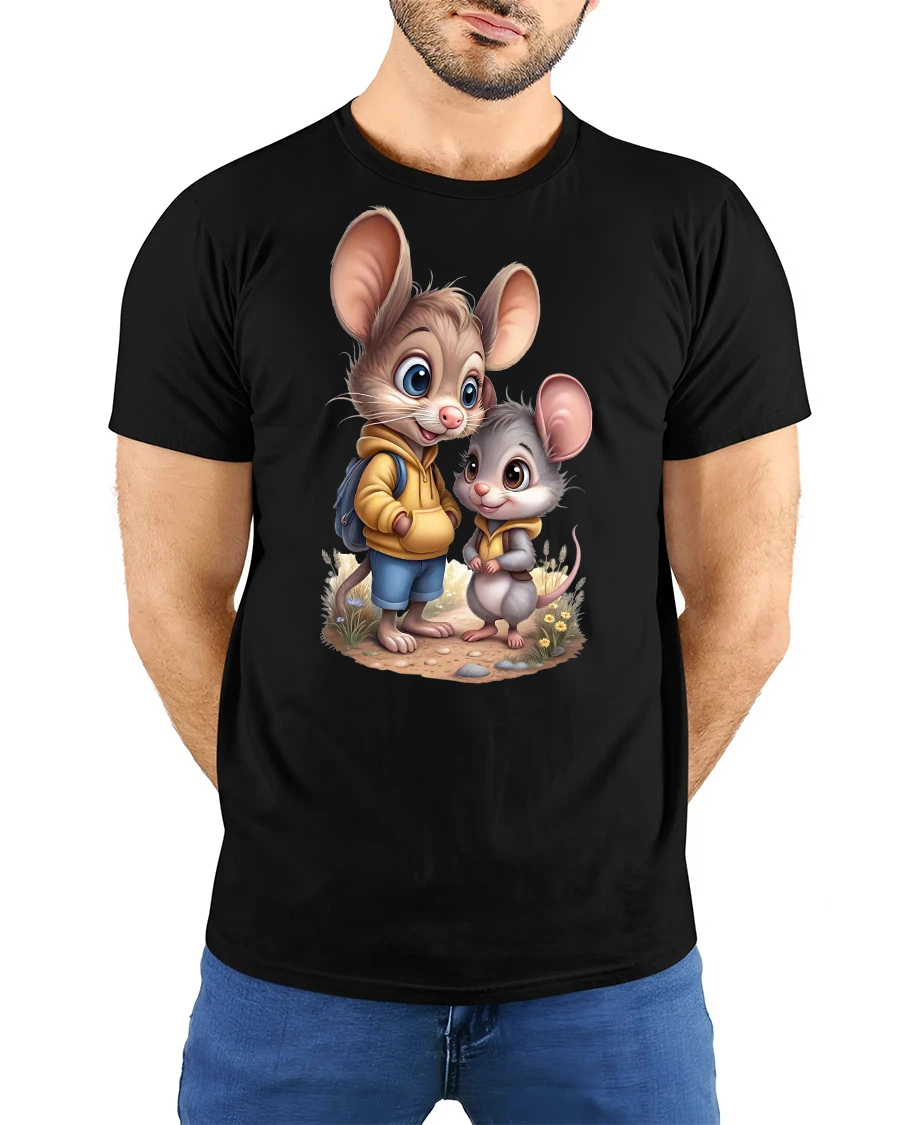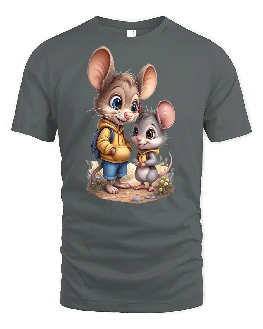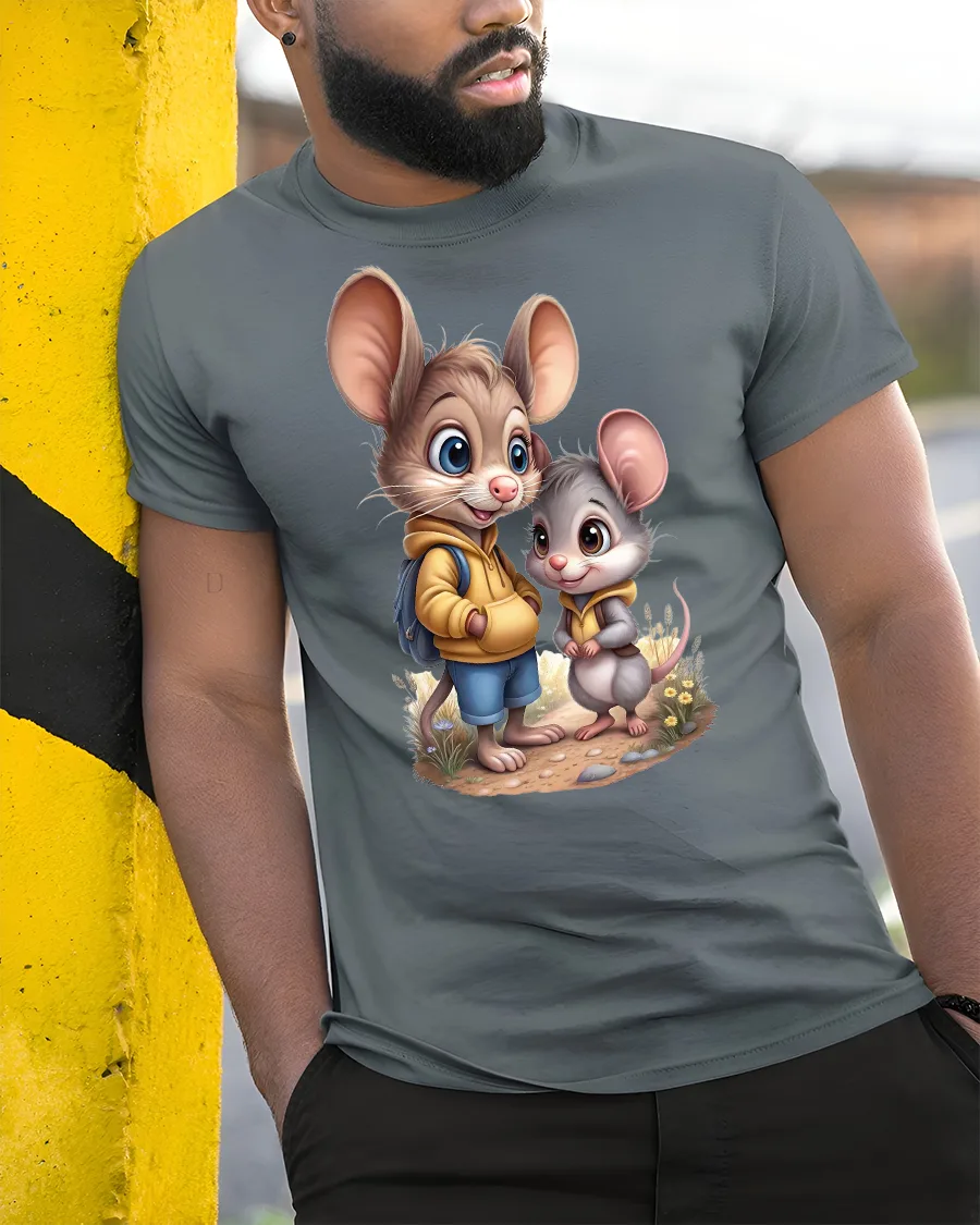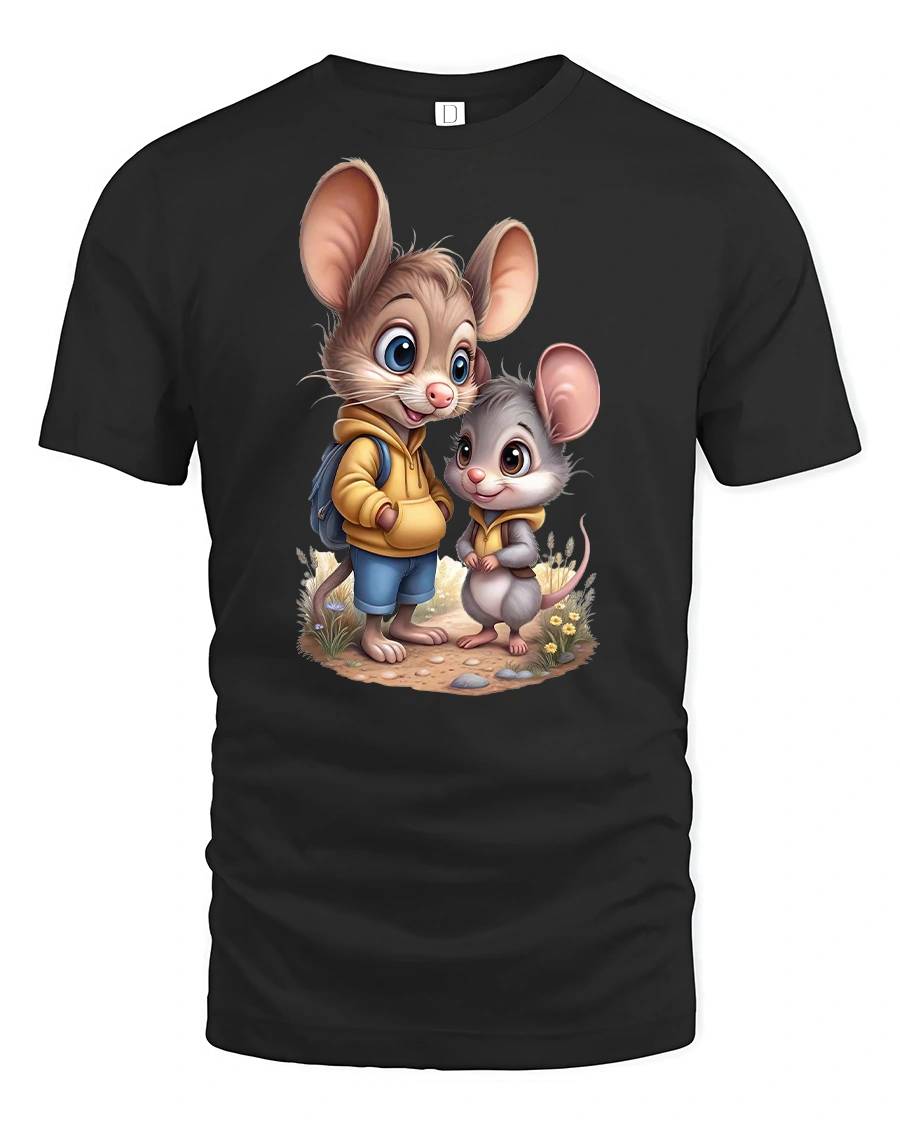 Cute Mouse Friends Adventure Cartoon Graphic T-Shirt is a heartwarming design that captures friendship and fun in the most adorable way. Featuring two cute mice dressed in cozy clothes, ready for an outdoor adventure, this tee perfectly blends charm and creativity. The detailed cartoon art and bright colors make it a standout piece for anyone who loves cute and friendly animal designs.