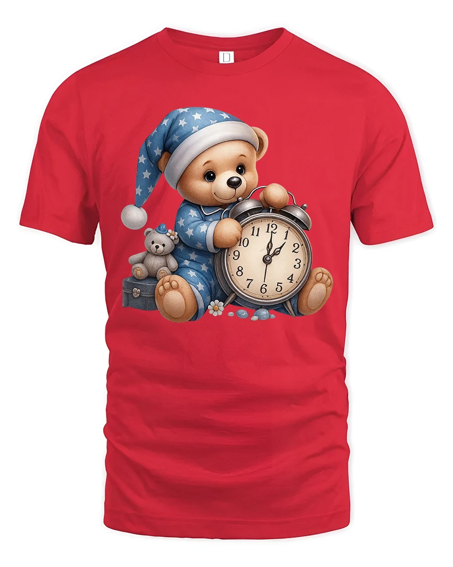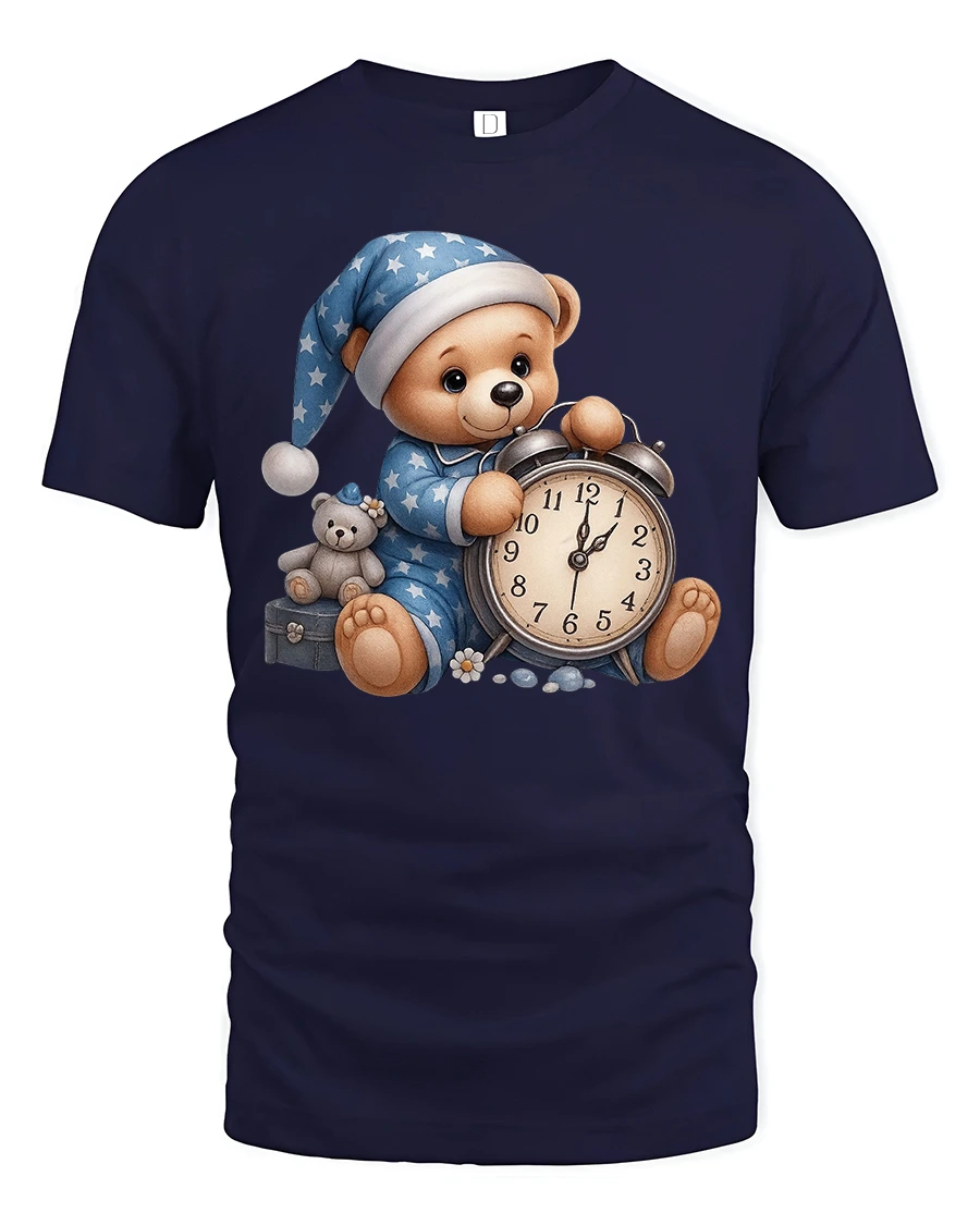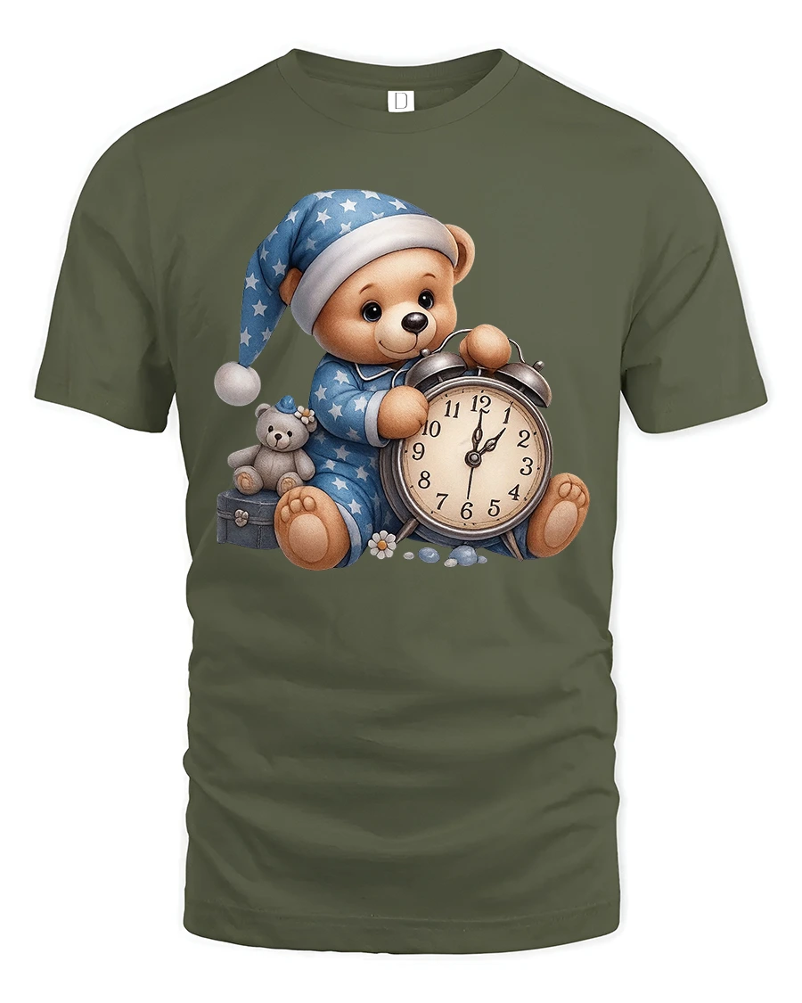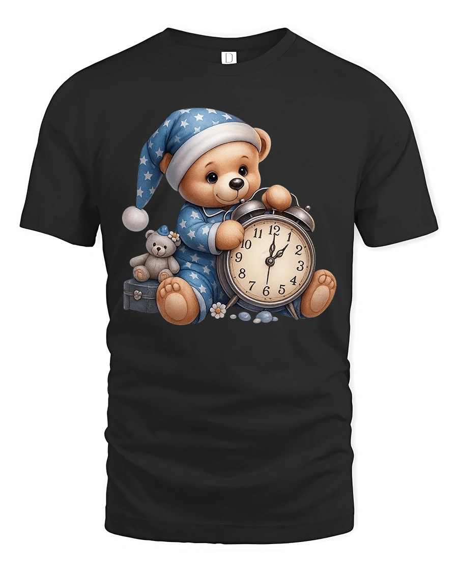 Cute Sleeping Teddy Bear With Alarm Clock Cozy Graphic Tee brings warmth, comfort, and gentle charm into a wearable design.
