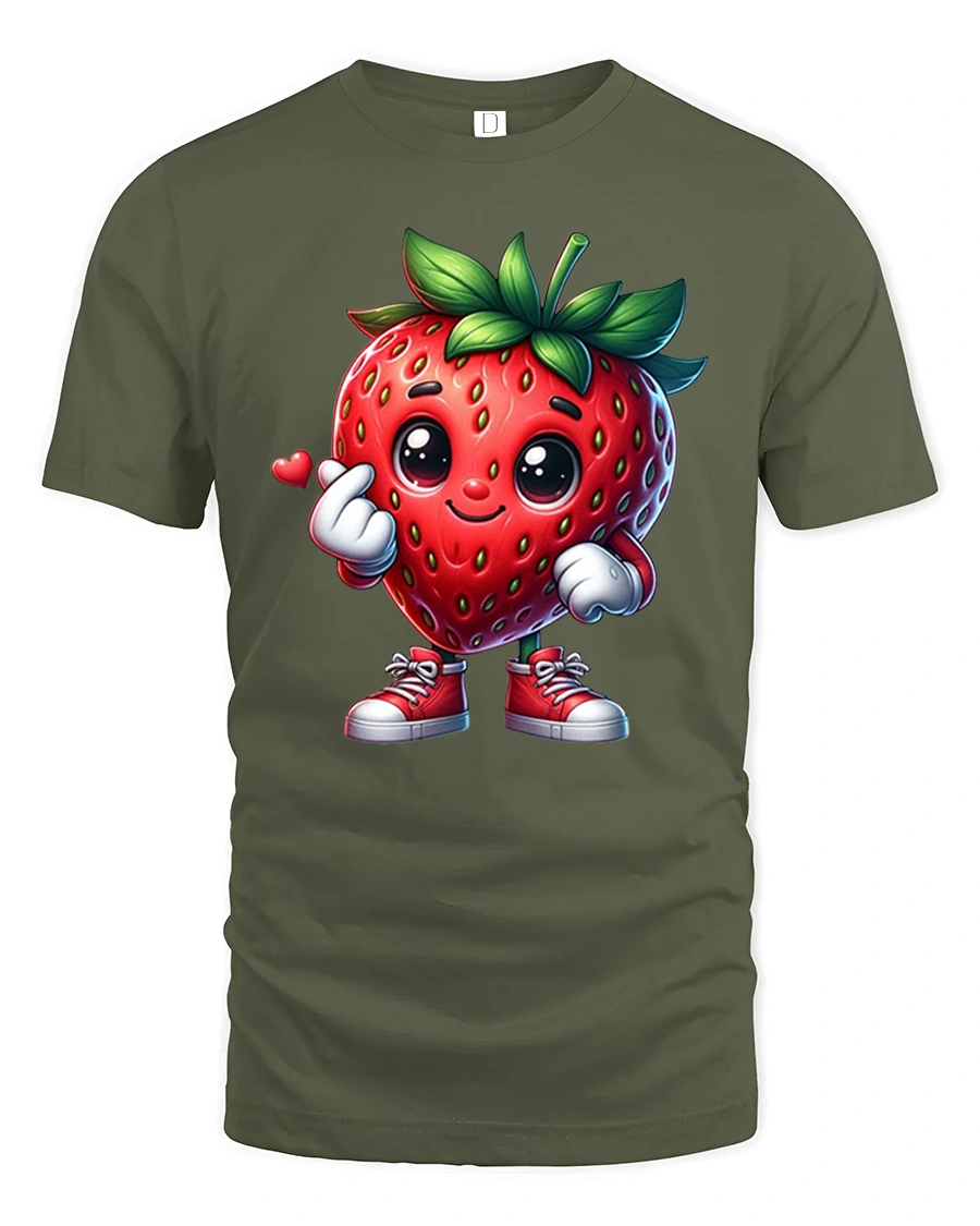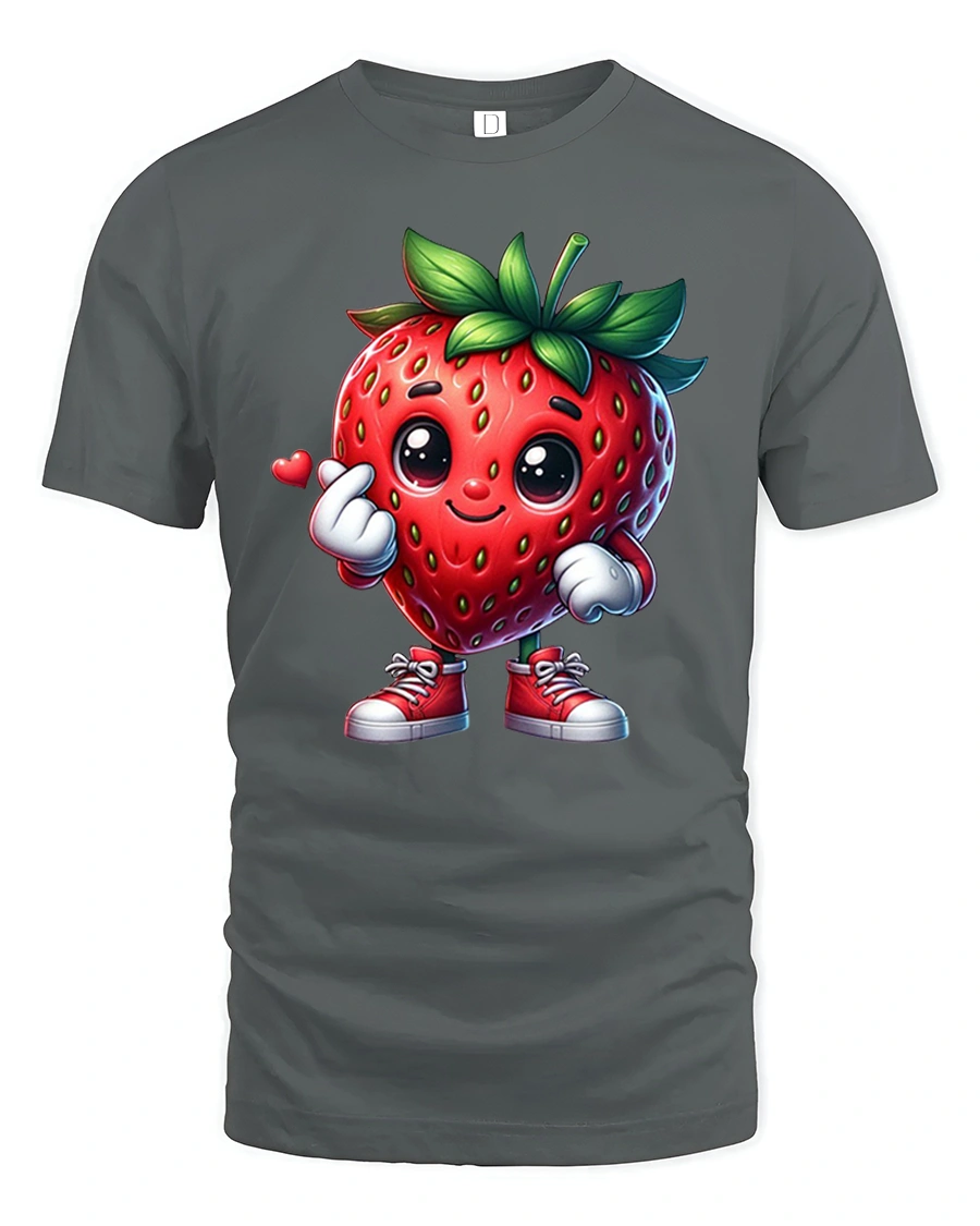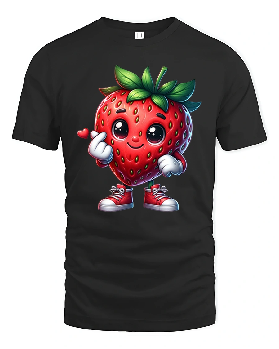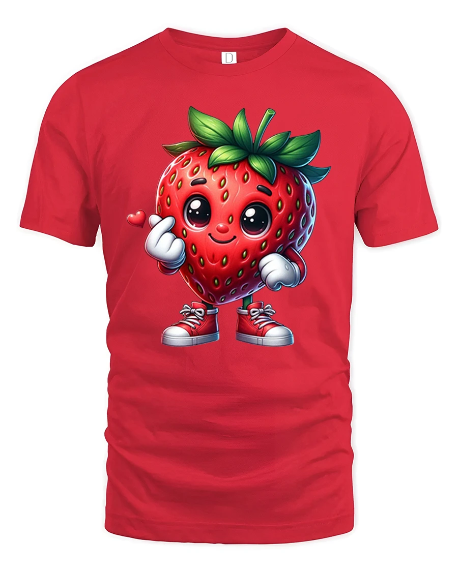 Cute Strawberry Character Tee Sweet Kawaii Fruit Tshirt brings charm, color, and pure joy to your everyday style. Featuring an adorable strawberry character with bright eyes, leafy hair, red sneakers, and a tiny hand heart gesture, this design is perfect for anyone who loves cute and playful fashion. The lively artwork and cheerful expression make it a standout tee for both kids and adults who enjoy fun, expressive graphics.