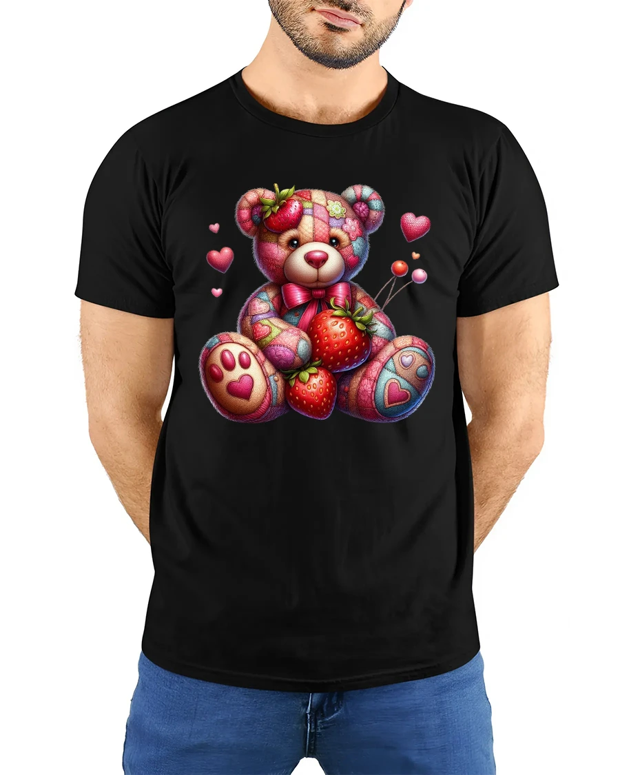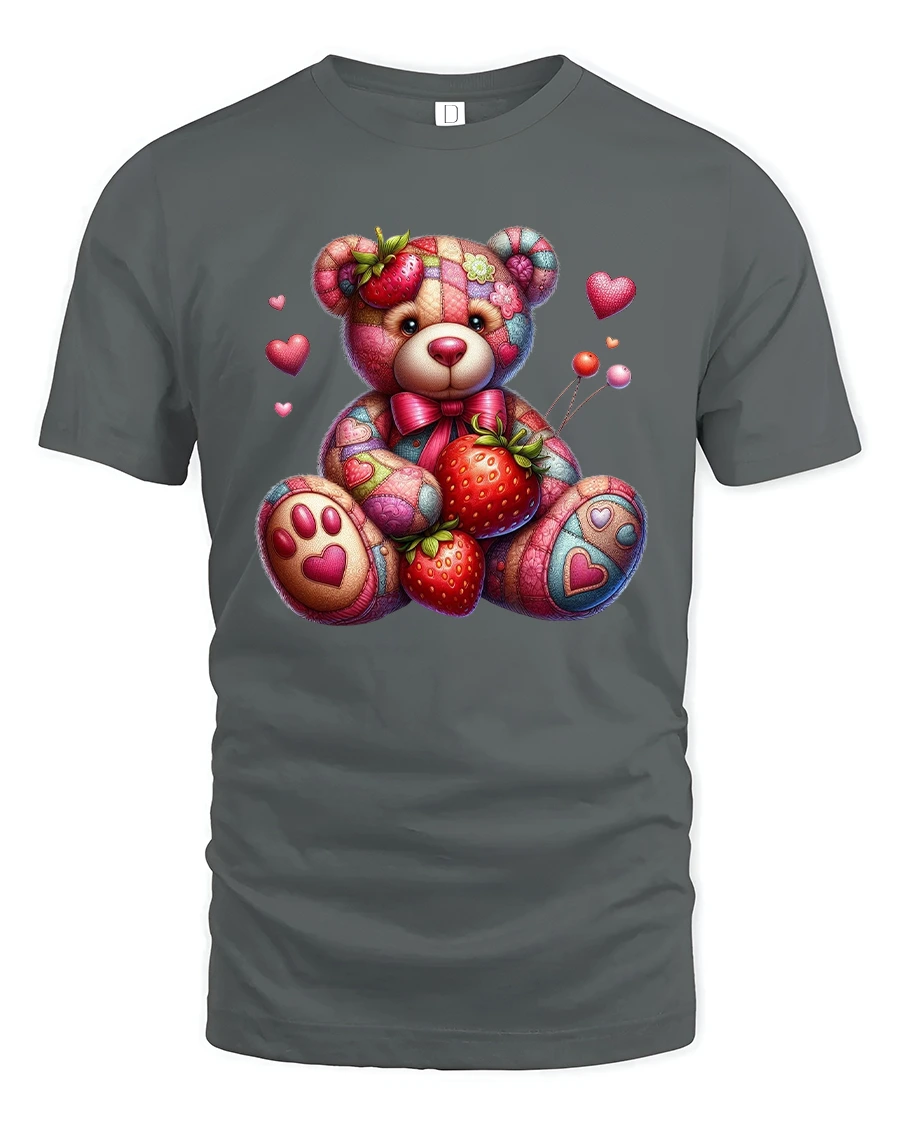 Featuring a patchwork teddy bear hugging strawberries and surrounded by hearts, this design captures a sweet, cheerful vibe that’s perfect for everyday wear or as a lovely gift.