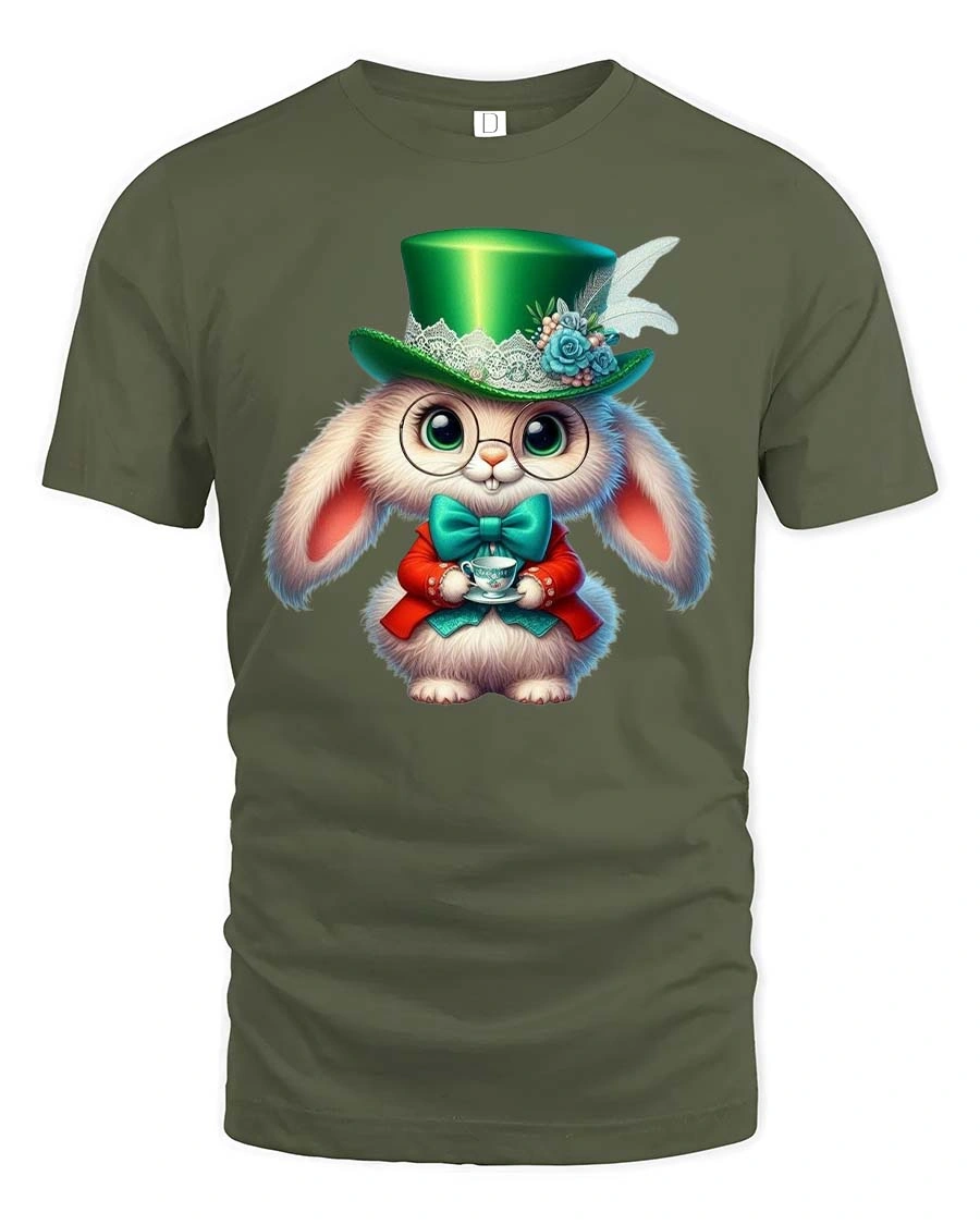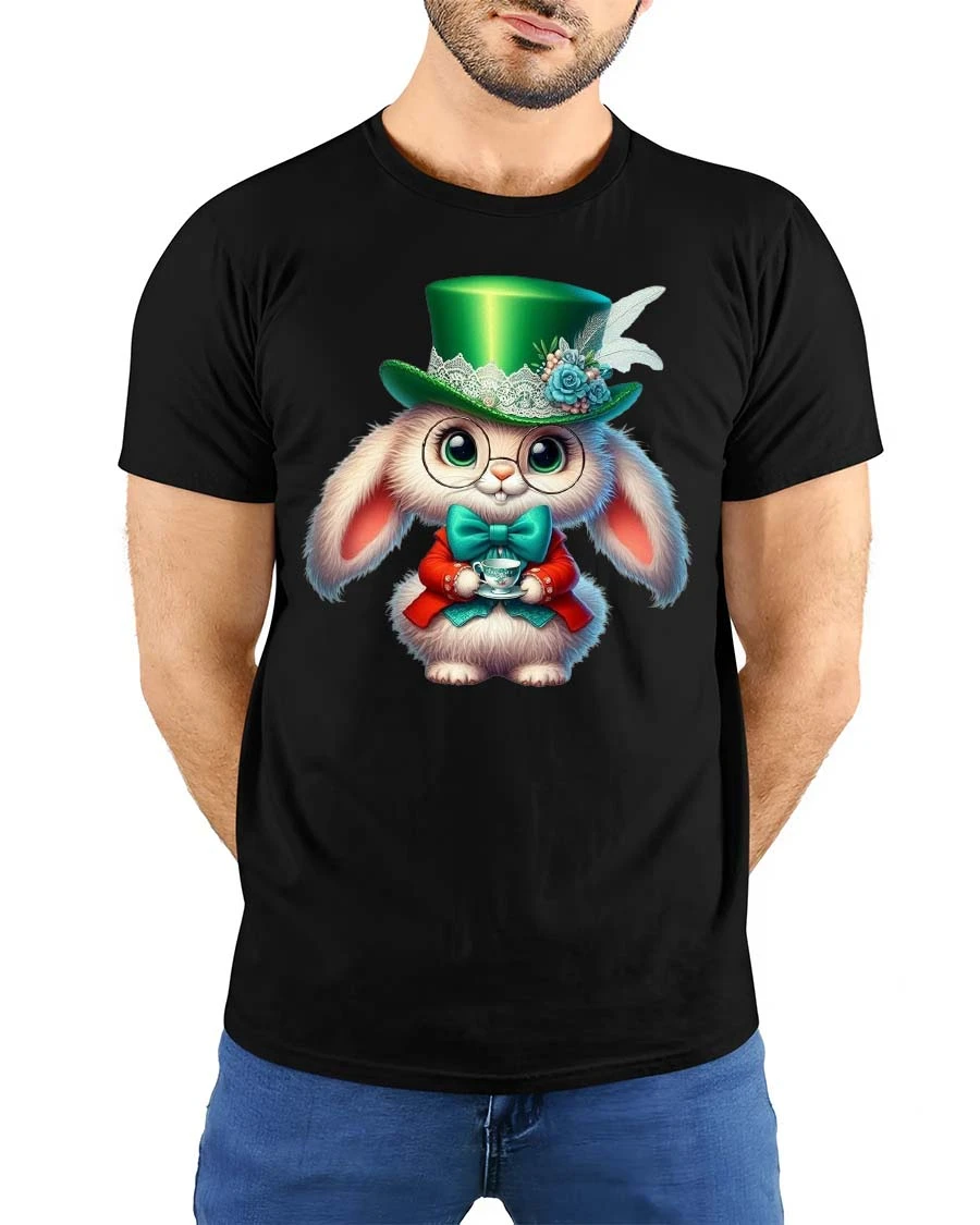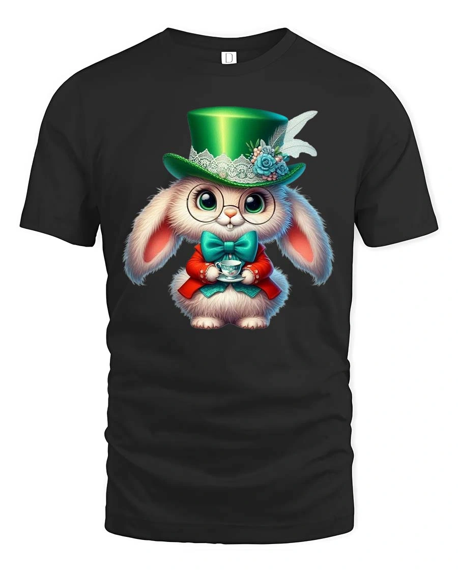 Cute Wonderland Rabbit With Tea Cup Fantasy Graphic Tee features an adorable and whimsical rabbit character inspired by magical storybook tea party scenes. The design shows a fluffy bunny dressed in a charming outfit with a stylish green top hat, bow tie, and round glasses while holding a delicate tea cup.
