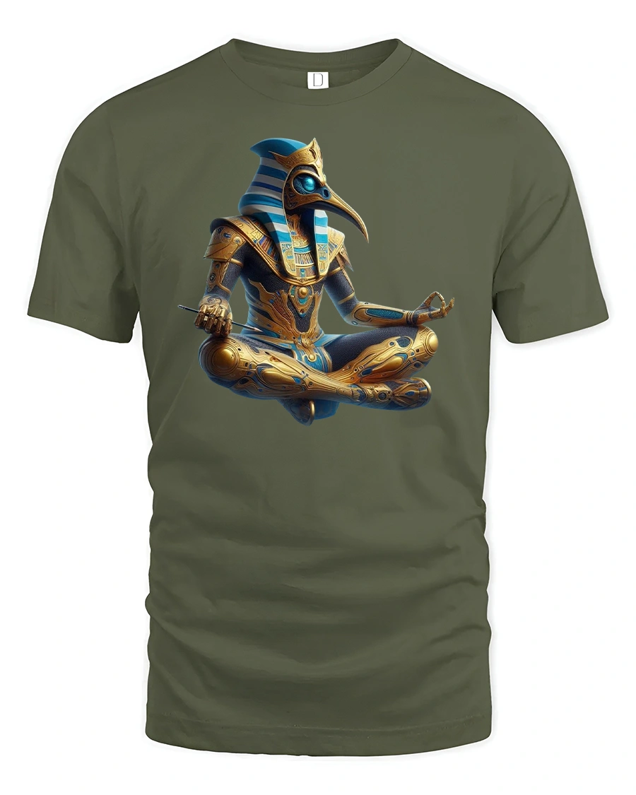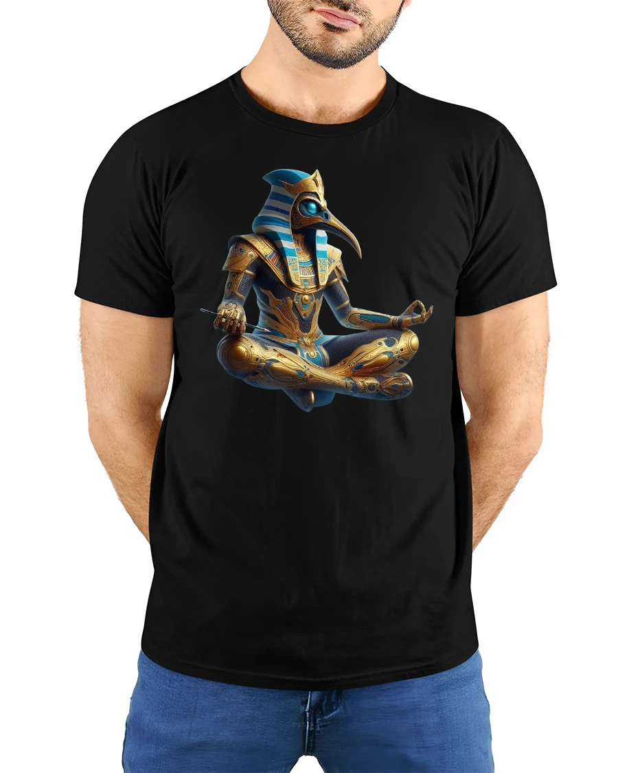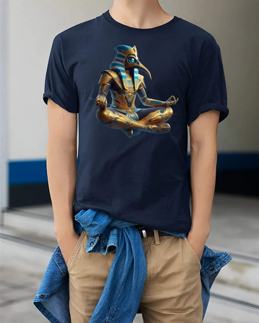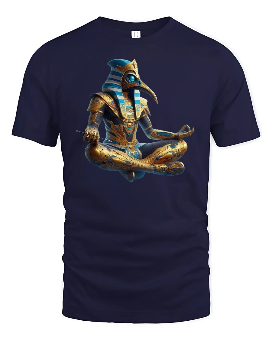 Featuring a robotic pharaoh in a meditative pose, this design merges the wisdom of ancient Egypt with the sleek aesthetics of the future.