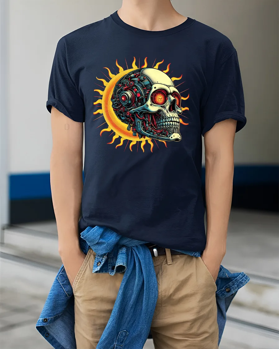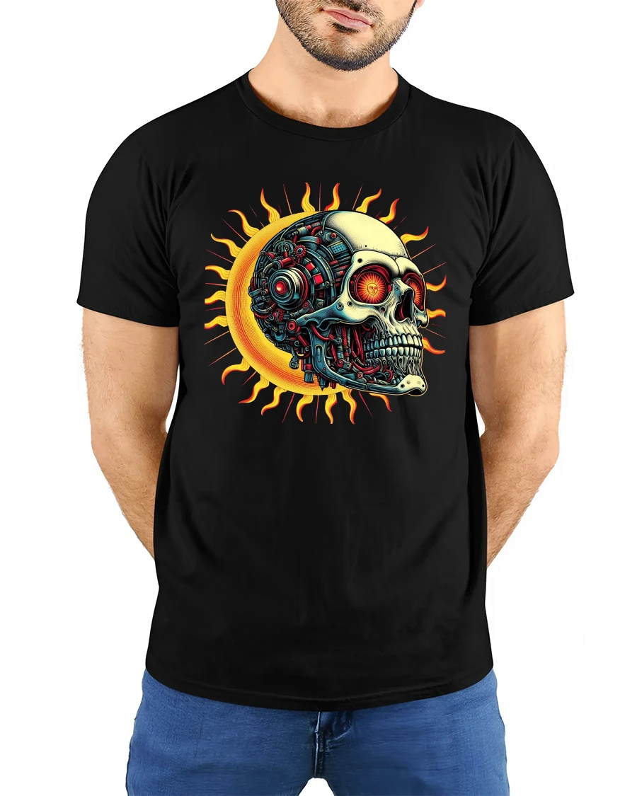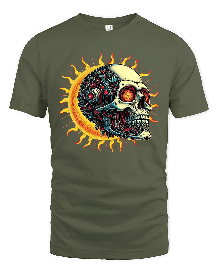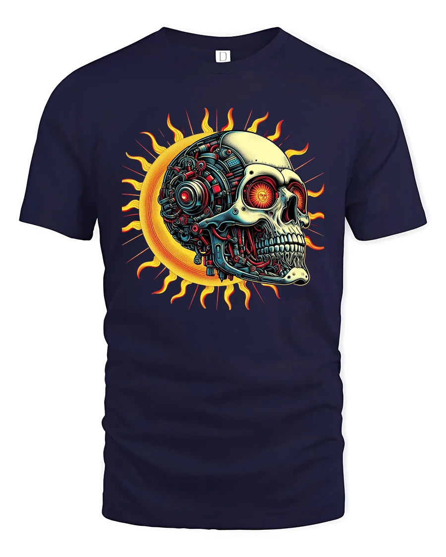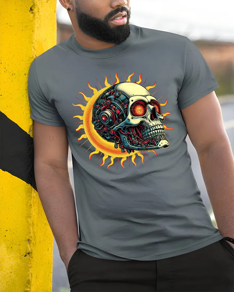 Cyber Skull Sun Graphic Tee With Futuristic Mechanical Art Style blends dark fantasy with advanced sci fi aesthetics in a striking visual design.