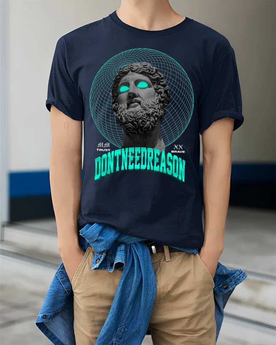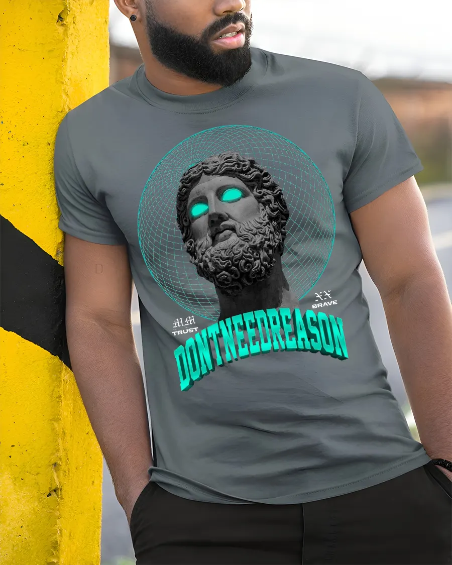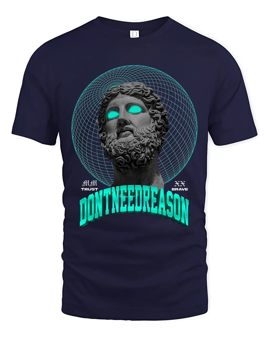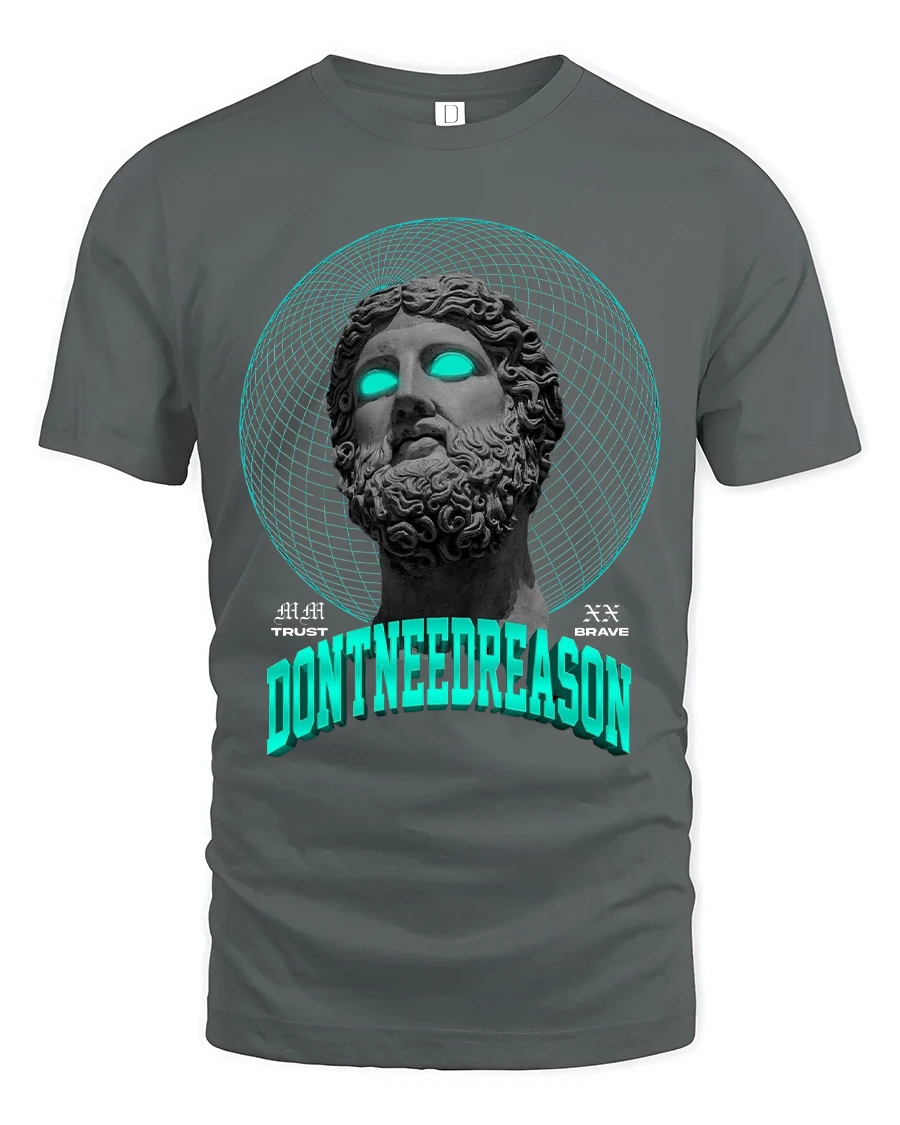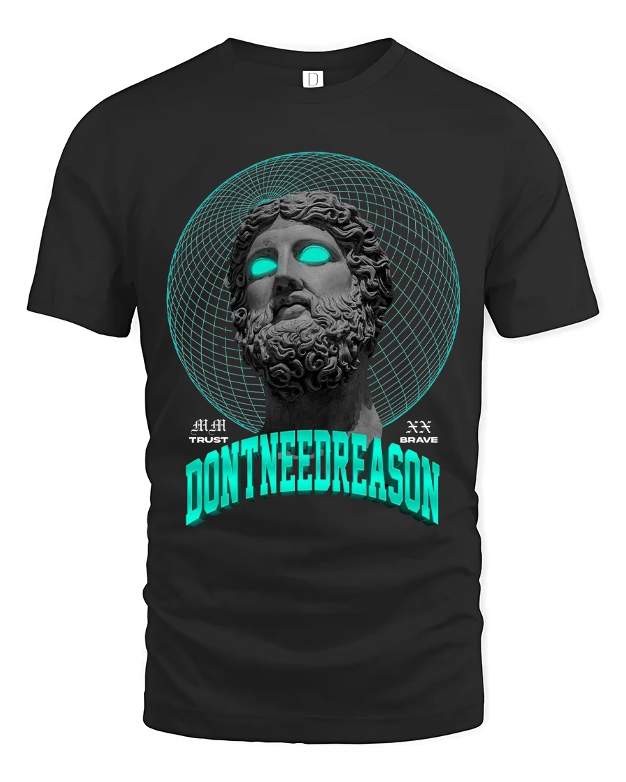 The Dont Need Reason Futuristic Greek Statue Art Graphic Tshirt Tee delivers a powerful blend of ancient philosophy and modern cyber aesthetics.