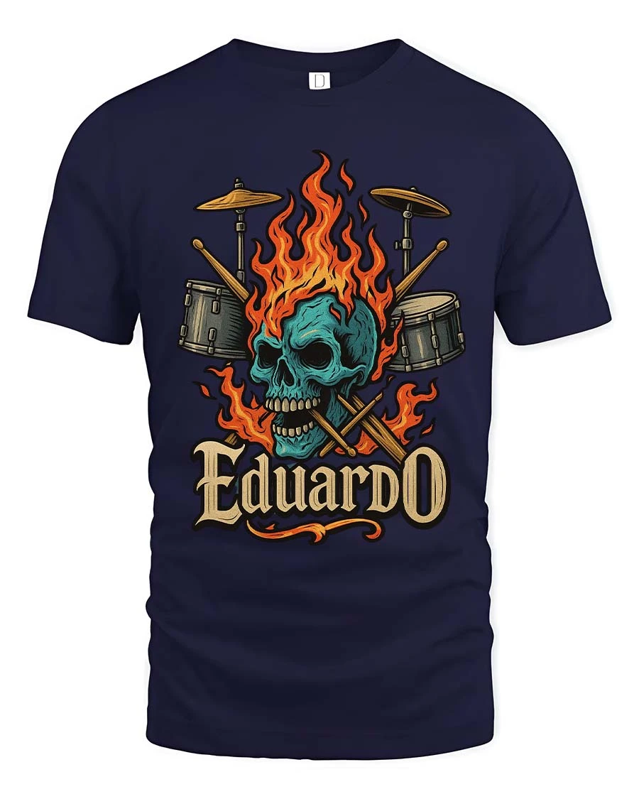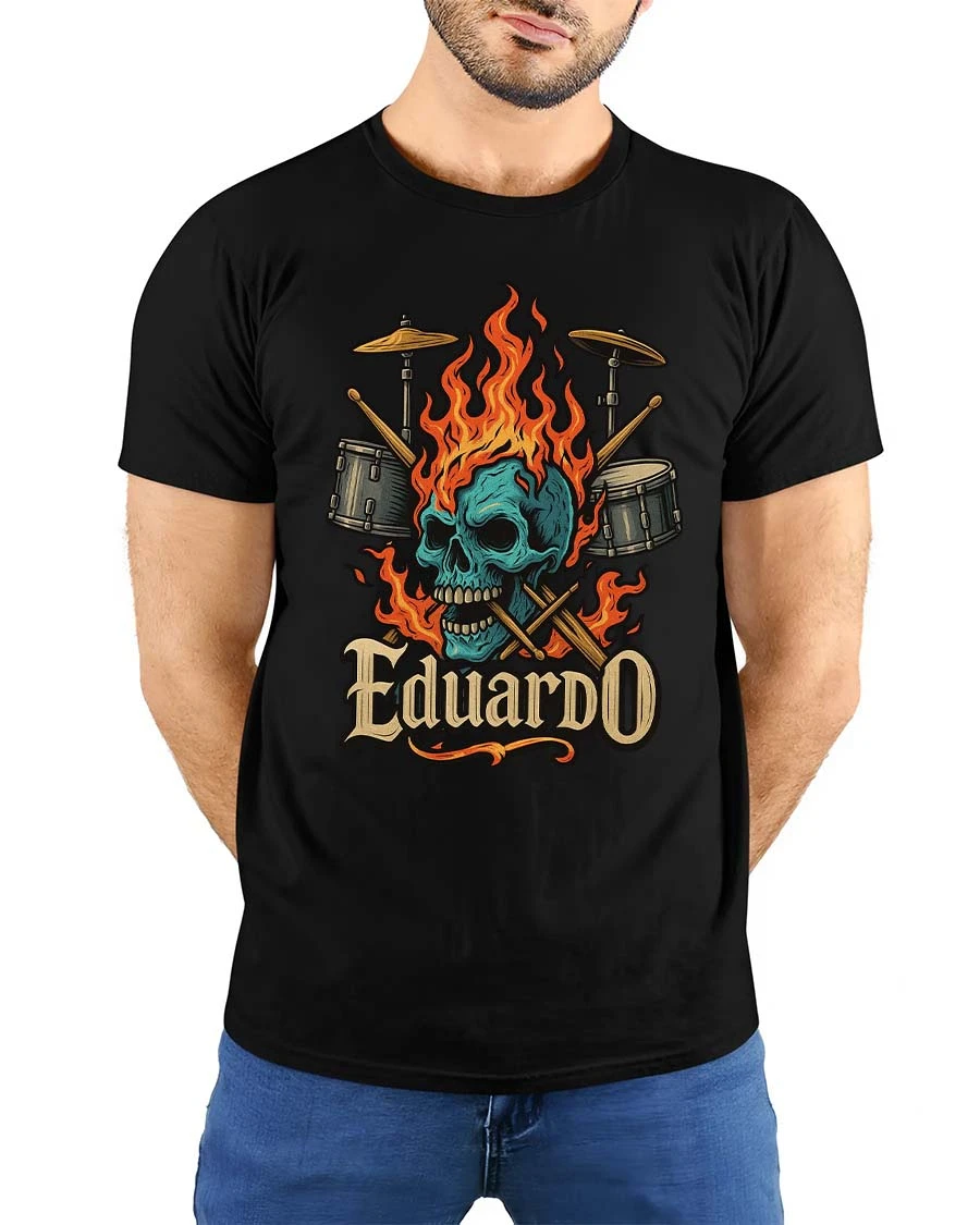 The design features a striking flaming skull surrounded by drum elements, paired with the name Eduardo in a powerful vintage inspired font.
