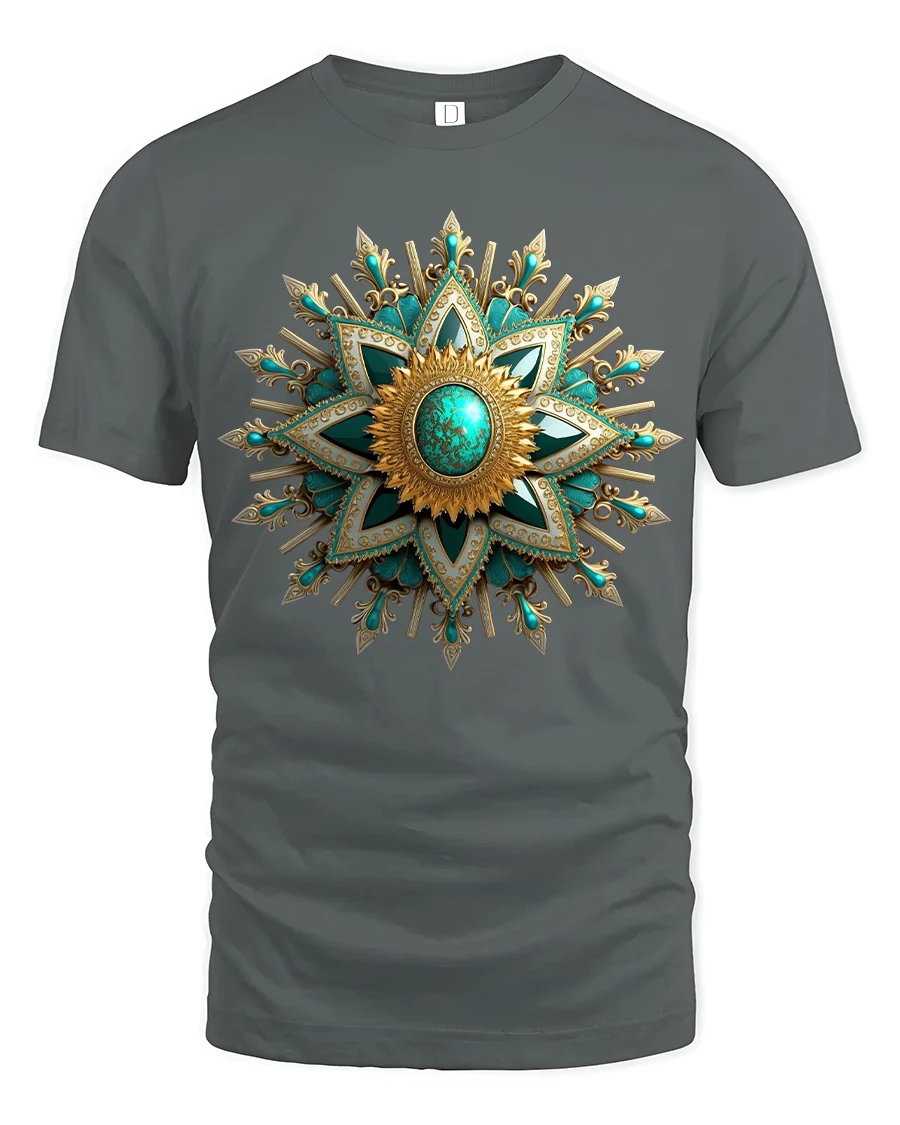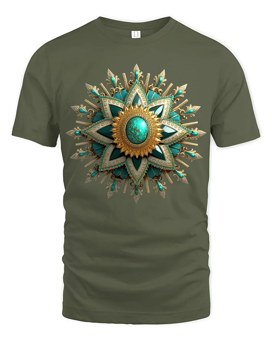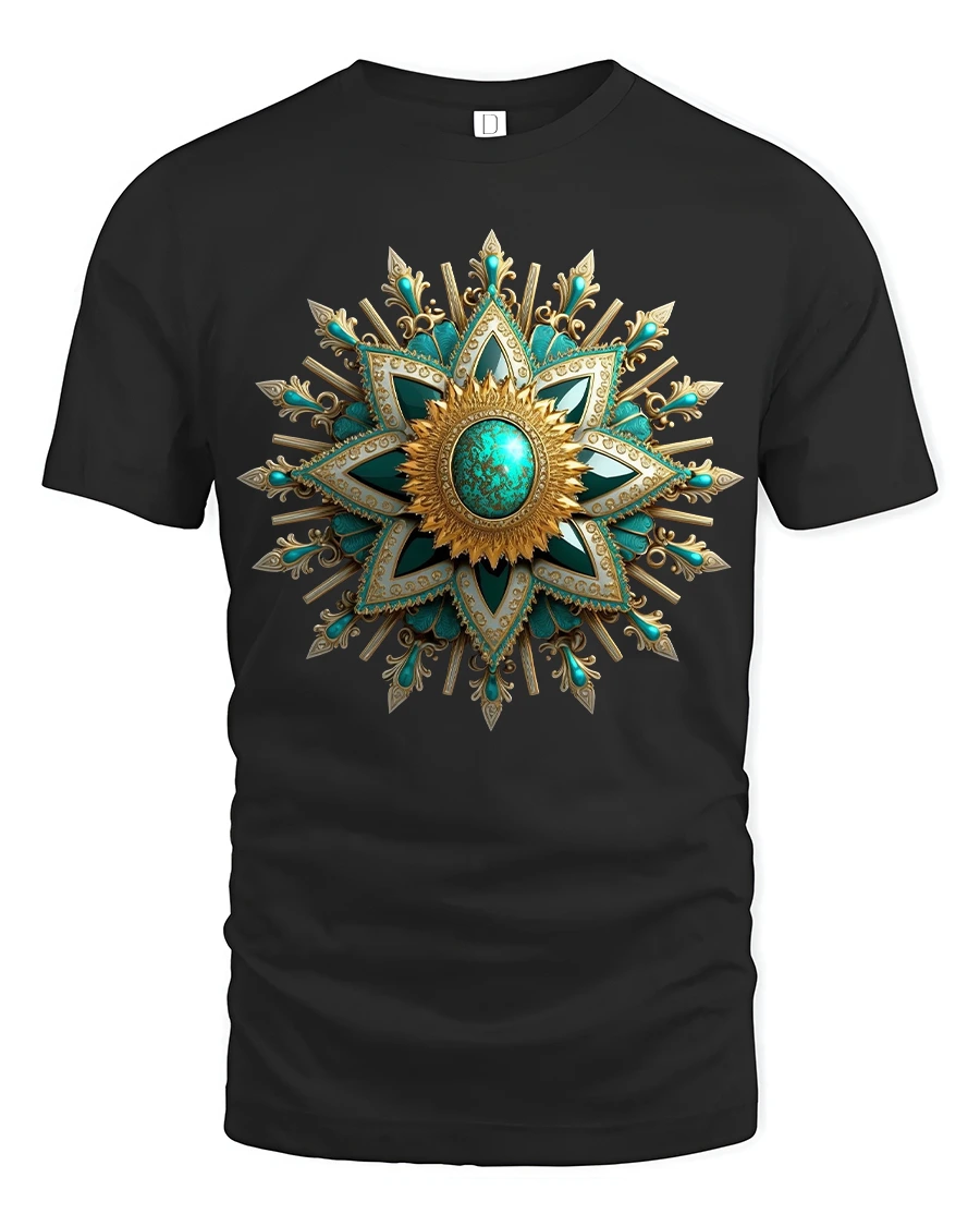 Elegant Turquoise Gold Mandala Star Tee with Ornate Art Design showcases a beautifully detailed mandala inspired star that radiates richness and sophistication. Featuring vibrant turquoise stones set within golden patterns, the artwork combines luxury and artistic symmetry in a striking and captivating design. Each layer of the star reveals meticulous detailing, from delicate filigree accents to bold geometric shapes that create an eye catching visual centerpiece.