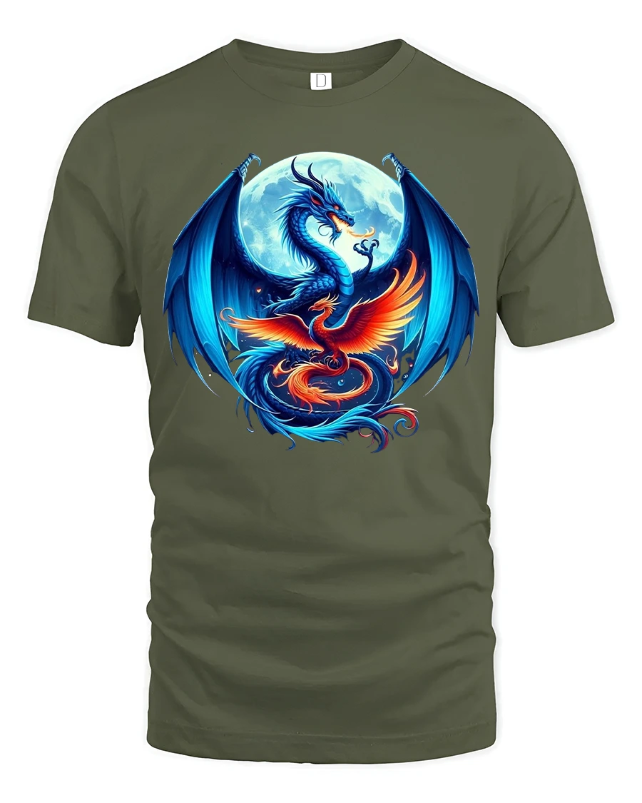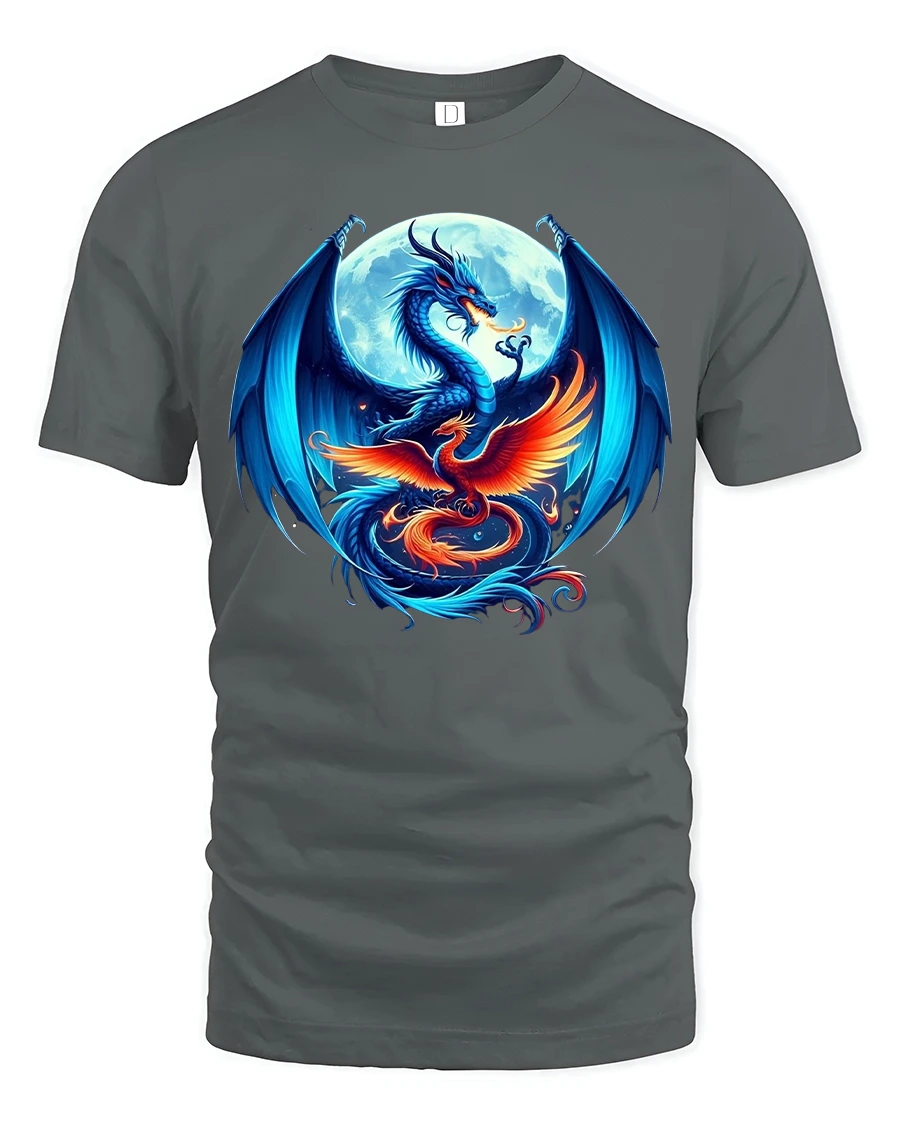 Epic Dragon And Phoenix Moon Fantasy Graphic T Shirt Tee showcases a powerful balance of fire and ice through a stunning mythical illustration.