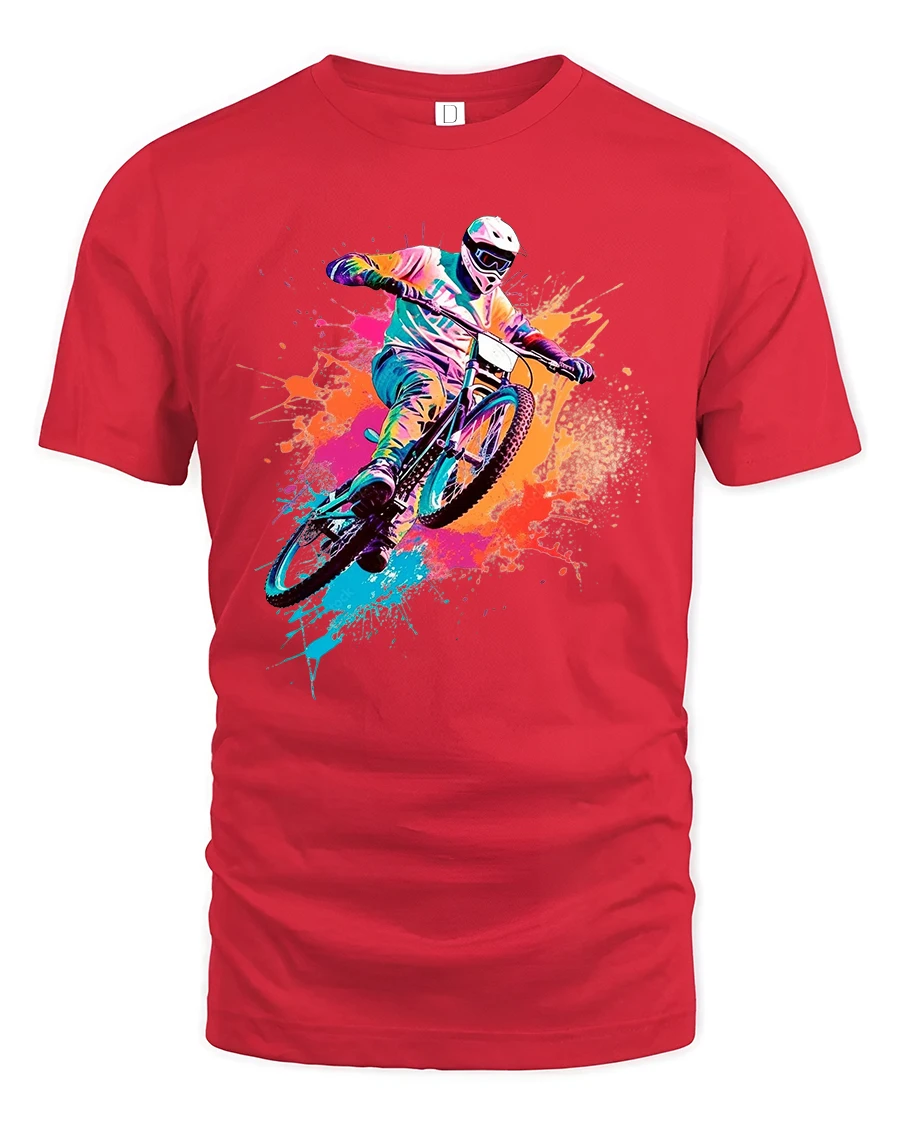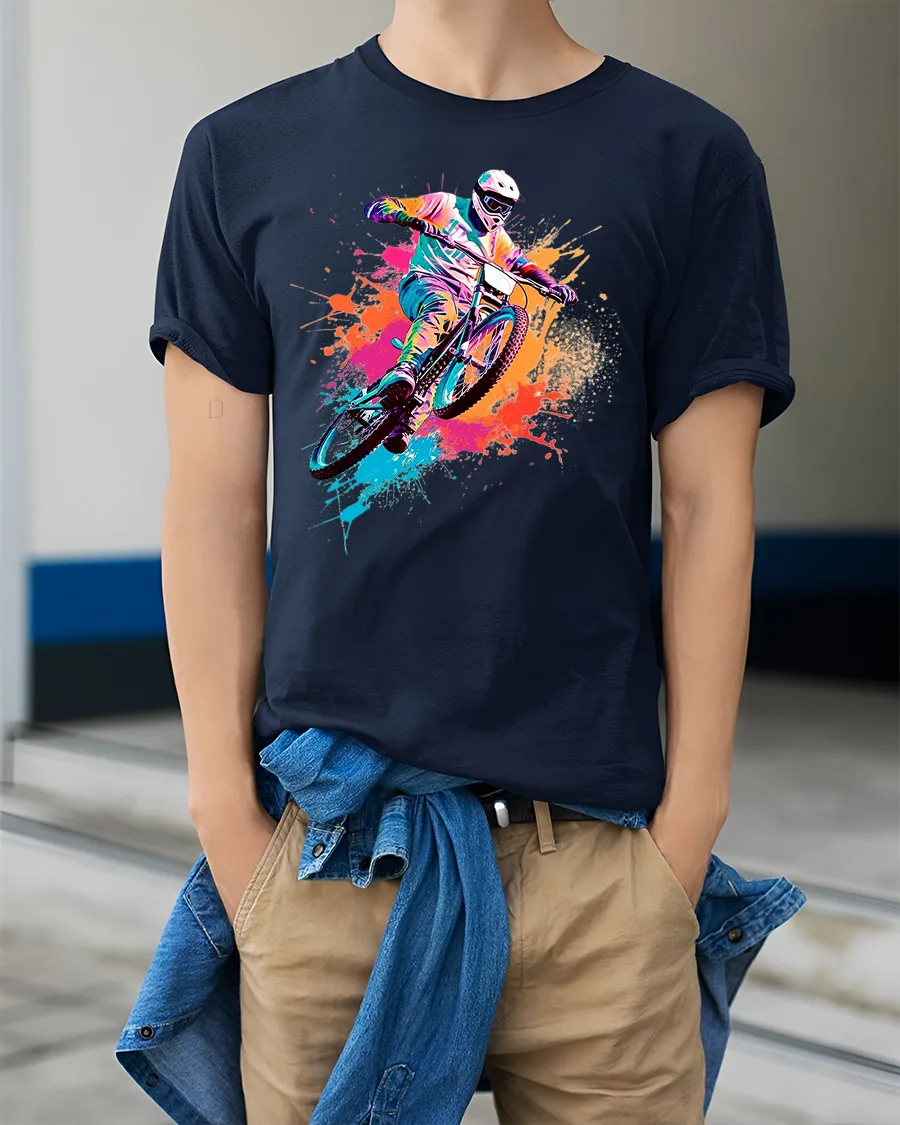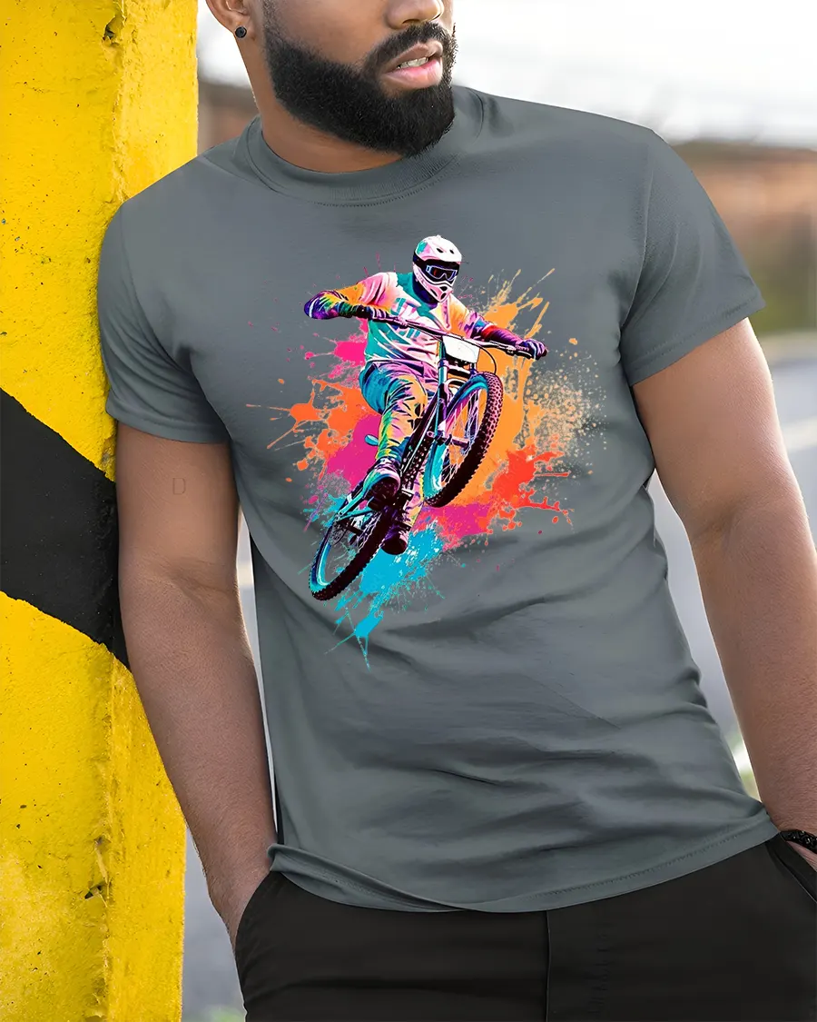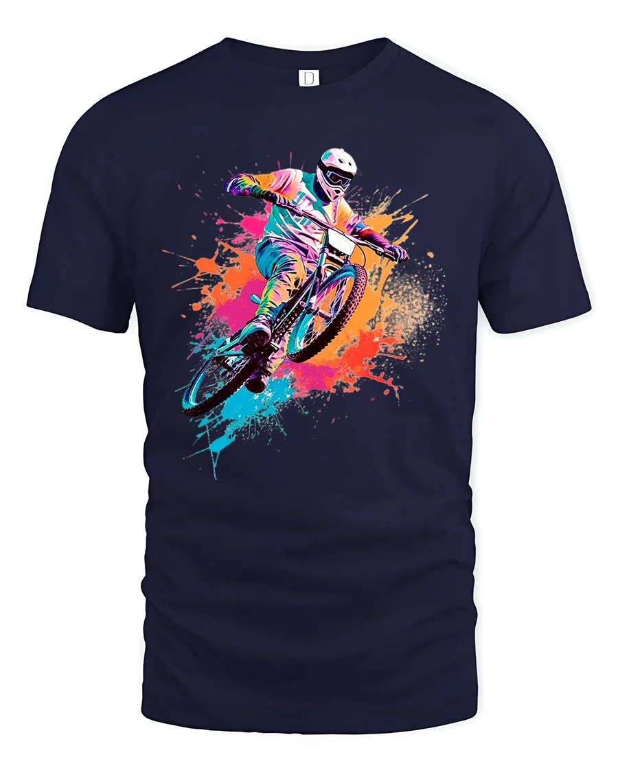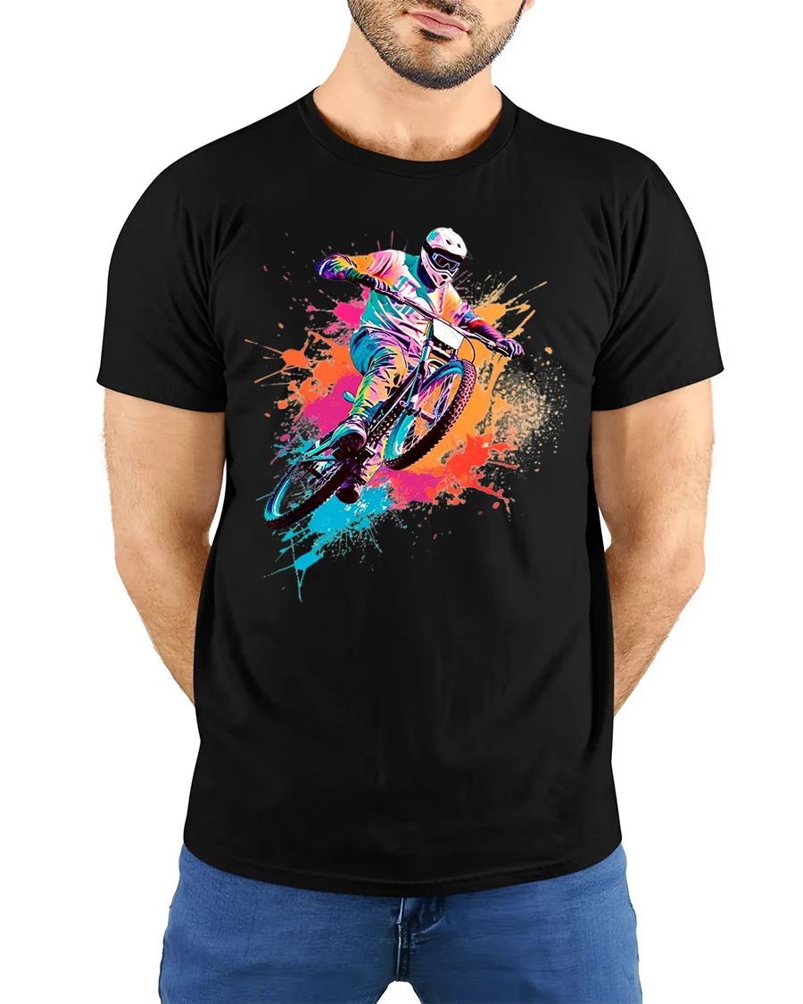 Made with soft and comfortable material, this tshirt offers a relaxed and breathable fit perfect for casual wear, outdoor adventures or showing off your passion for mountain biking. The high quality print ensures every detail of the rider, bike and paint splash pattern stays crisp and vibrant, keeping the artwork looking bold through repeated washes and long-term wear. Whether you love trail riding, downhill biking or simply enjoy eye-catching sports graphics, this tee brings the thrill of the sport to life.