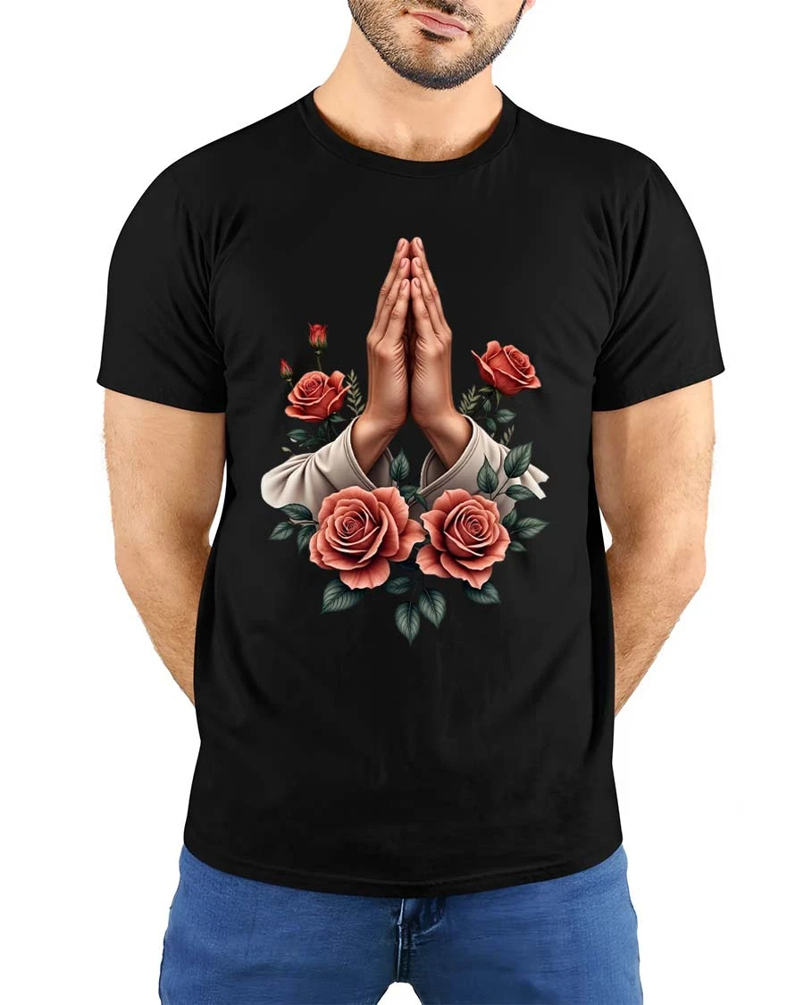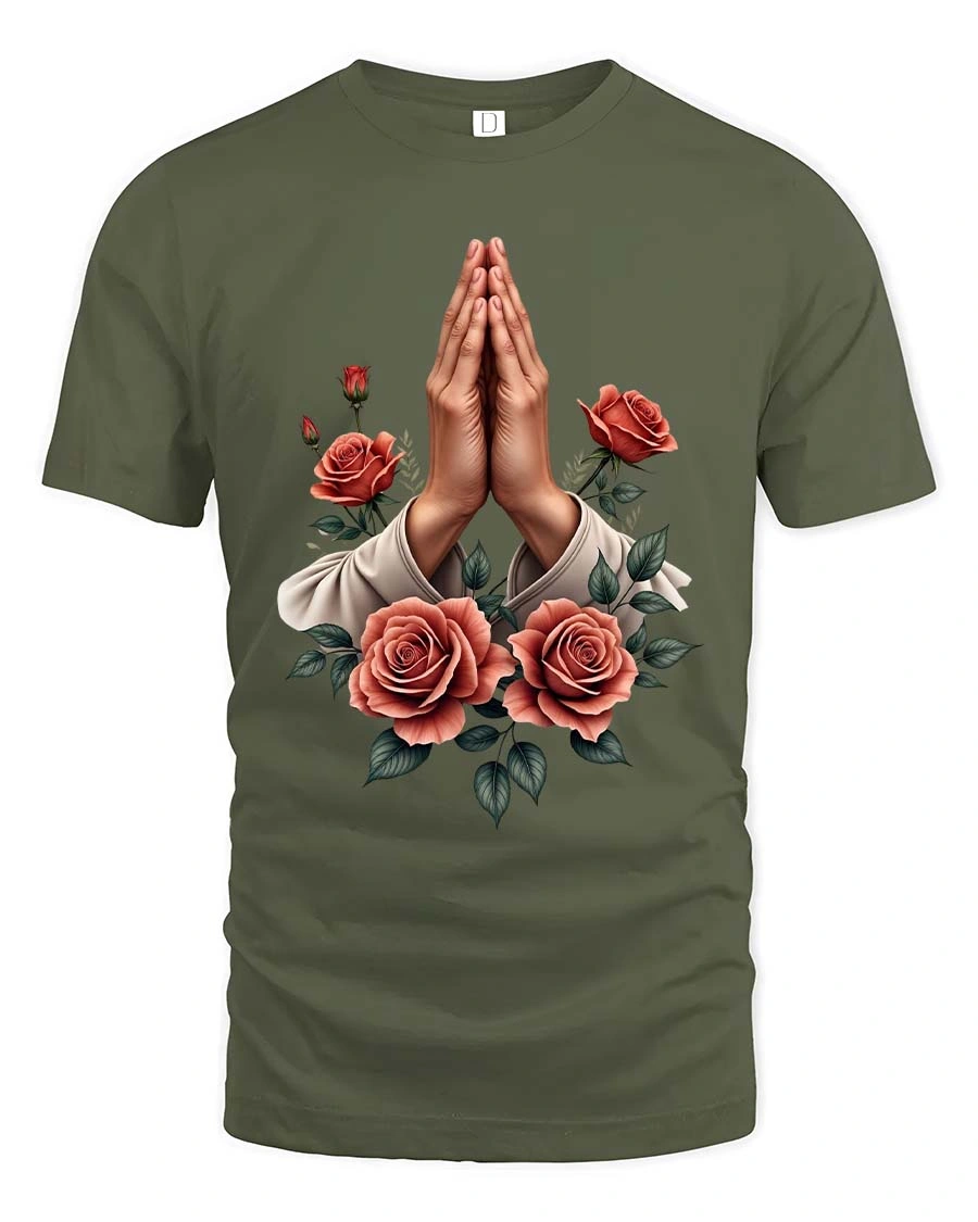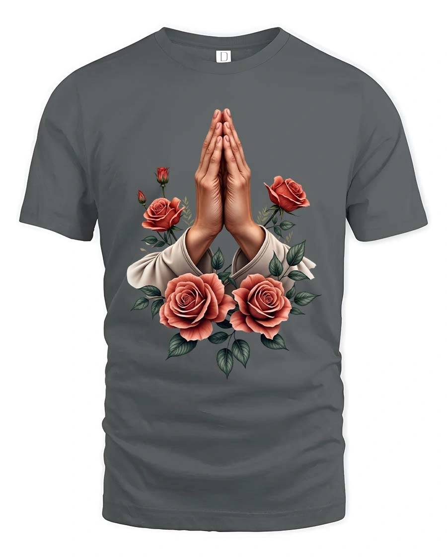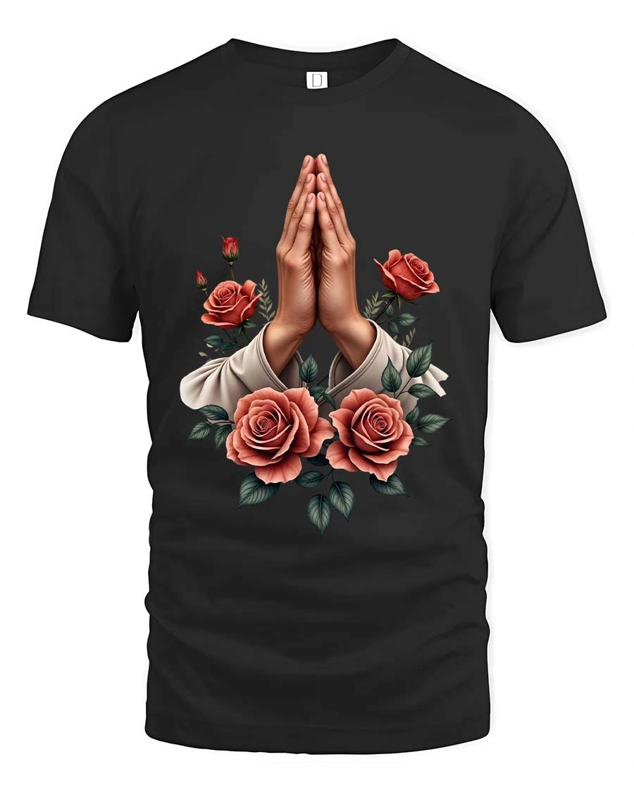 Faith Prayer Hands With Roses Spiritual Floral Graphic T Shirt features a peaceful and inspiring illustration that blends faith and natural beauty into a meaningful design.