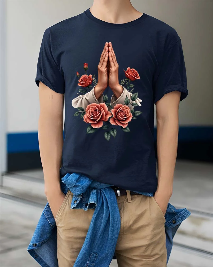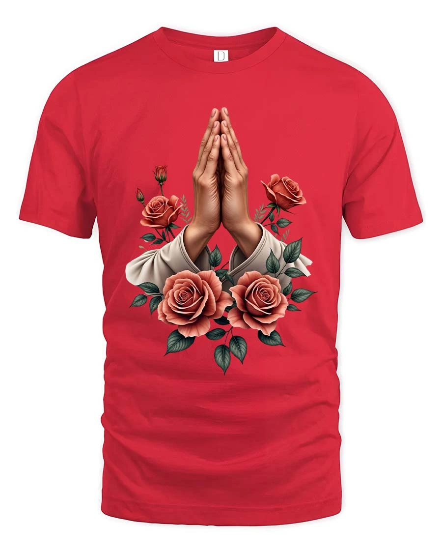 Faith Prayer Hands With Roses Spiritual Floral Graphic T Shirt is printed on soft comfortable fabric that feels smooth and breathable throughout the day.
