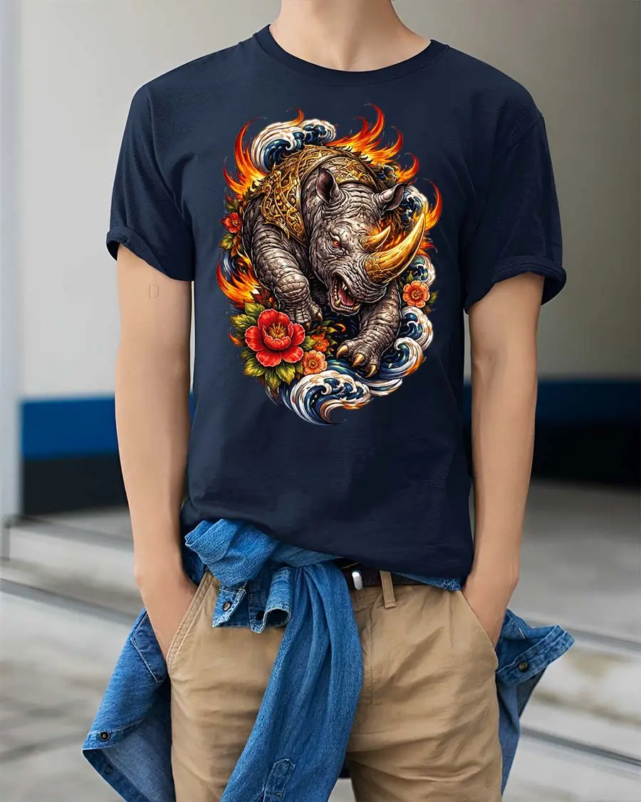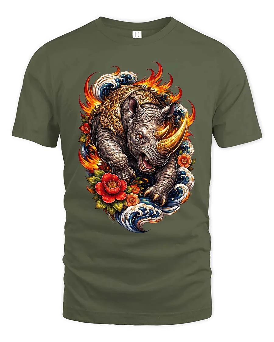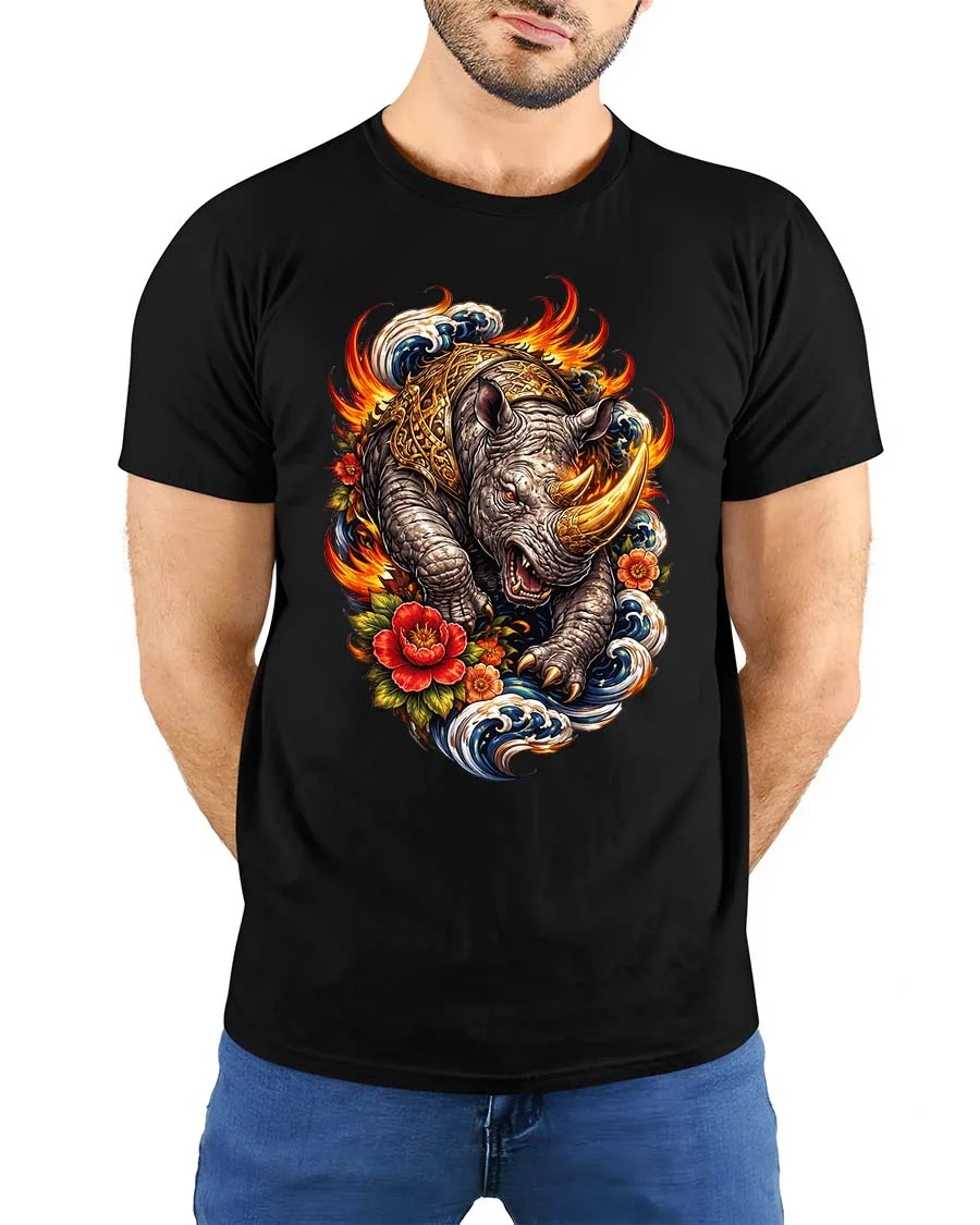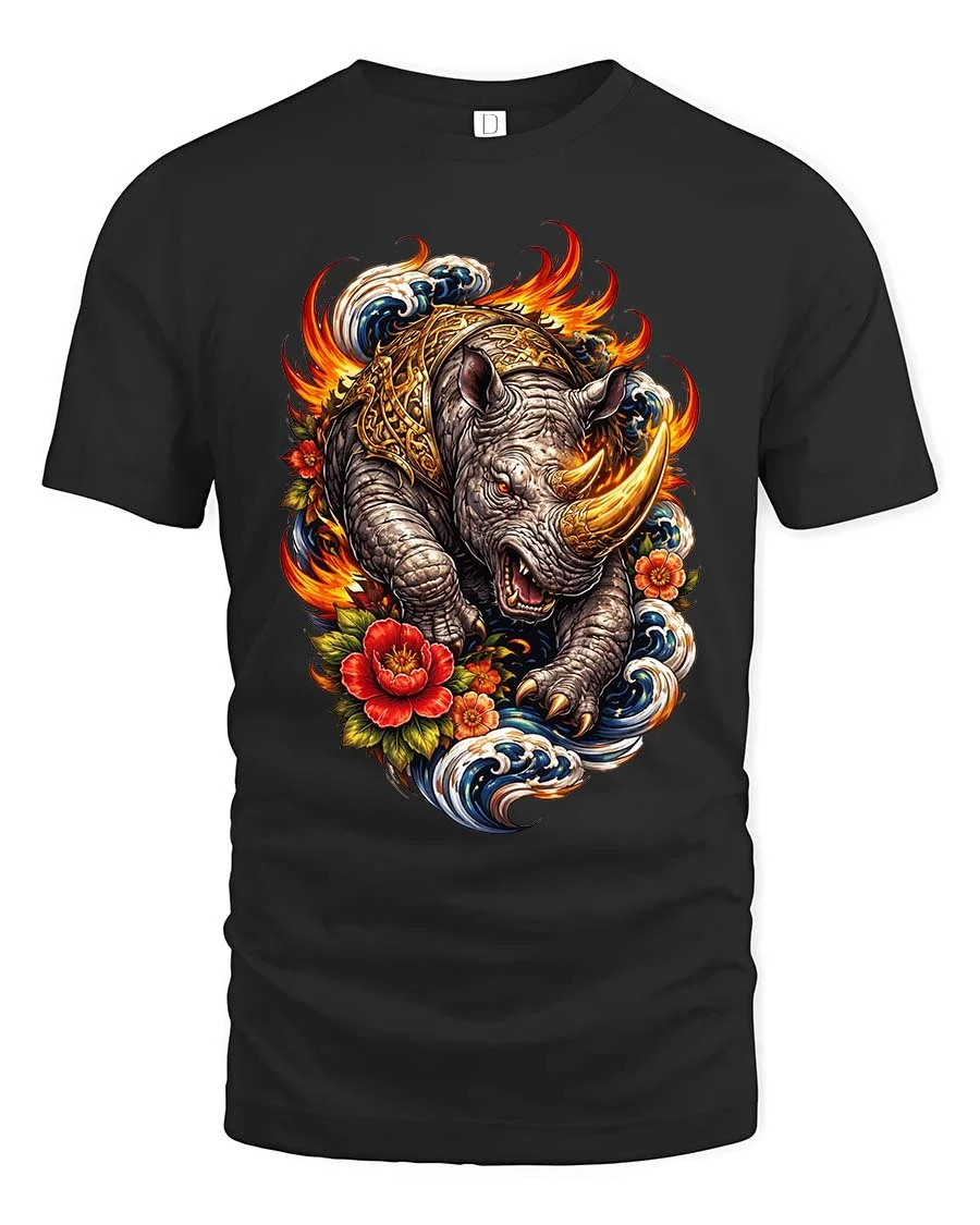 Fierce Rhino Flame Wave Japanese Art Style Graphic T Shirt captures strength and motion in a bold artistic design.