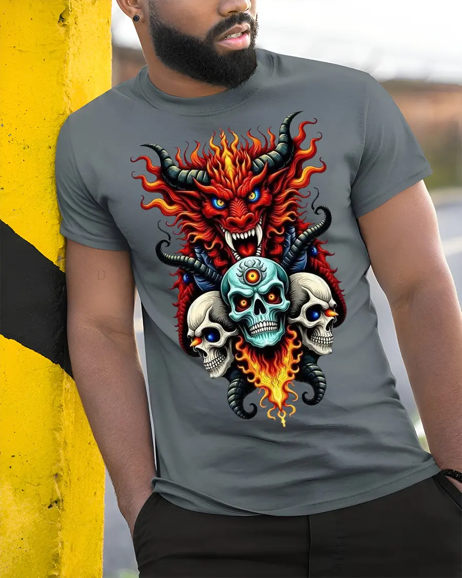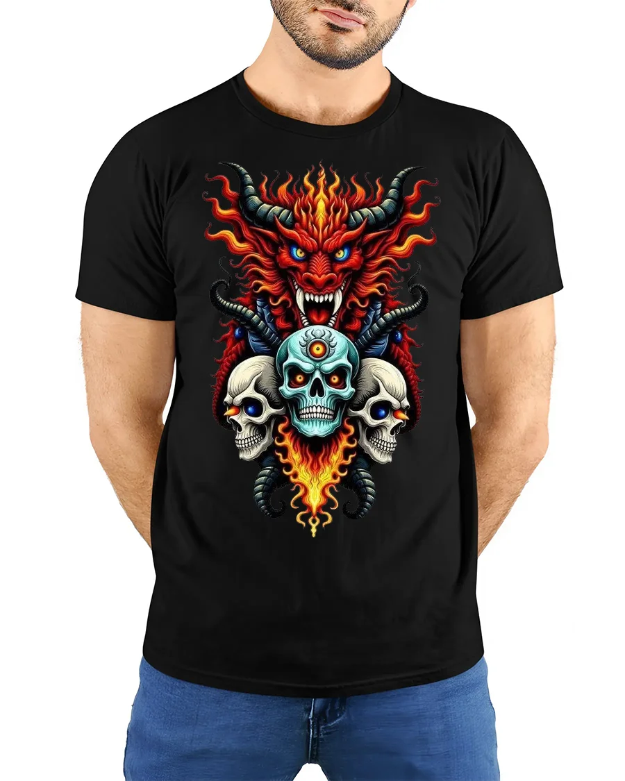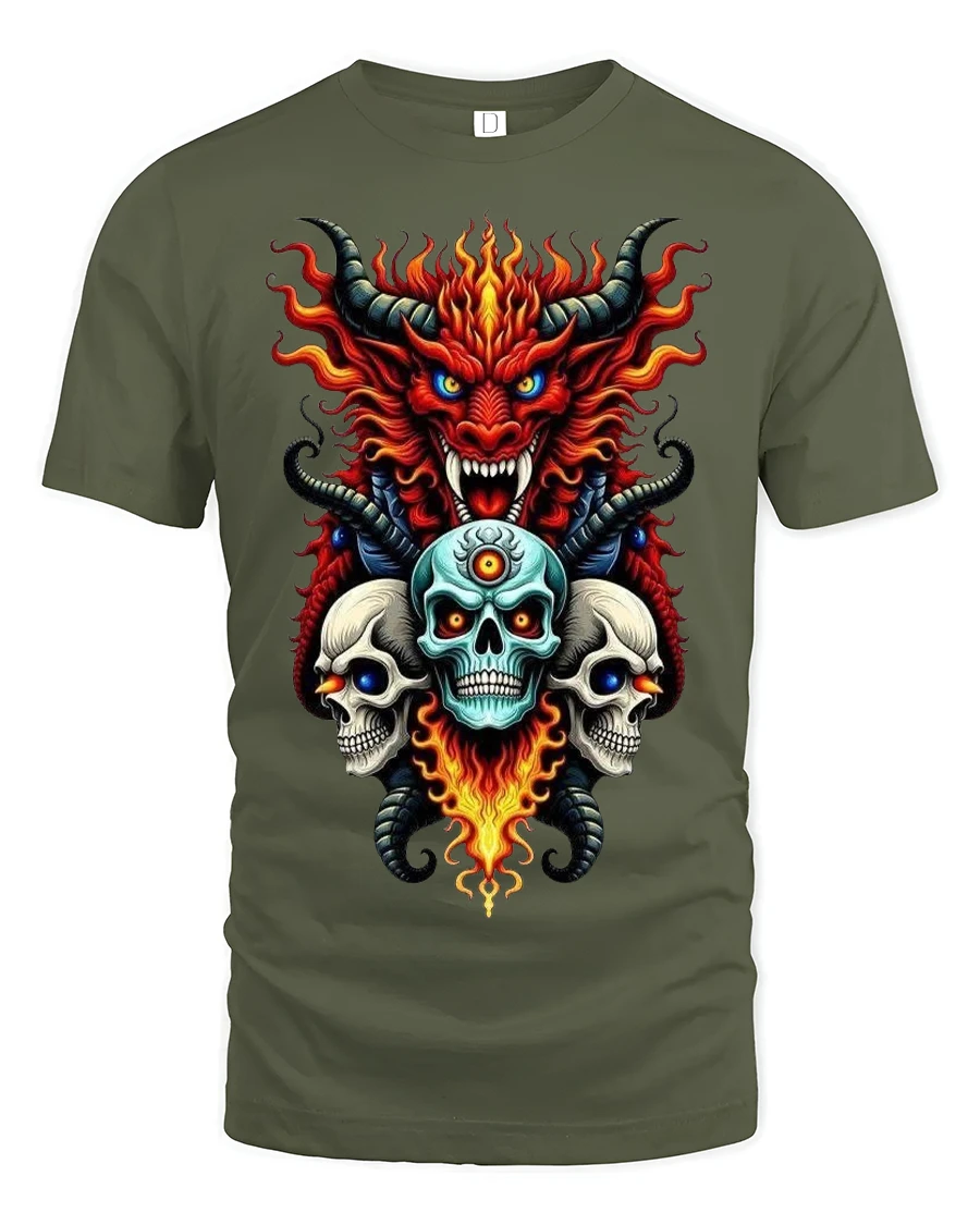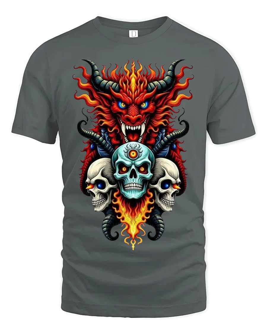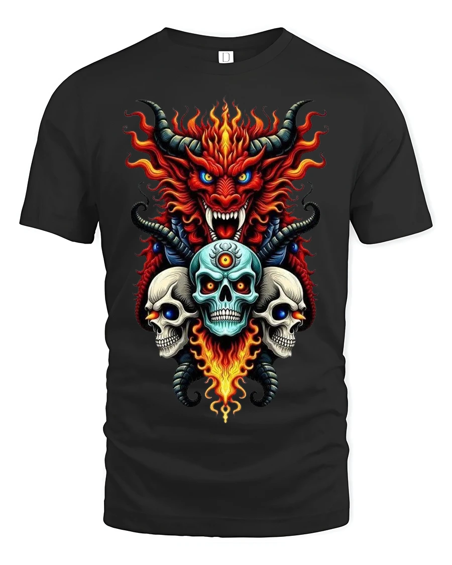 Fiery Dragon and Skulls Epic Fantasy Artwork T-Shirt Tee delivers an intense and visually stunning design perfect for fans of dark fantasy, gothic artwork, and mythical creatures. The graphic features a ferocious fire-breathing dragon surrounded by three detailed skulls, each glowing with powerful energy. Vibrant flames, bold colors, and sharp details make this design a dramatic standout piece for anyone who loves fierce and imaginative artwork.