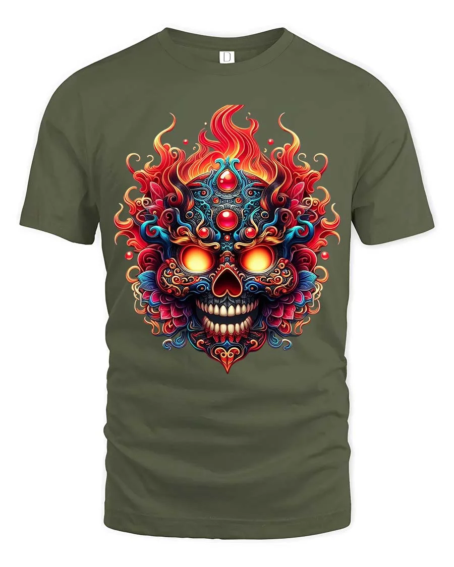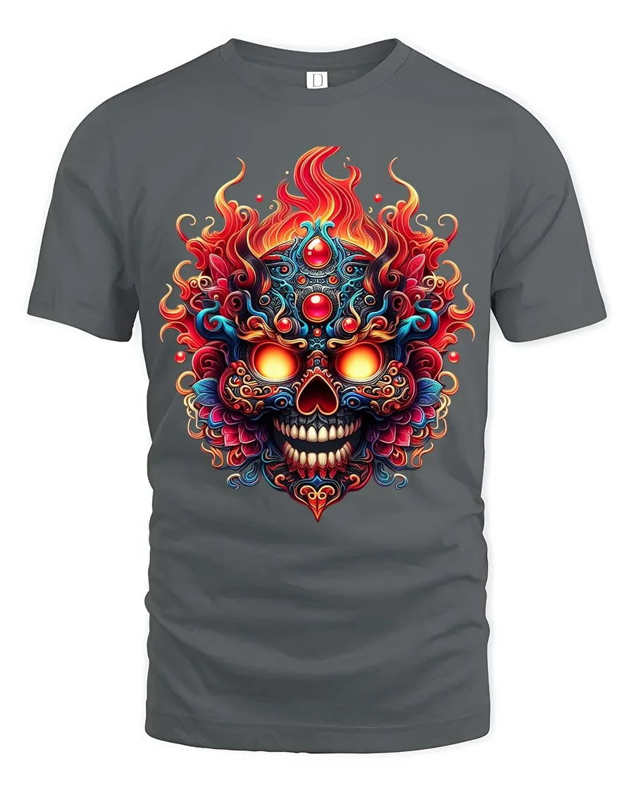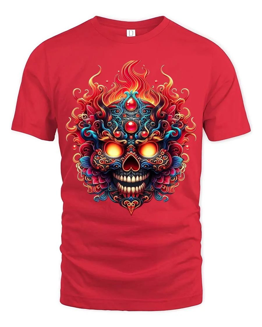 Fiery Ornate Skull T Shirt Colorful Gothic Flame Graphic Tee delivers a bold fusion of dark art and vibrant color in a striking design.