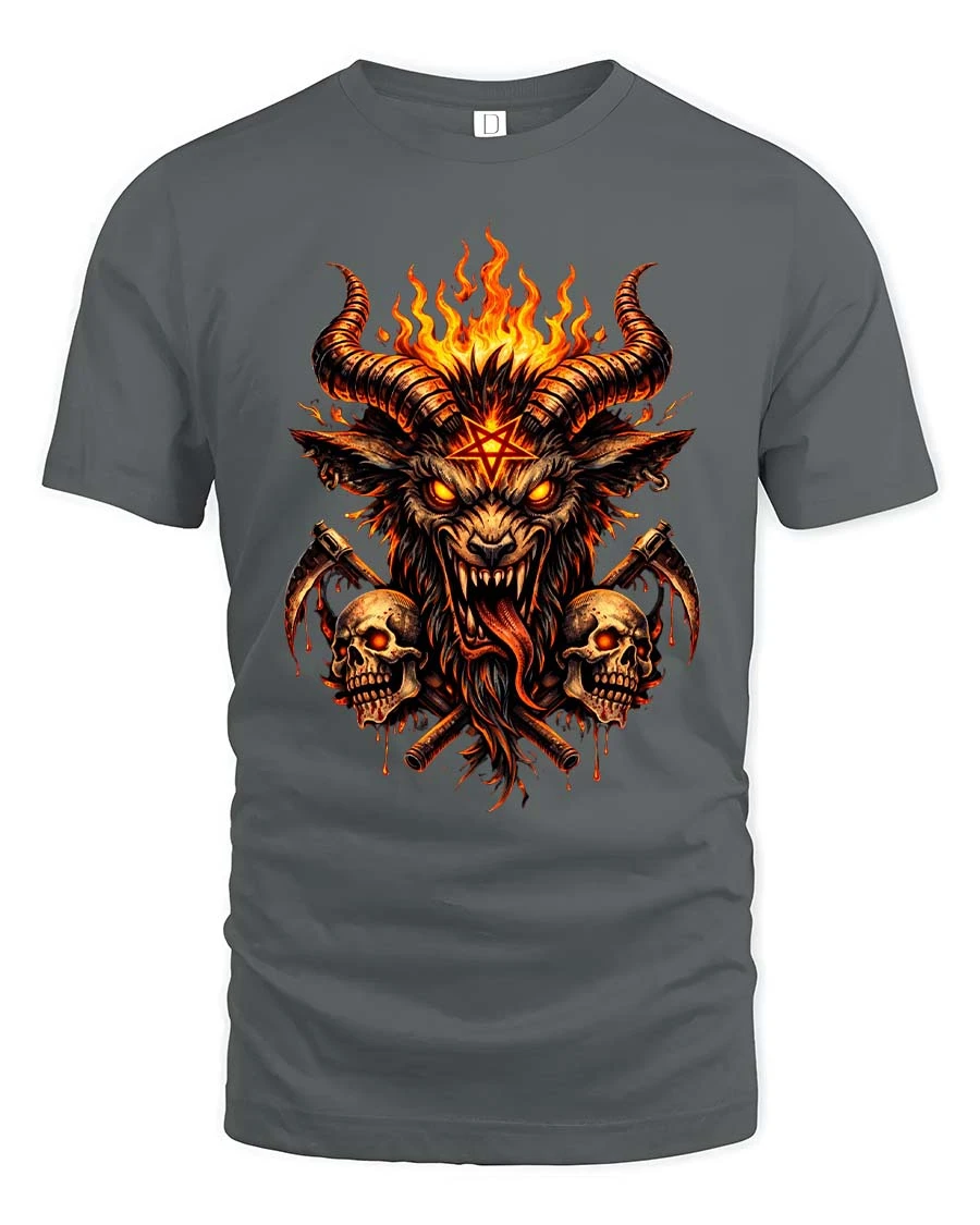 This graphic tee delivers a strong visual statement inspired by gothic culture, dark fantasy, and underground metal art. The detailed demon goat design gives the shirt a powerful rebellious personality that pairs perfectly with streetwear, concert outfits, or edgy everyday style. The fiery skull elements and intense expression make the artwork feel alive and dramatic.