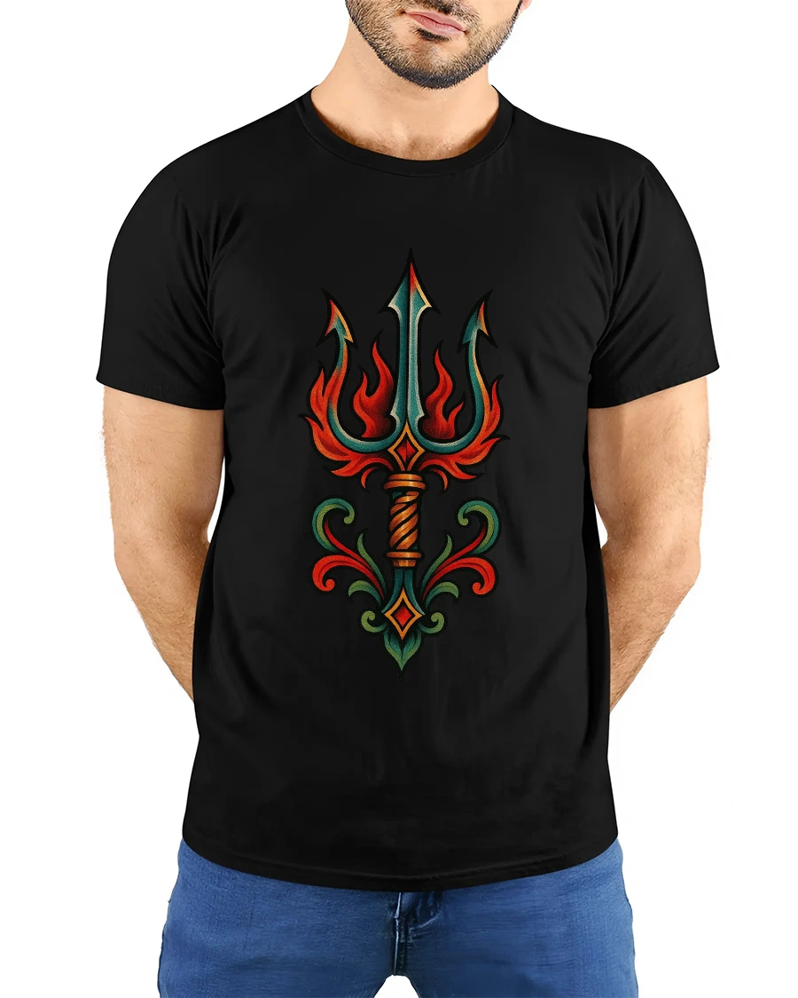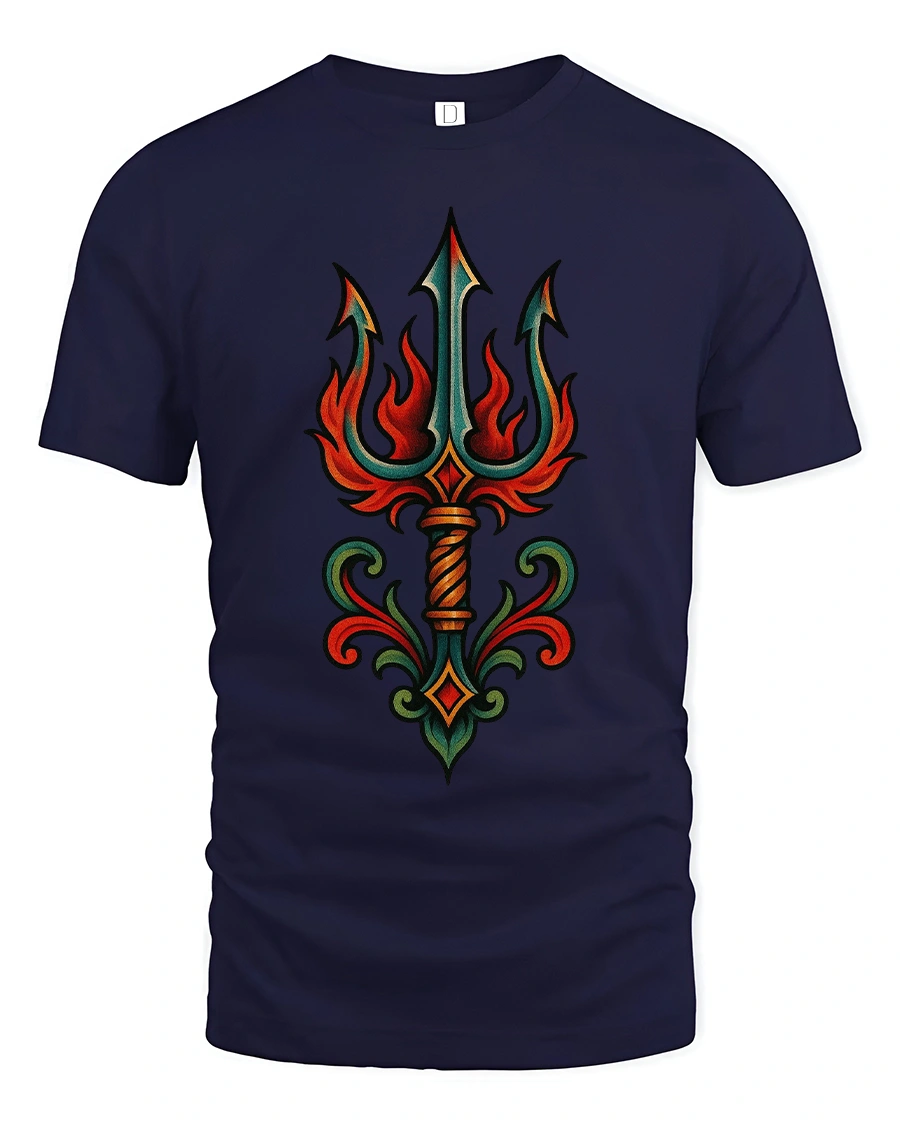 Flaming Trident Symbol T Shirt With Mythic Power Art delivers a striking visual inspired by ancient legends and powerful symbolism.
