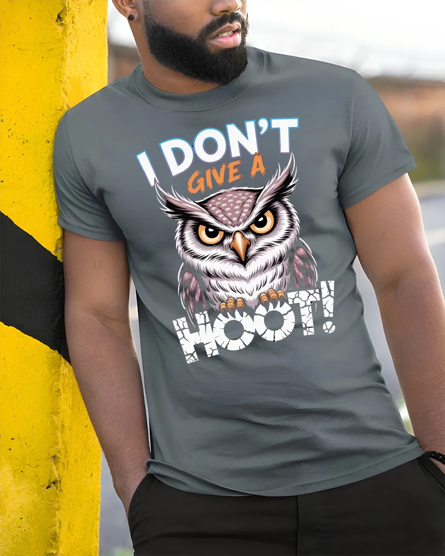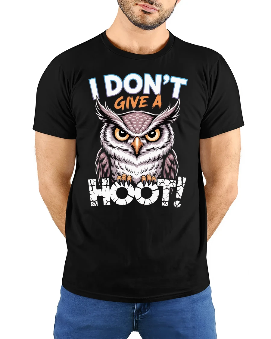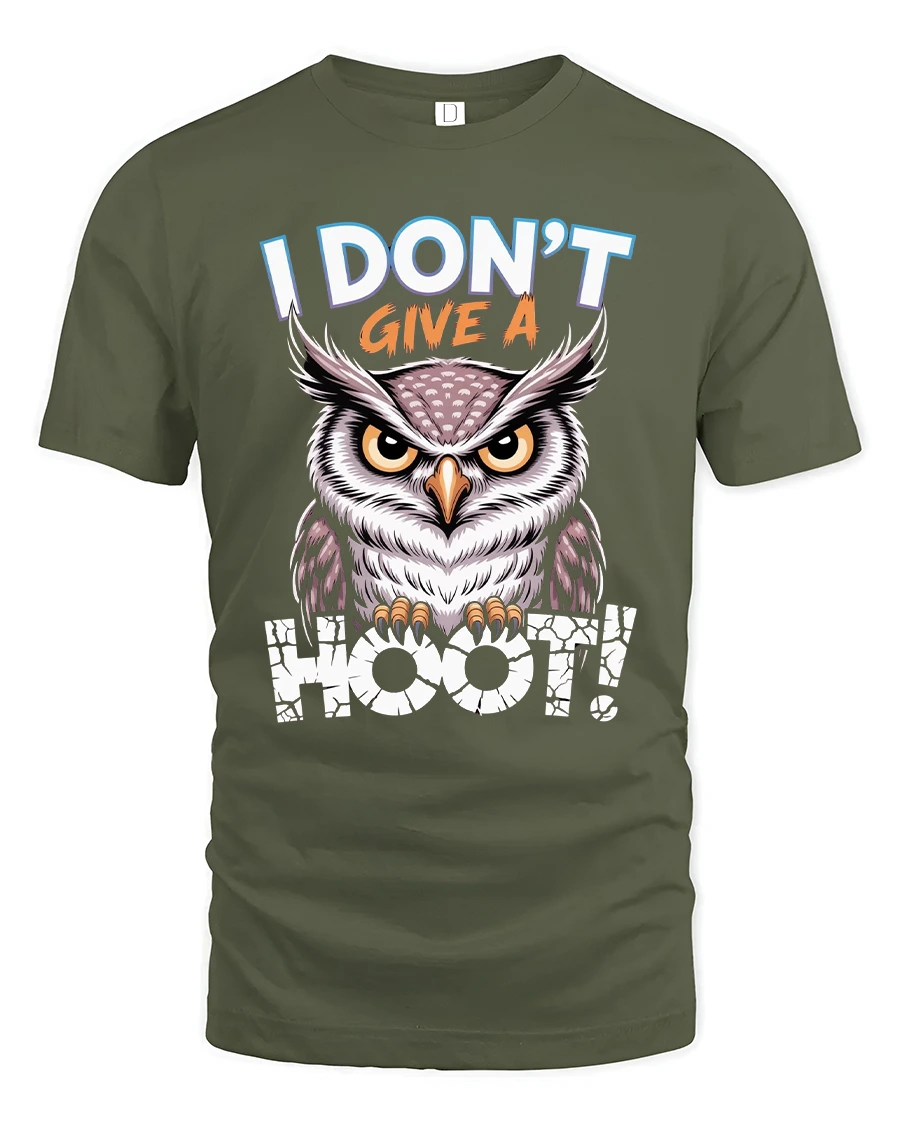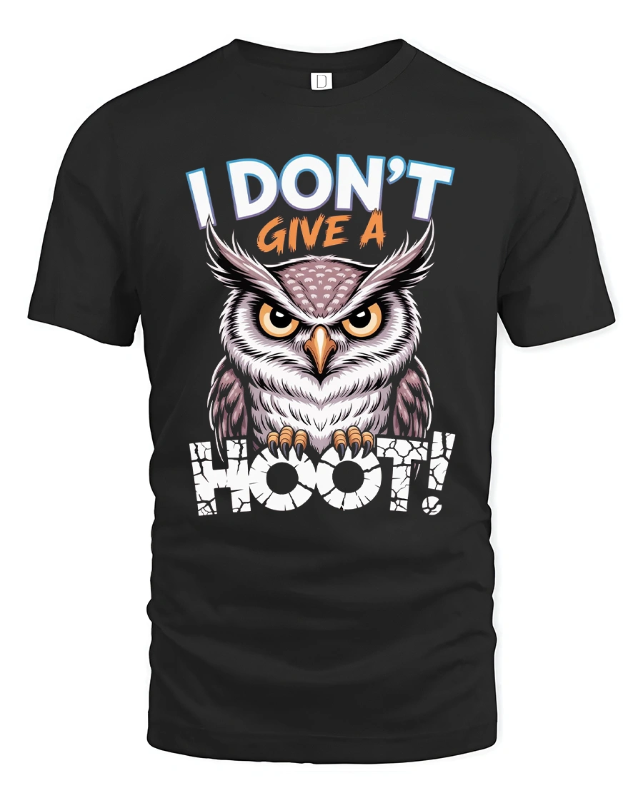 The artwork features a fierce wide eyed owl paired with the confident phrase I dont give a hoot creating a funny and relatable statement.
