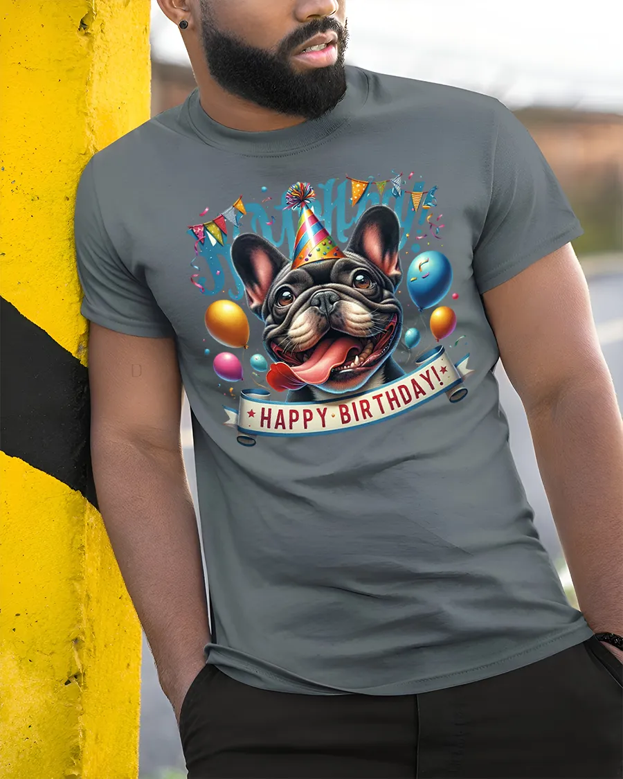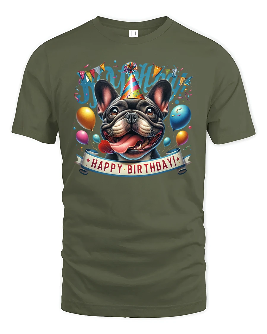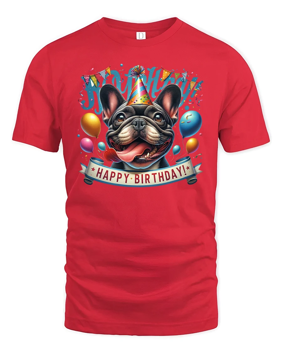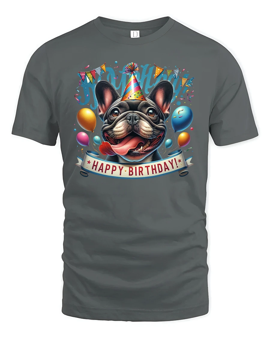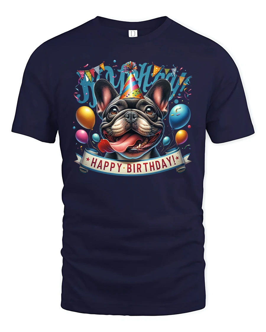 Featuring an adorable French Bulldog wearing a colorful party hat surrounded by balloons and confetti, this shirt brings pure joy and festive energy to any occasion. The bold “Happy Birthday” banner adds the perfect touch for birthday celebrations, parties, or fun gatherings.