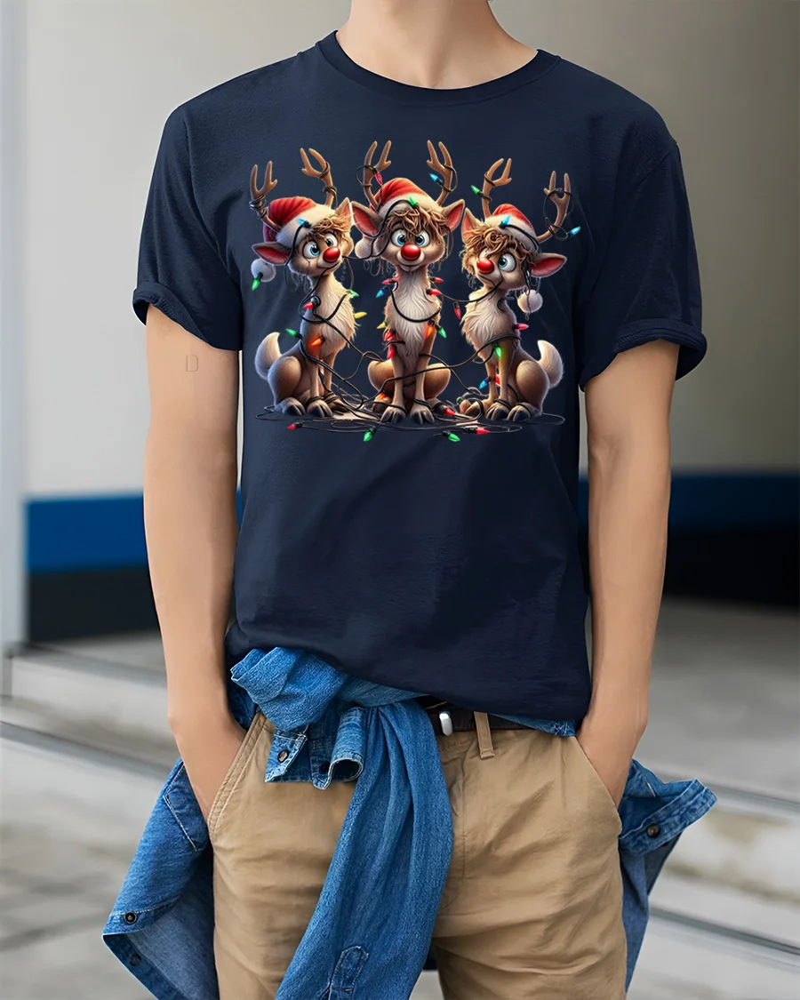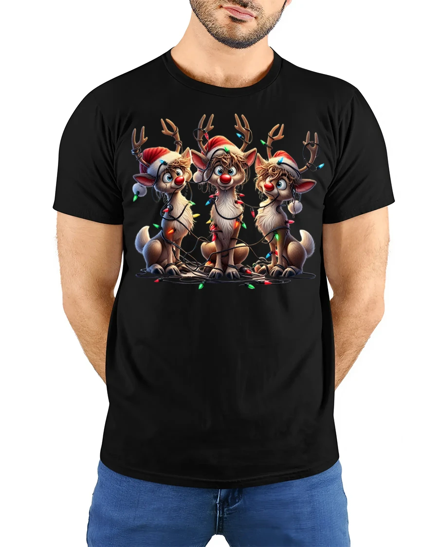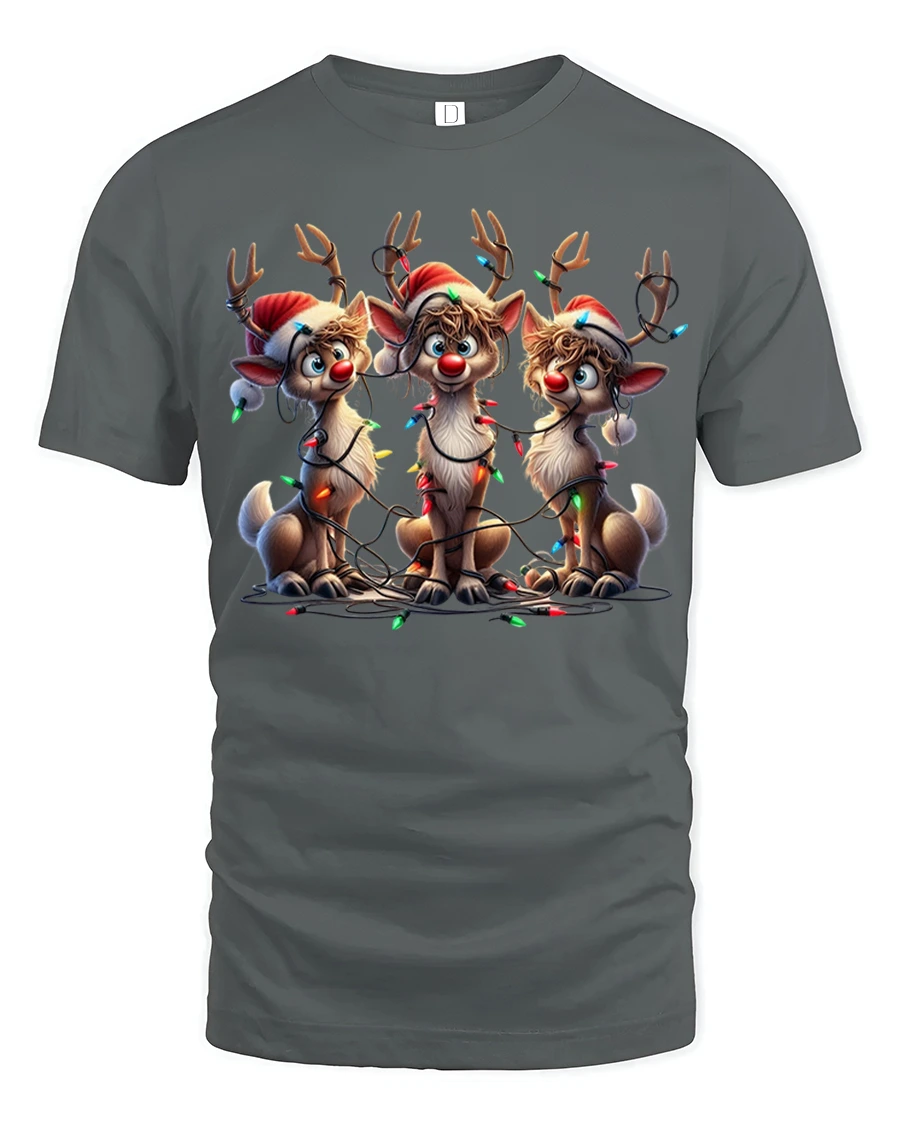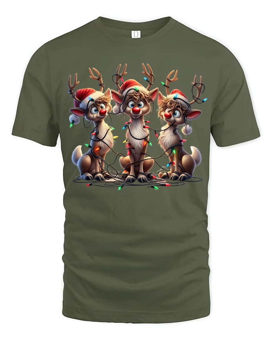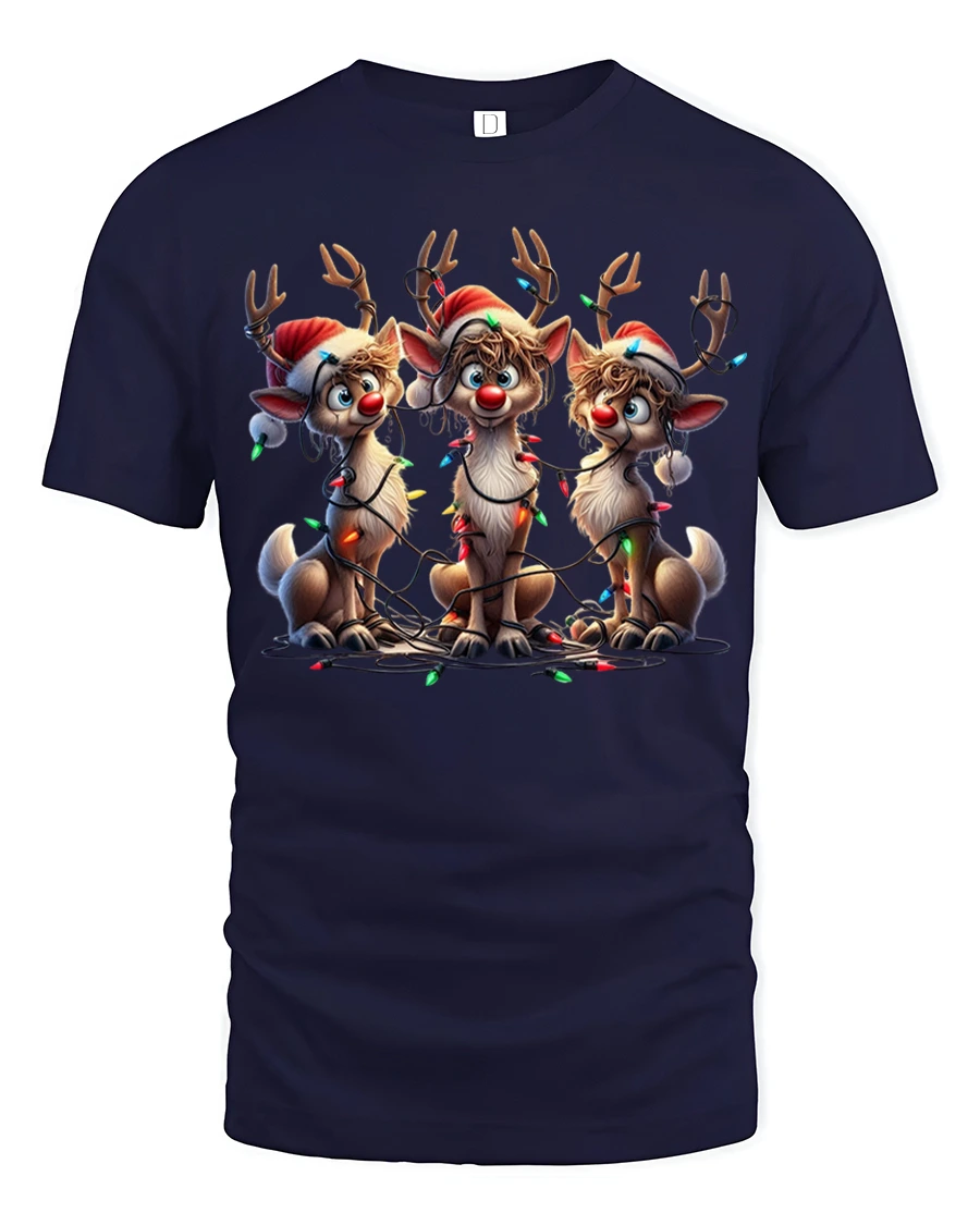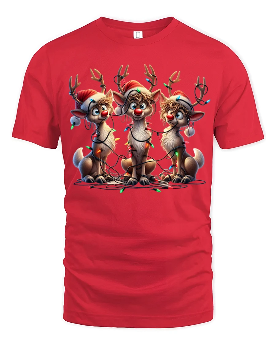 Funny Christmas Reindeer Trio Lights Festive Graphic Tee brings joyful holiday charm with an adorable illustrated design full of personality. Three playful reindeer wearing Santa hats stand together tangled in colorful holiday lights, creating a fun and heartwarming scene that instantly spreads festive cheer. The expressive faces and bright details make this design eye catching and perfect for celebrating the holiday season with humor and warmth.