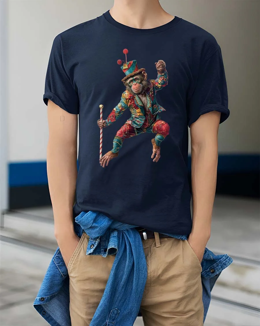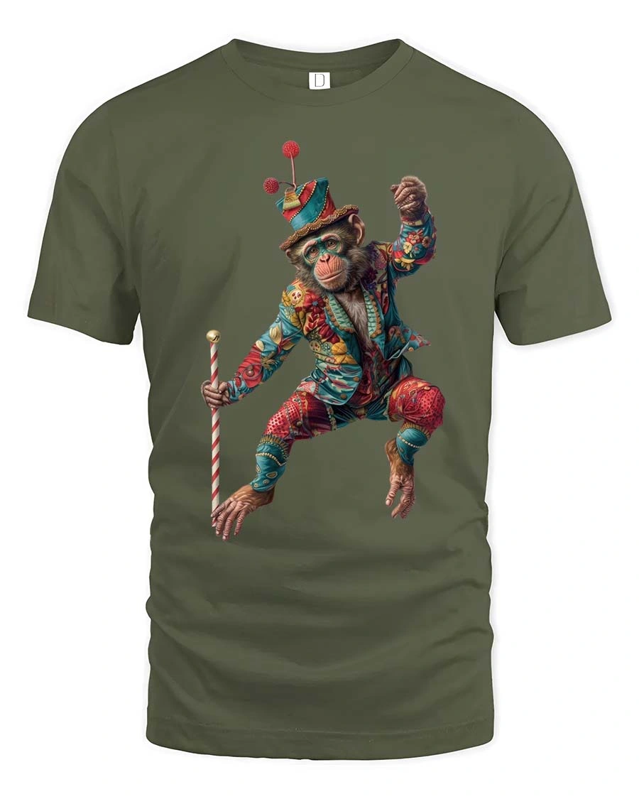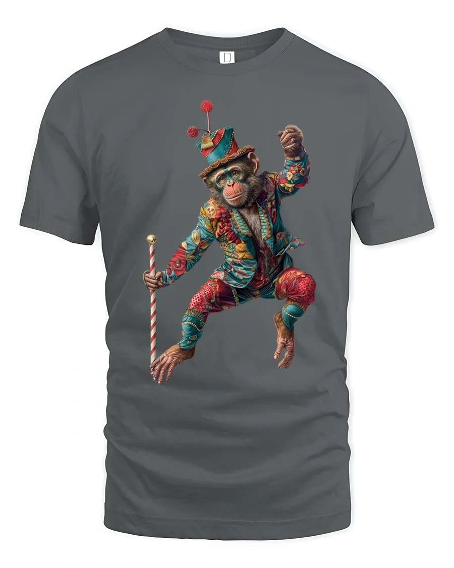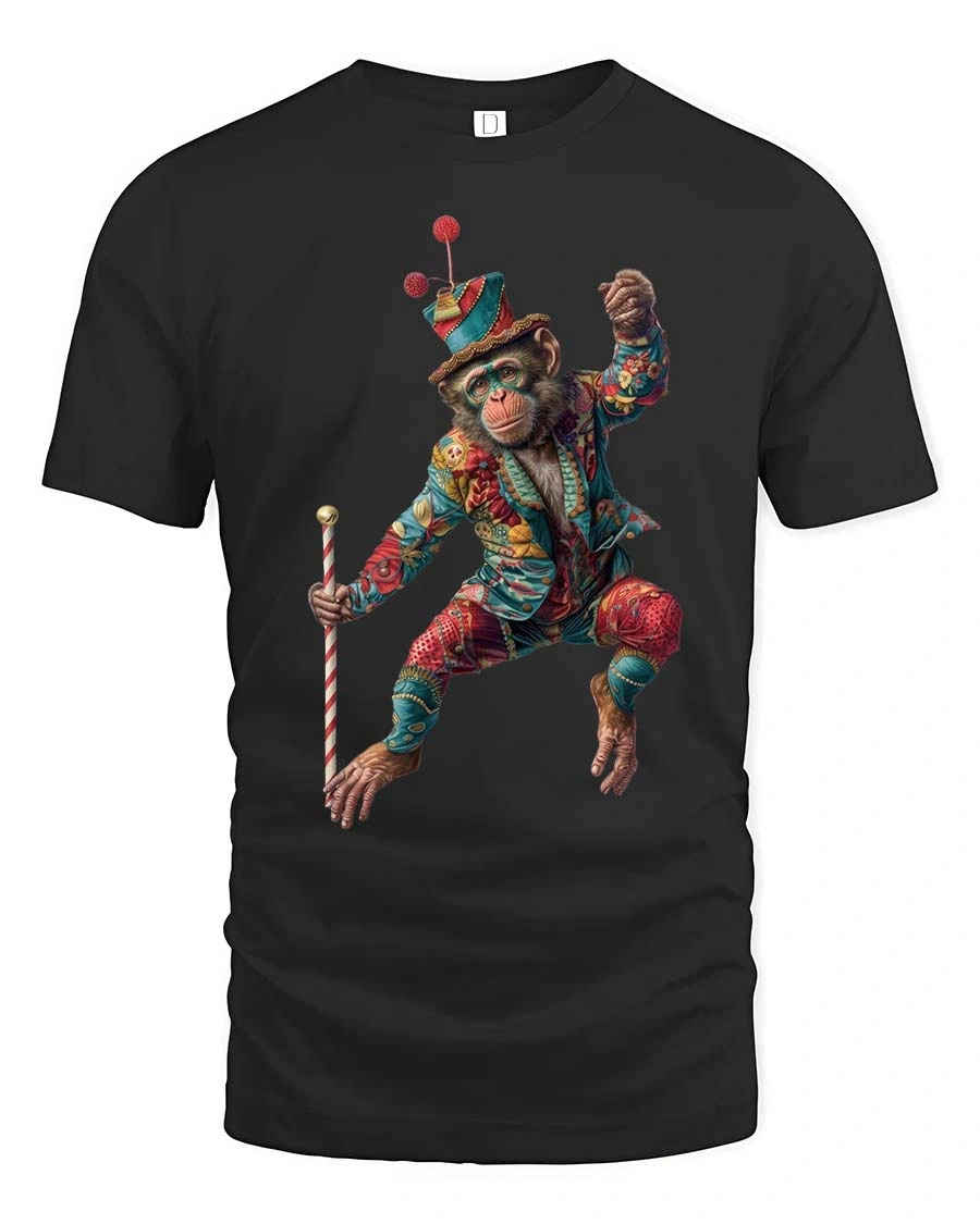 Featuring a playful monkey dressed in a vibrant circus outfit holding a cane mid dance, this design captures fun energy and creative expression.