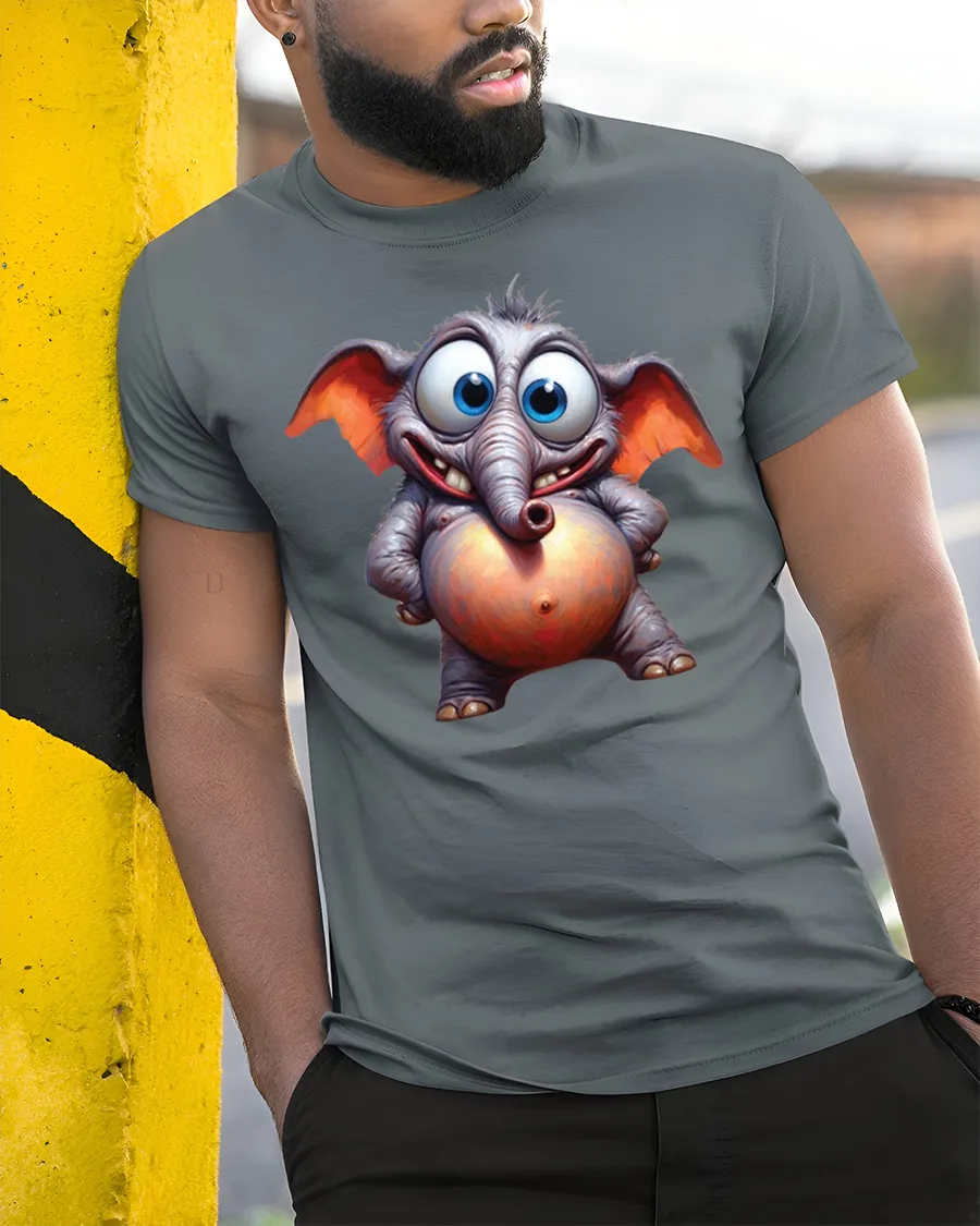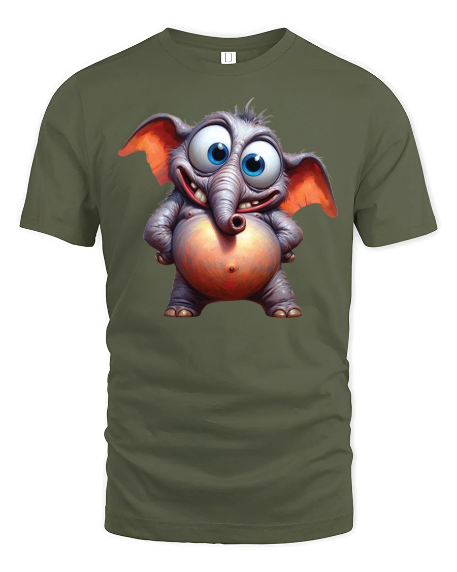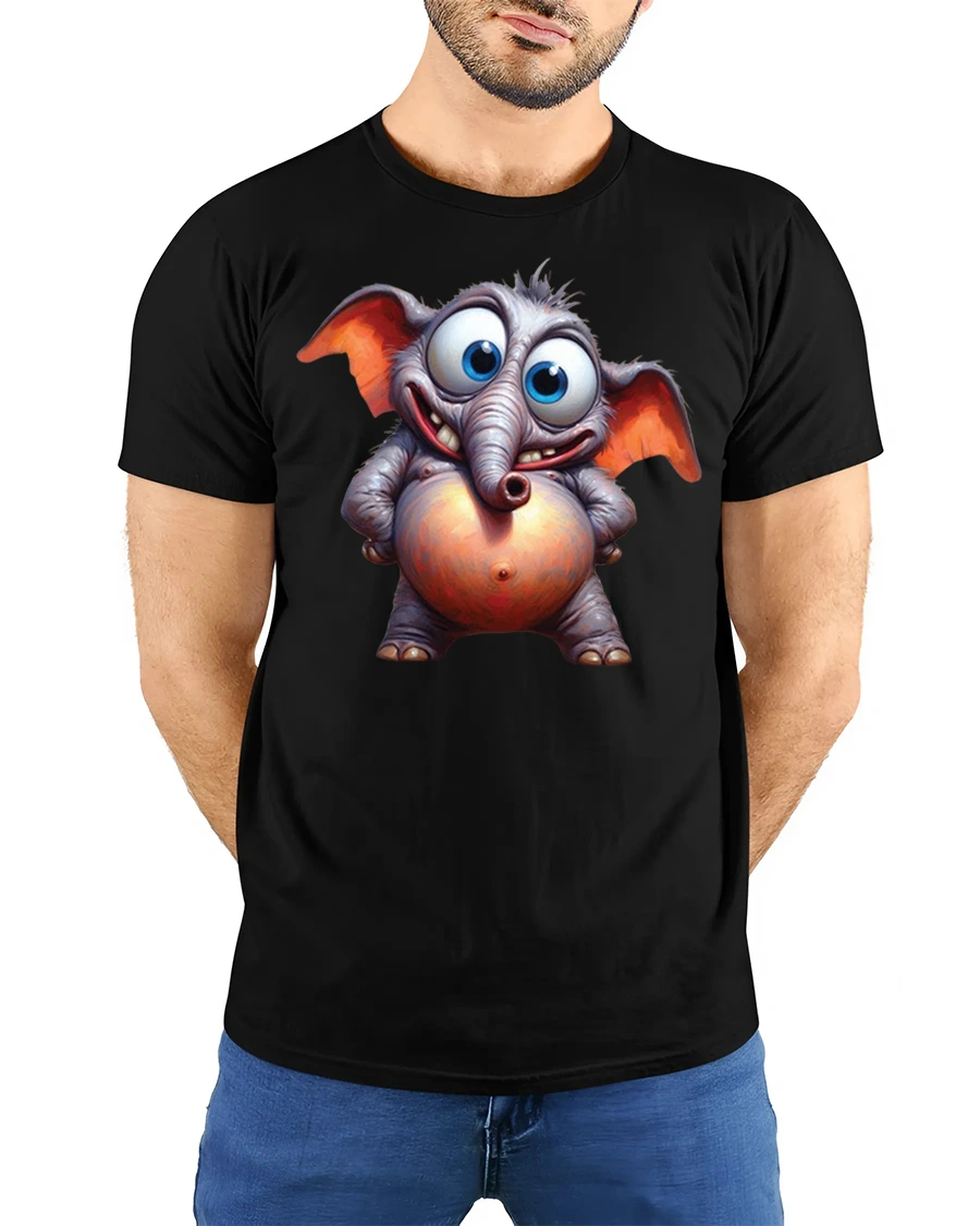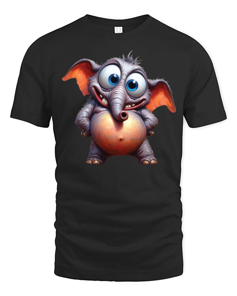Featuring an adorable chubby elephant with oversized eyes floppy ears and a cheerful expression this artwork adds humor and warmth to any casual outfit.