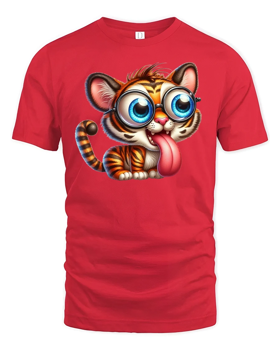 Funny Cute Tiger with Big Glasses Cartoon T-Shirt brings humor and cuteness together in one playful design. Featuring a wide-eyed tiger with oversized glasses and a goofy tongue-out expression, this shirt is perfect for anyone who loves adorable and funny animal art. Its bright colors and cartoon style make it a standout piece for both kids and adults who enjoy fun, lighthearted fashion.