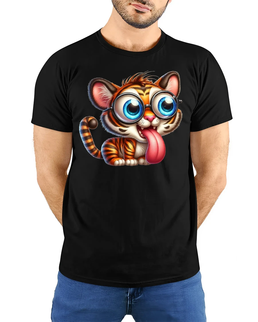 The Funny Cute Tiger with Big Glasses Cartoon T-Shirt also makes a great gift for animal lovers, pet enthusiasts, or anyone who enjoys quirky and cheerful designs. Add a touch of laughter and wild energy to your wardrobe with this irresistibly cute tiger tee!
