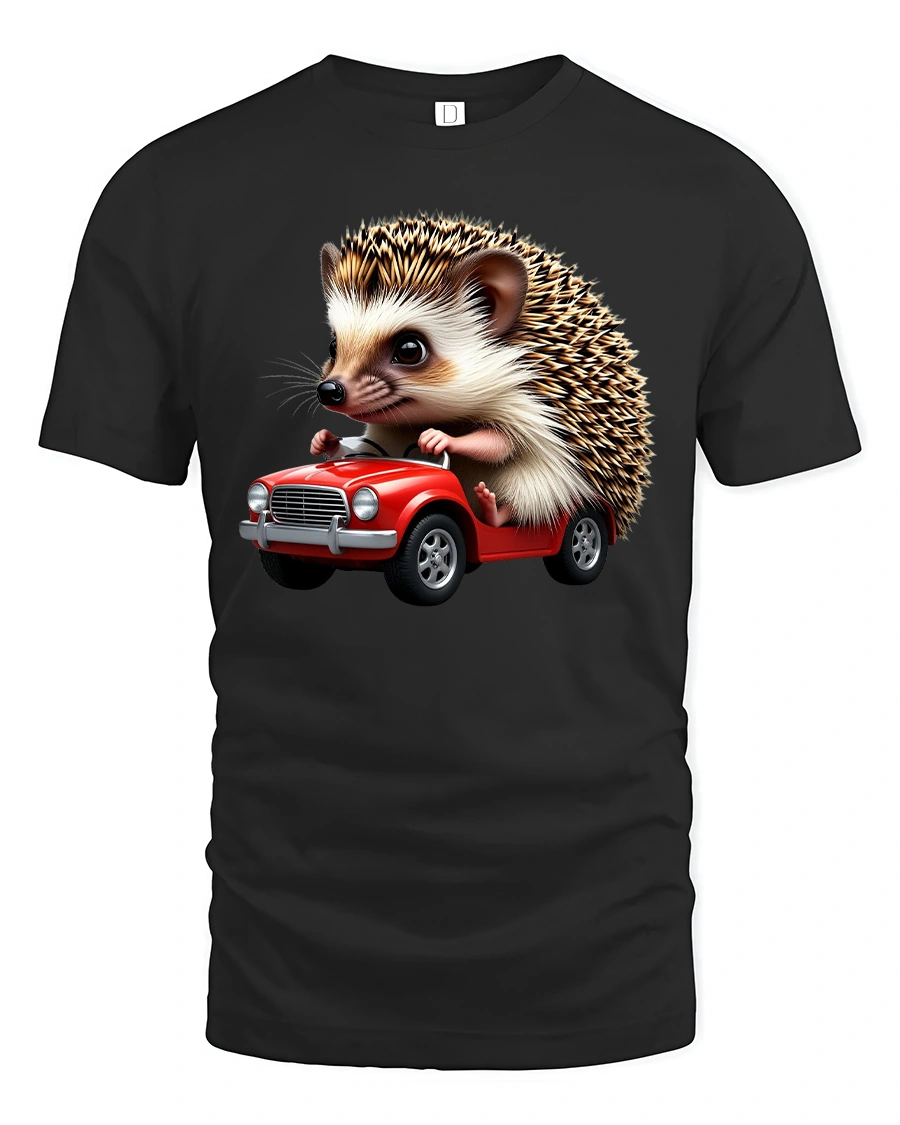 This eye-catching design features an adorable hedgehog behind the wheel of a bright red car, ready for a fun adventure.