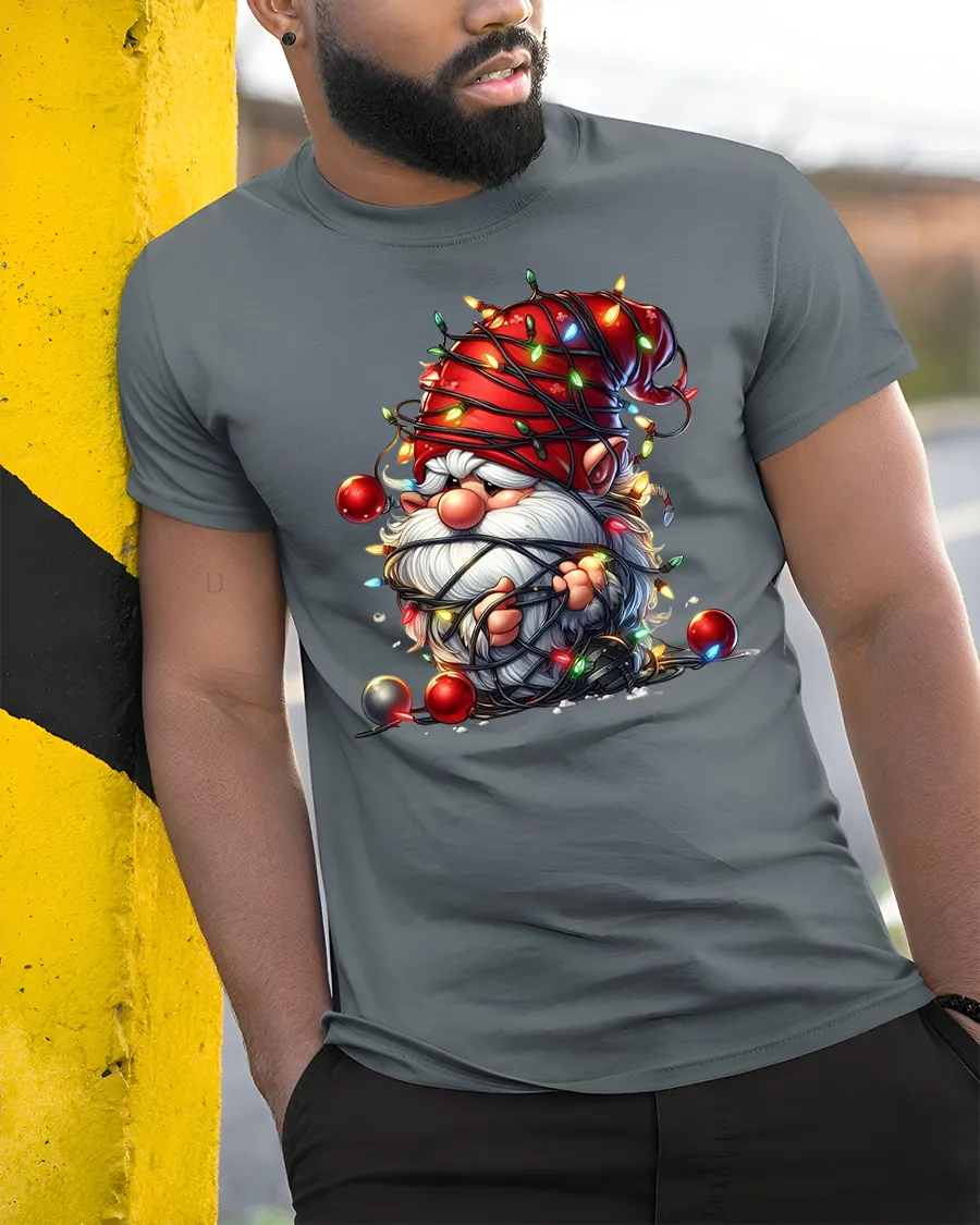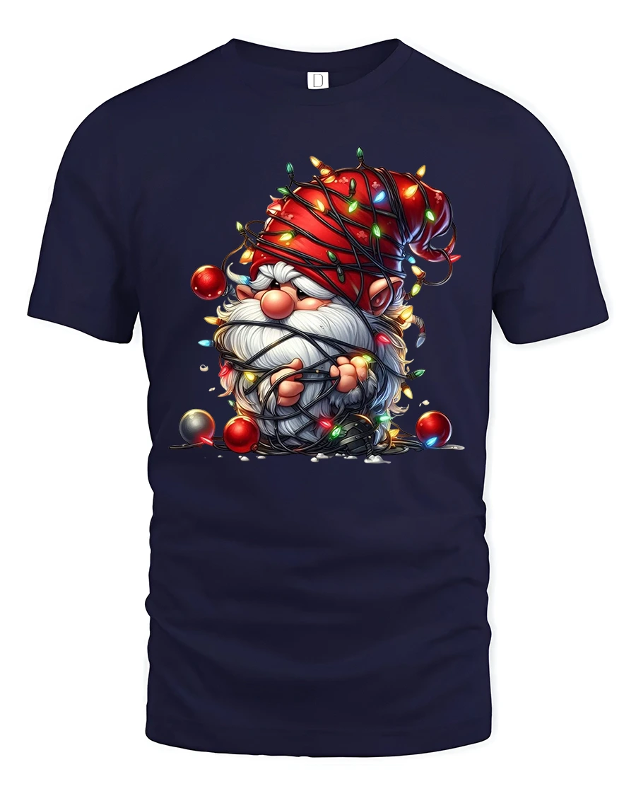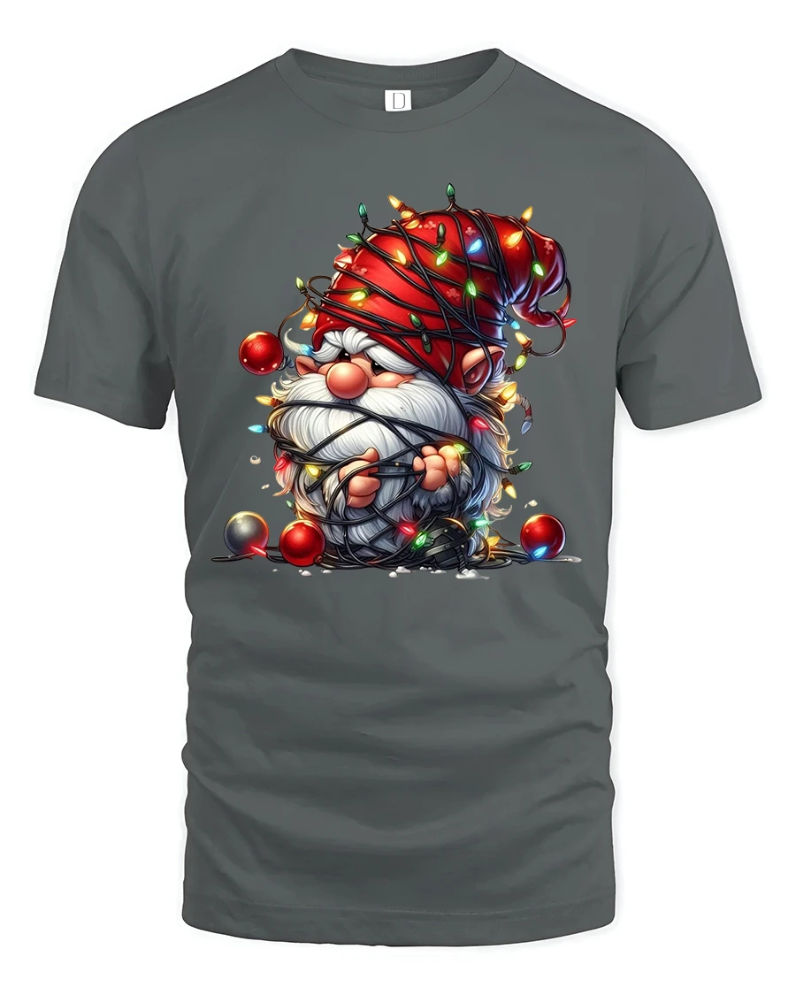 Funny Santa Gnome Tangled In Christmas Lights Graphic Tee brings humor festive spirit and playful charm to your holiday wardrobe.