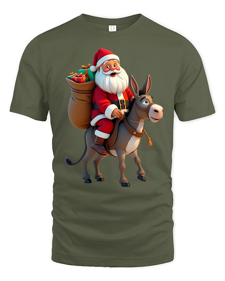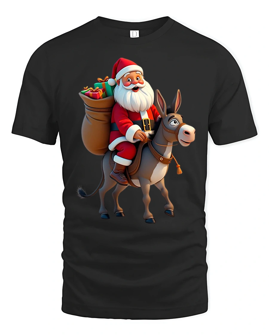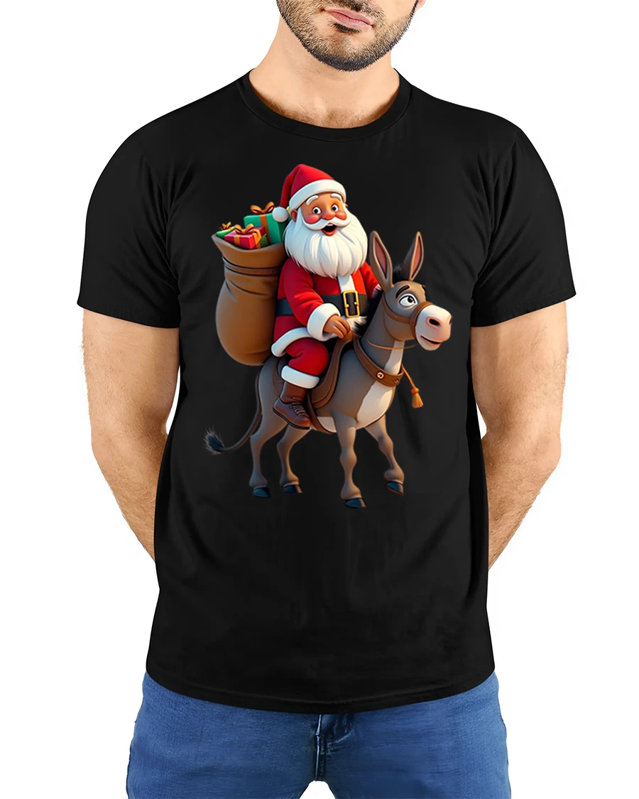 Crafted for comfort and durability, this t-shirt pairs effortlessly with jeans, pajama bottoms, or cozy winter layers. The high-quality print ensures Santa’s bright red suit, the donkey’s adorable expression, and the holiday gift details remain crisp and vibrant wash after wash. Whether worn for Christmas gatherings, December outings, or as a conversational piece throughout the season, this tee spreads joy and humor everywhere you go.