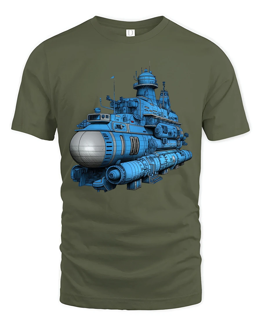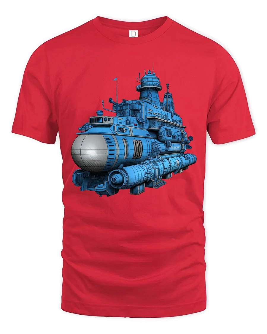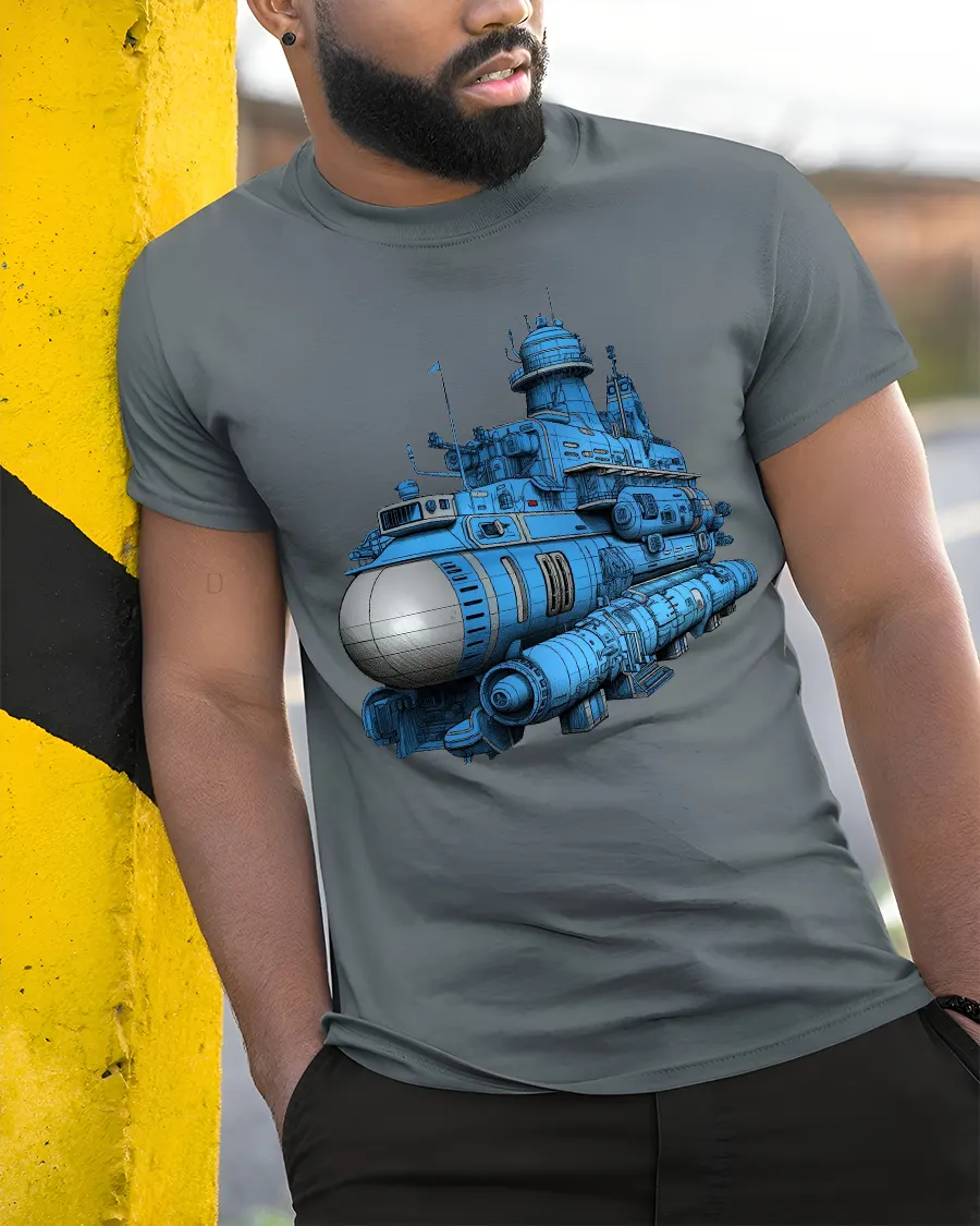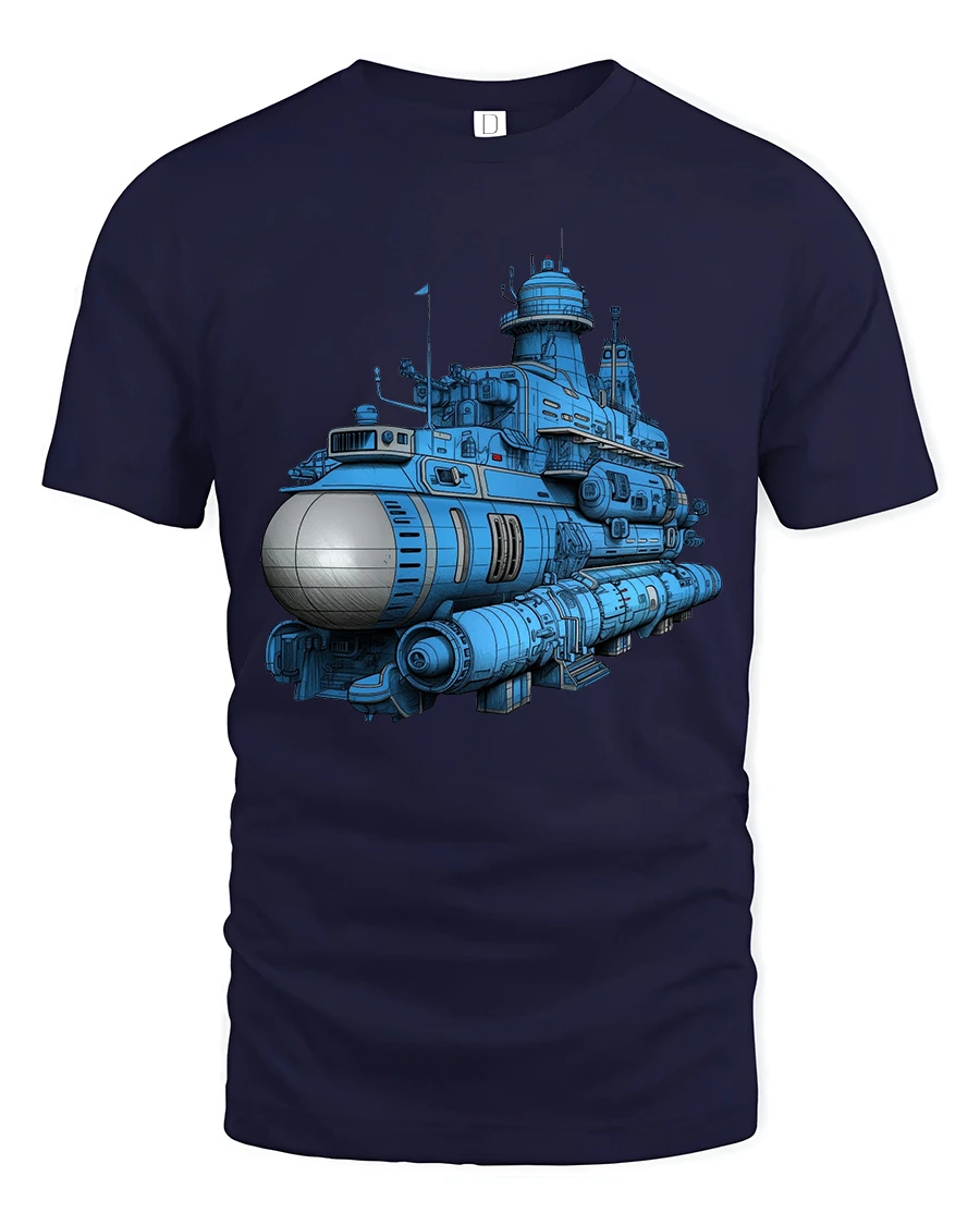 This tee features a highly detailed futuristic submarine illustration that blends science fiction style with mechanical and ocean exploration themes.