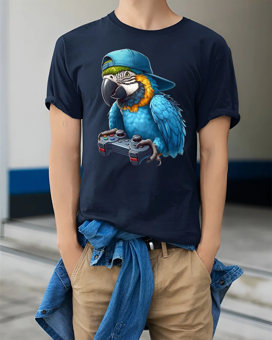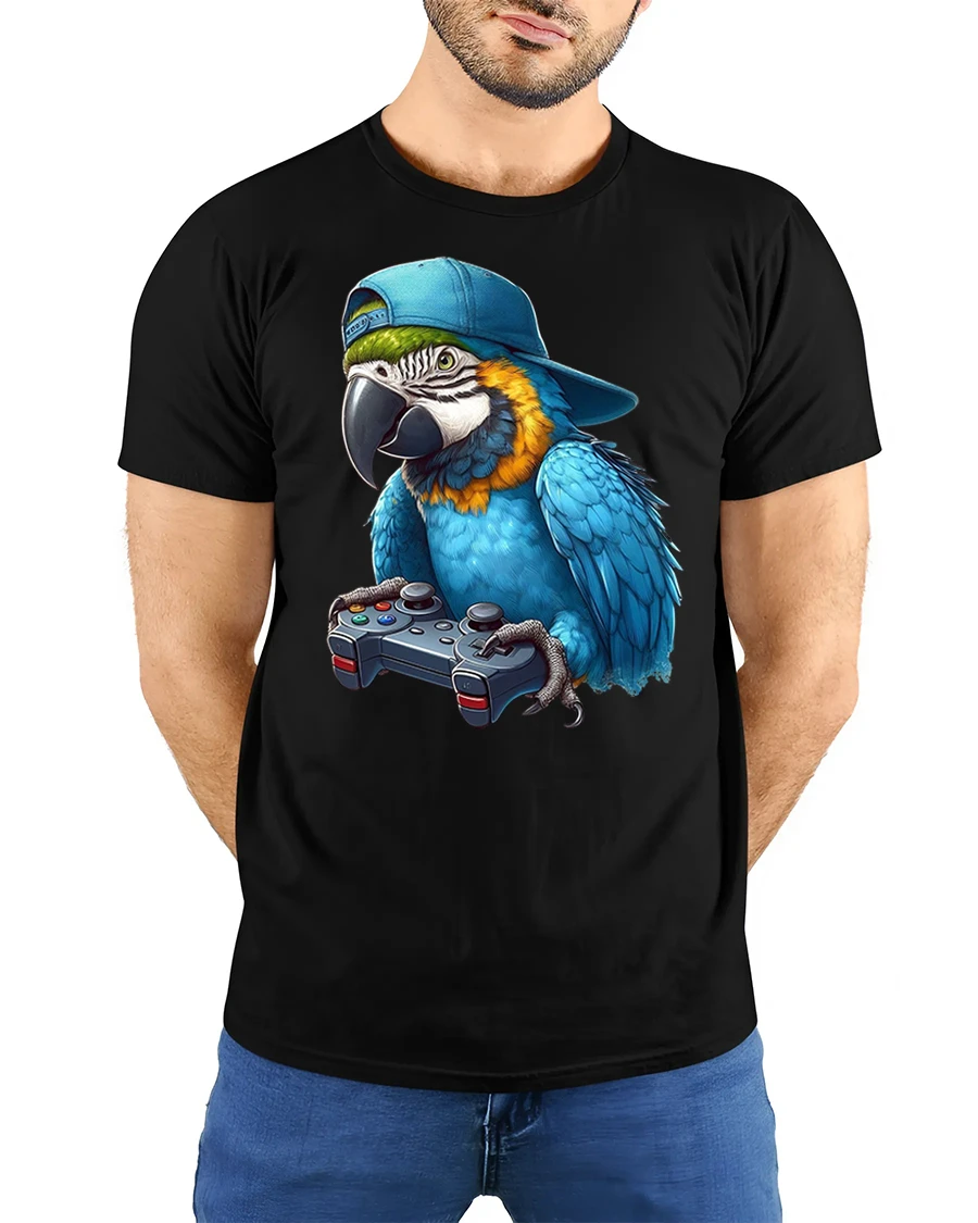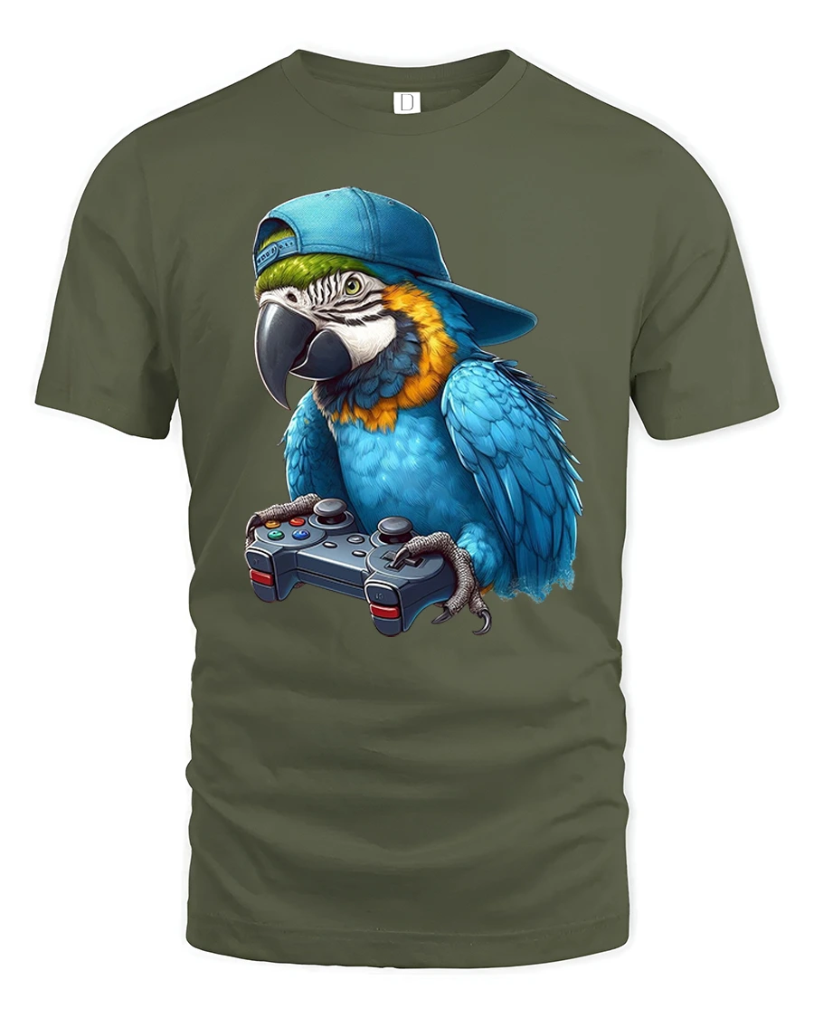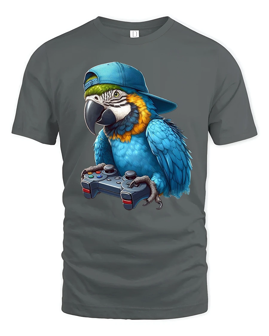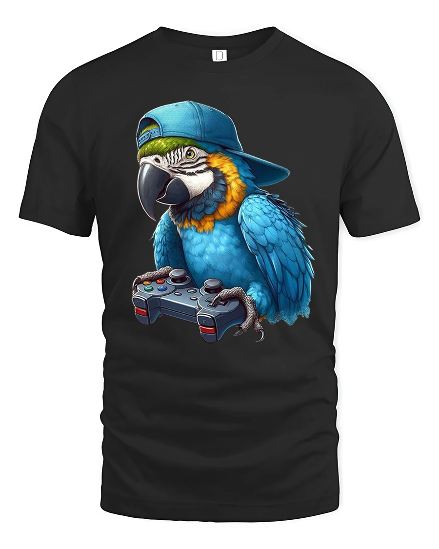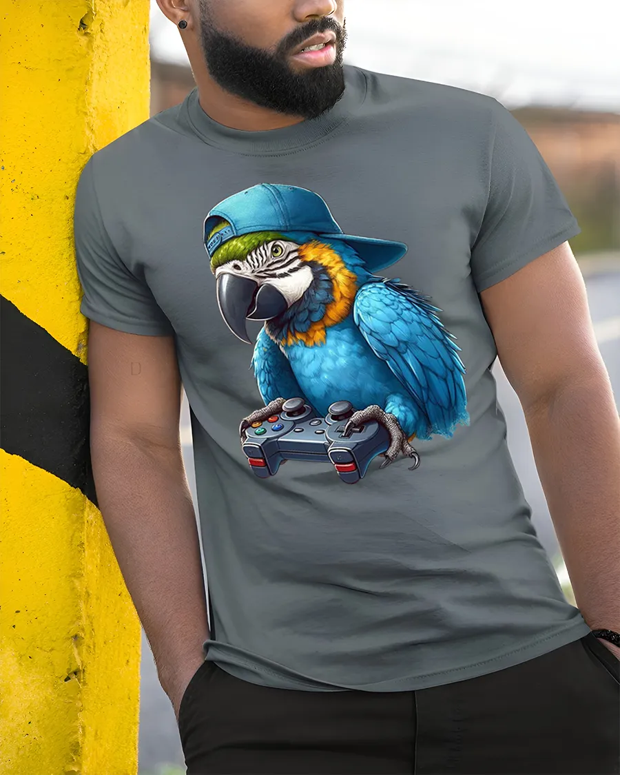 Featuring a cool parrot wearing a snapback hat and holding a game controller, this tee is perfect for gamers who love humor, animals, and unique art.
