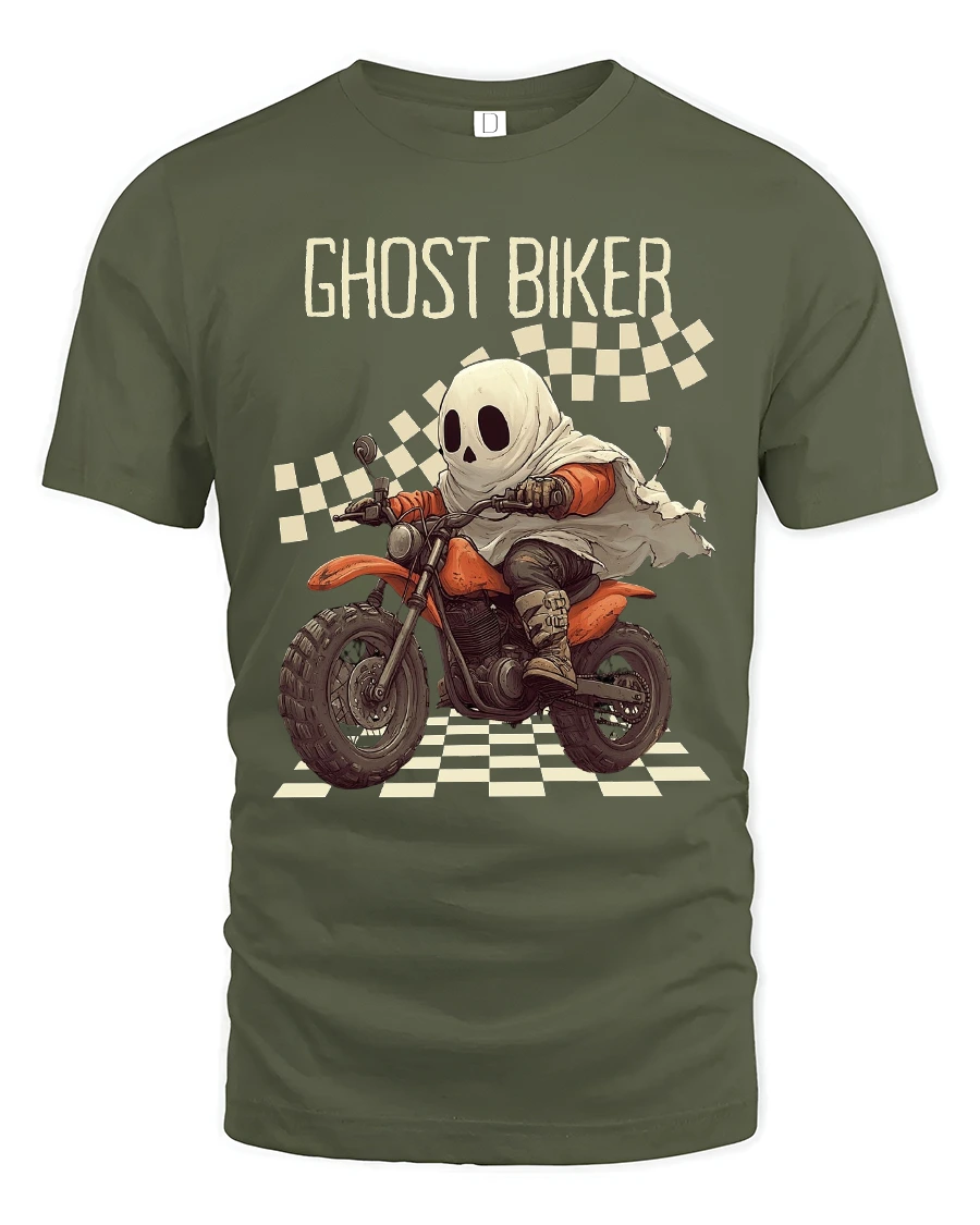Ghost Biker Racing Skull Motorcycle T Shirt captures fearless speed and spooky attitude in one bold design. Featuring a mysterious skull faced rider tearing across a dirt bike with checkered racing flags in the background, this artwork blends vintage motocross energy with playful ghostly vibes. The dynamic motion and detailed illustration create a powerful statement that instantly stands out.