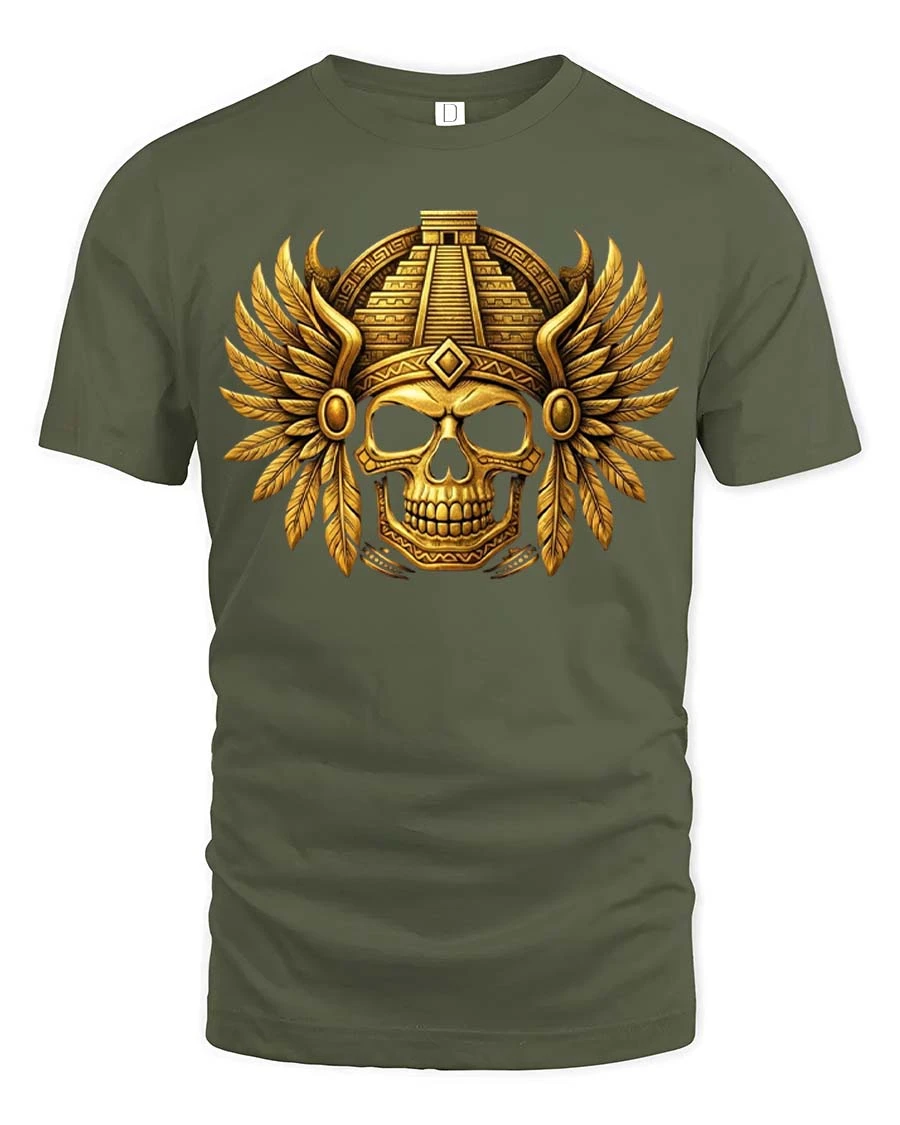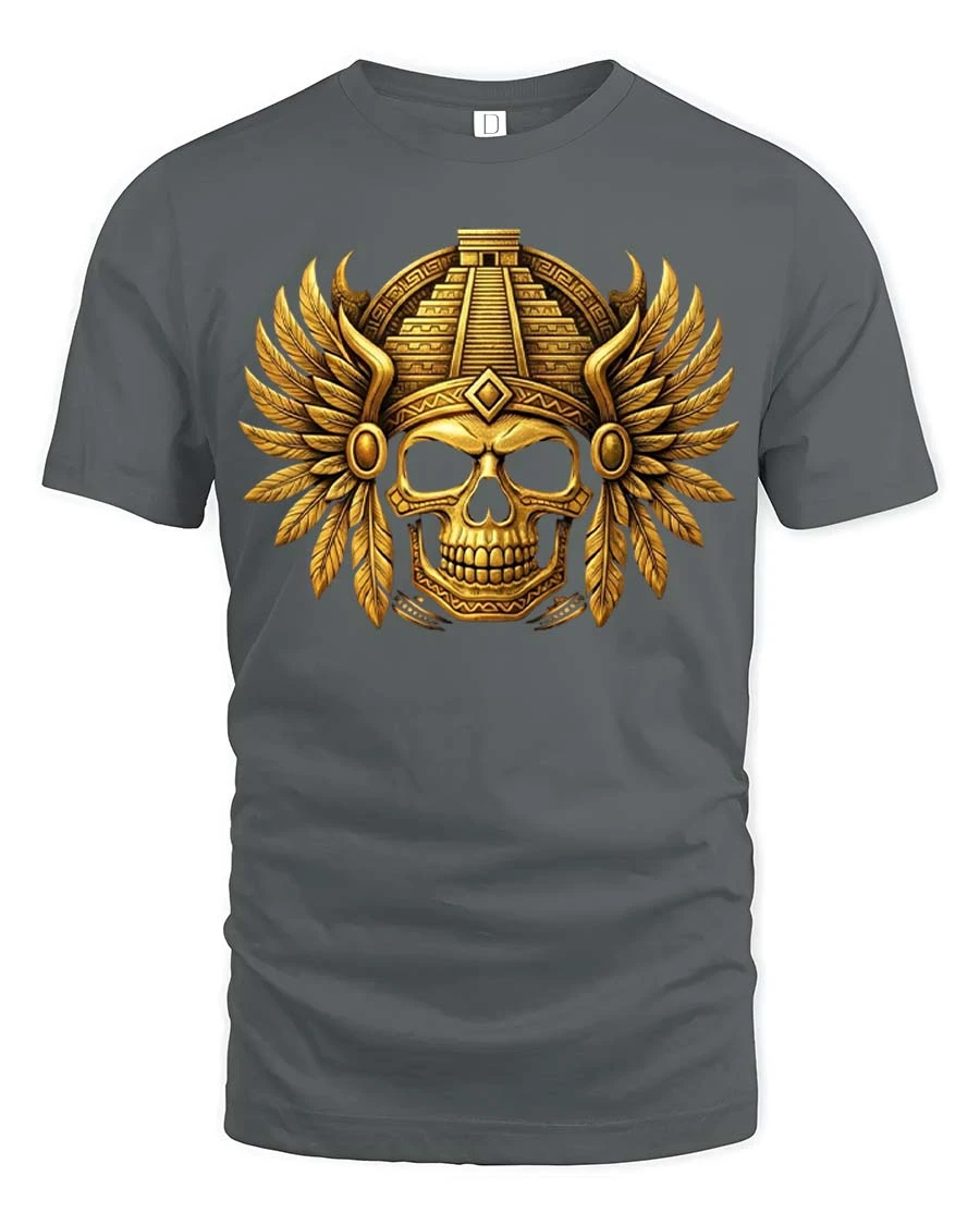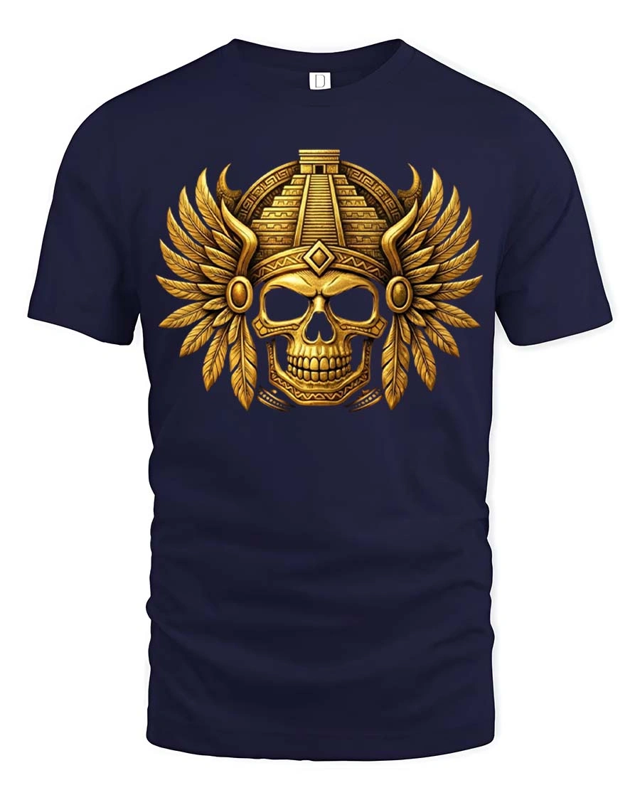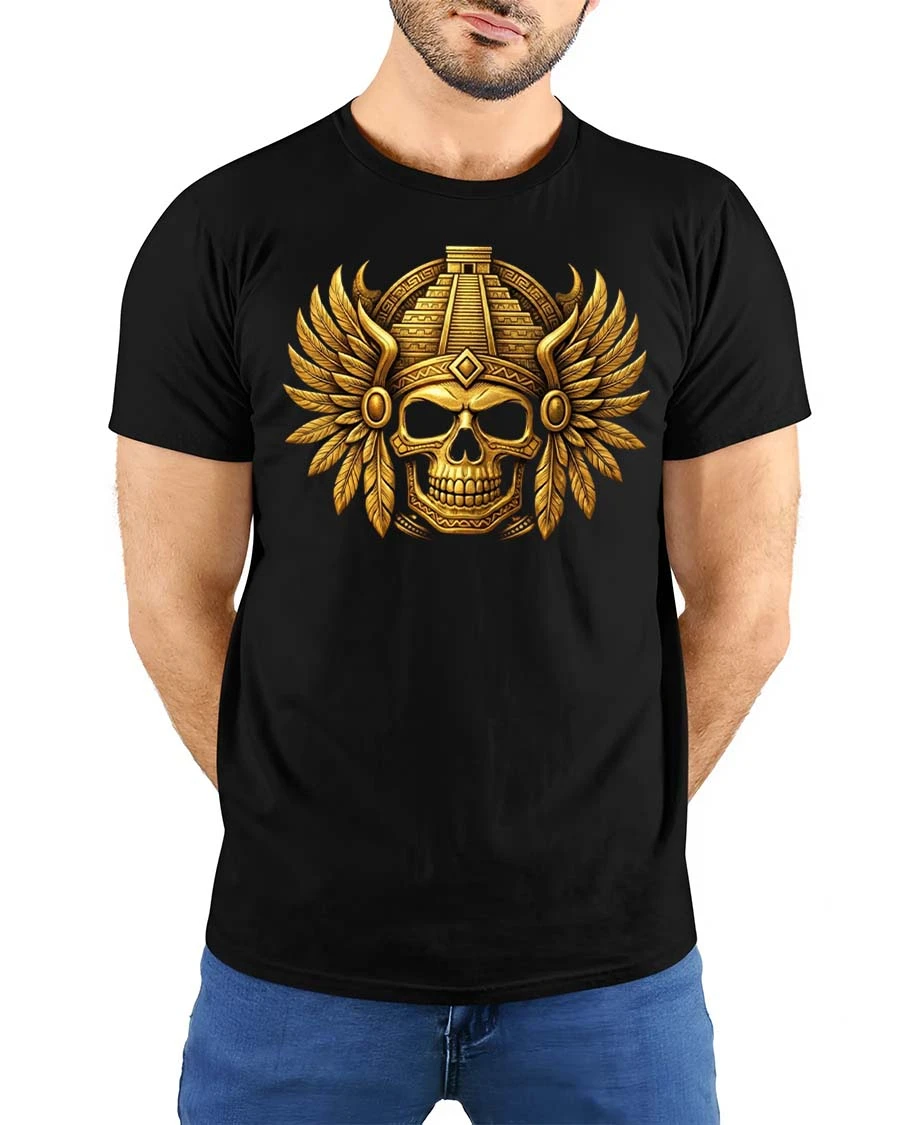 Golden Aztec Skull Wings Graphic T Shirt Ancient Warrior Art showcases powerful symbolism inspired by ancient culture and legendary strength.