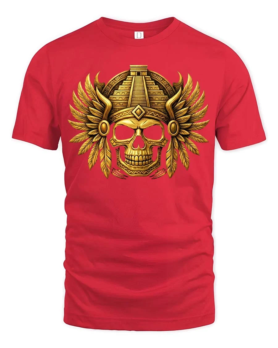 This aztec skull tshirt represents confidence heritage inspiration and appreciation for ancient artistic symbolism.