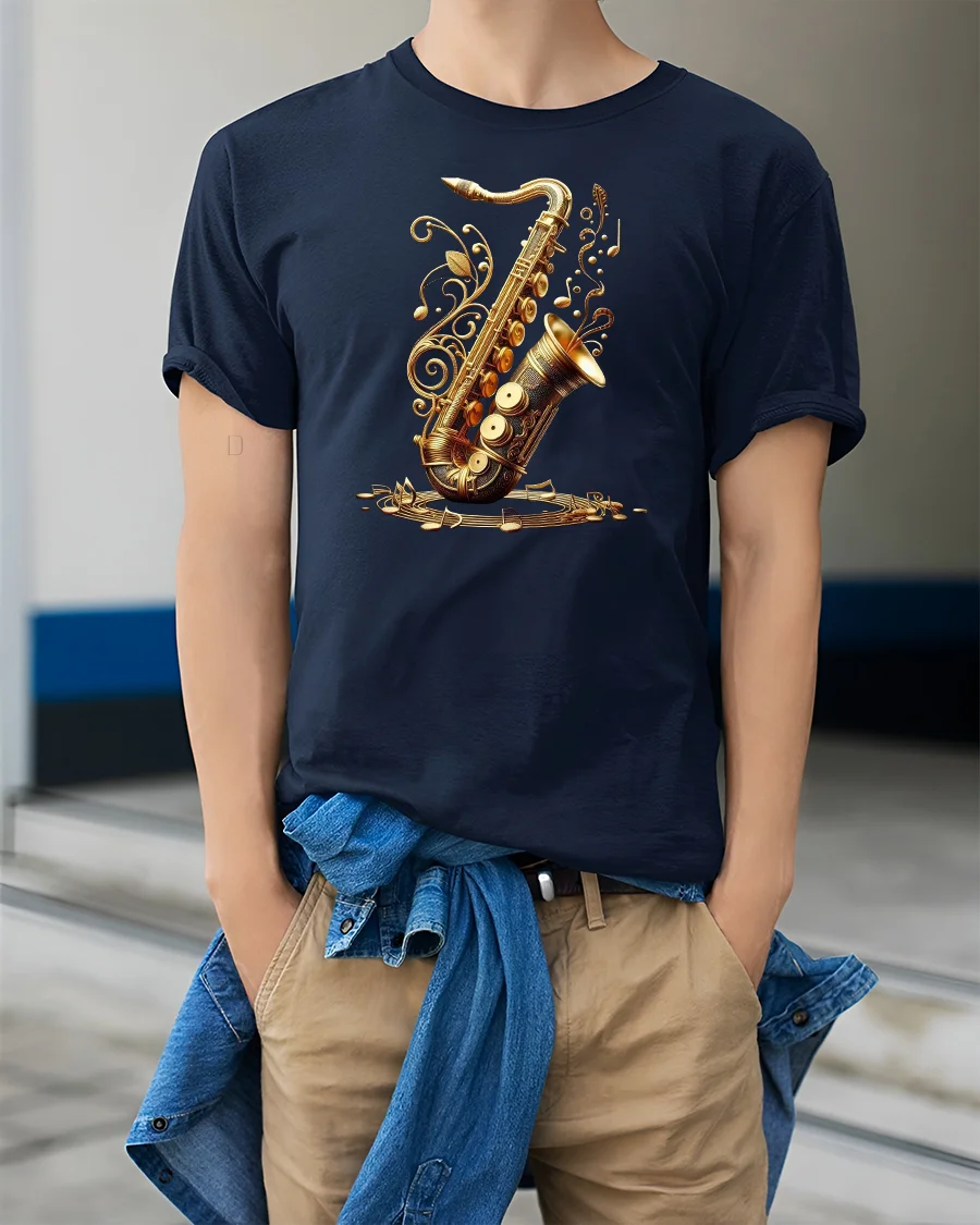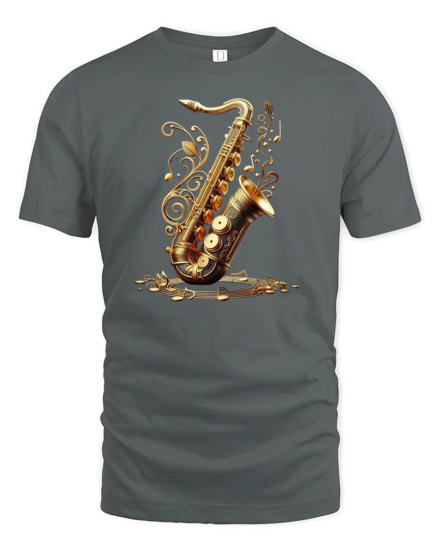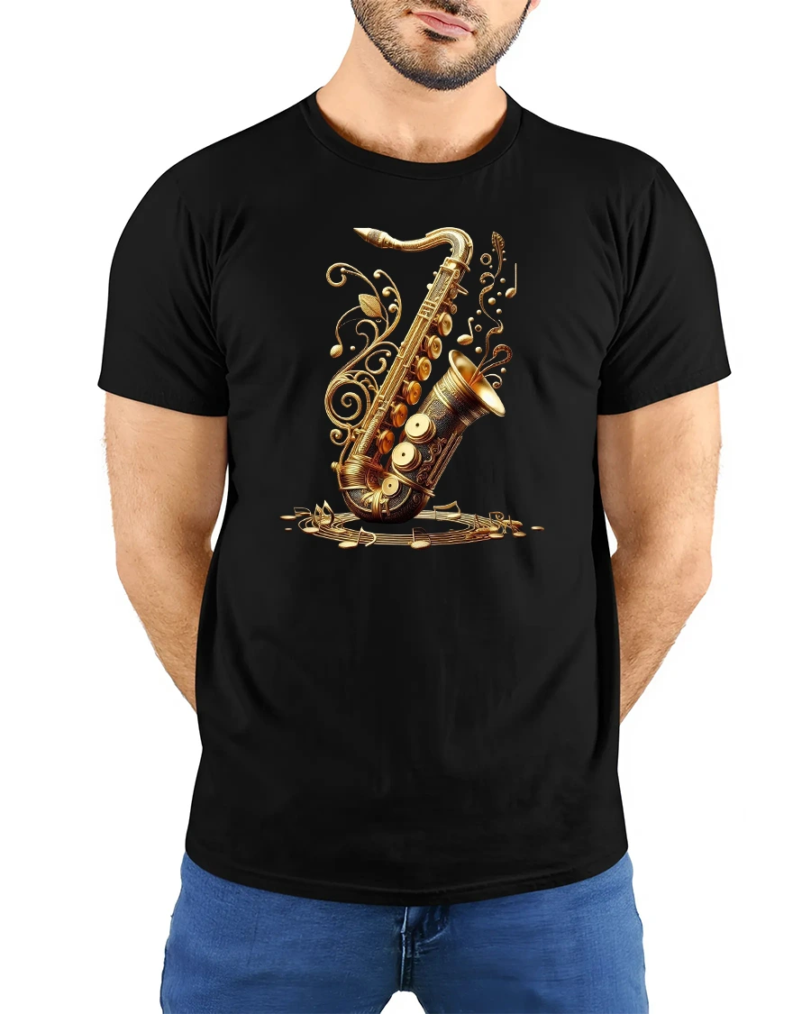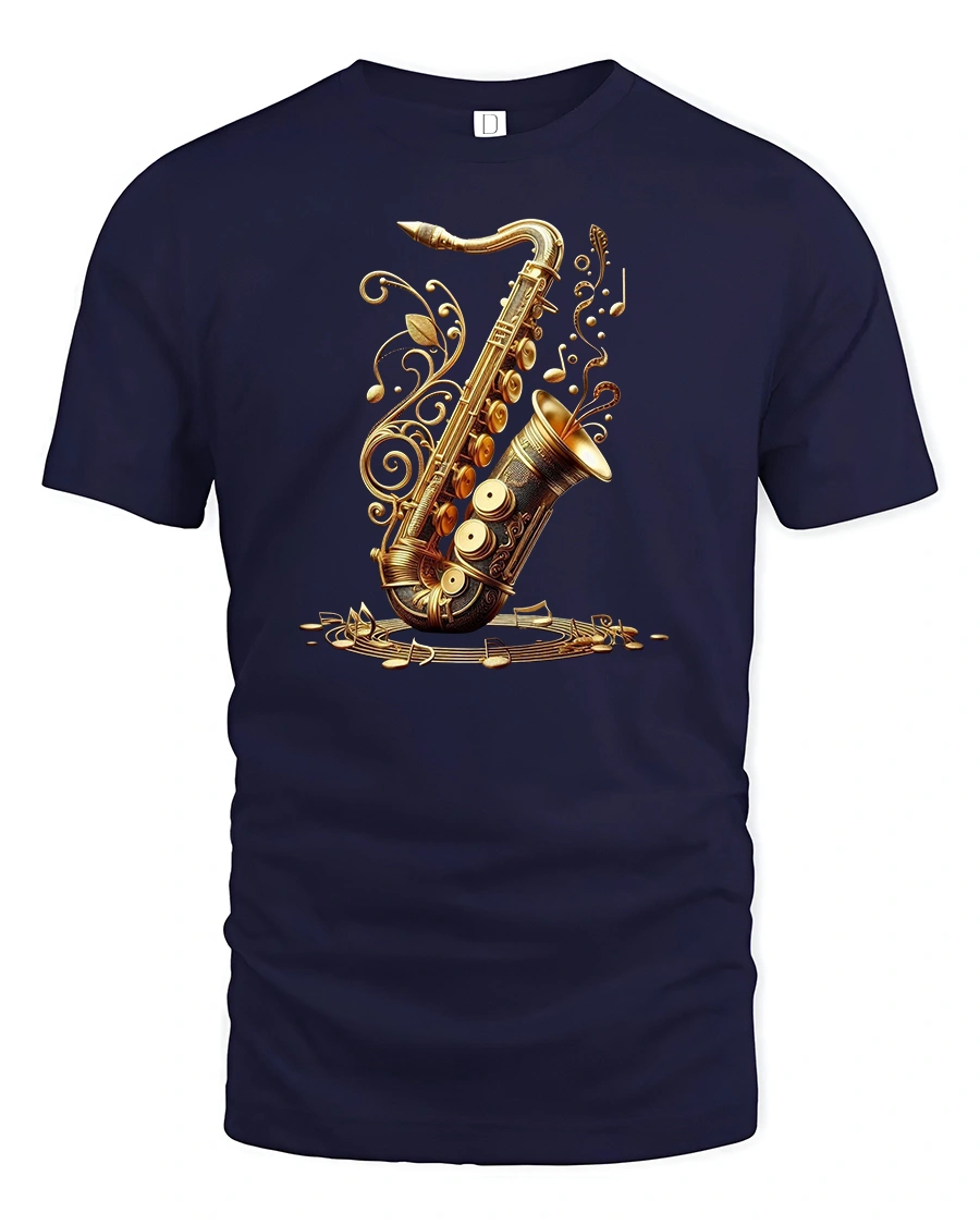 Featuring a beautifully detailed golden saxophone surrounded by flowing musical notes, this tee captures the soul of jazz and the beauty of music in motion.