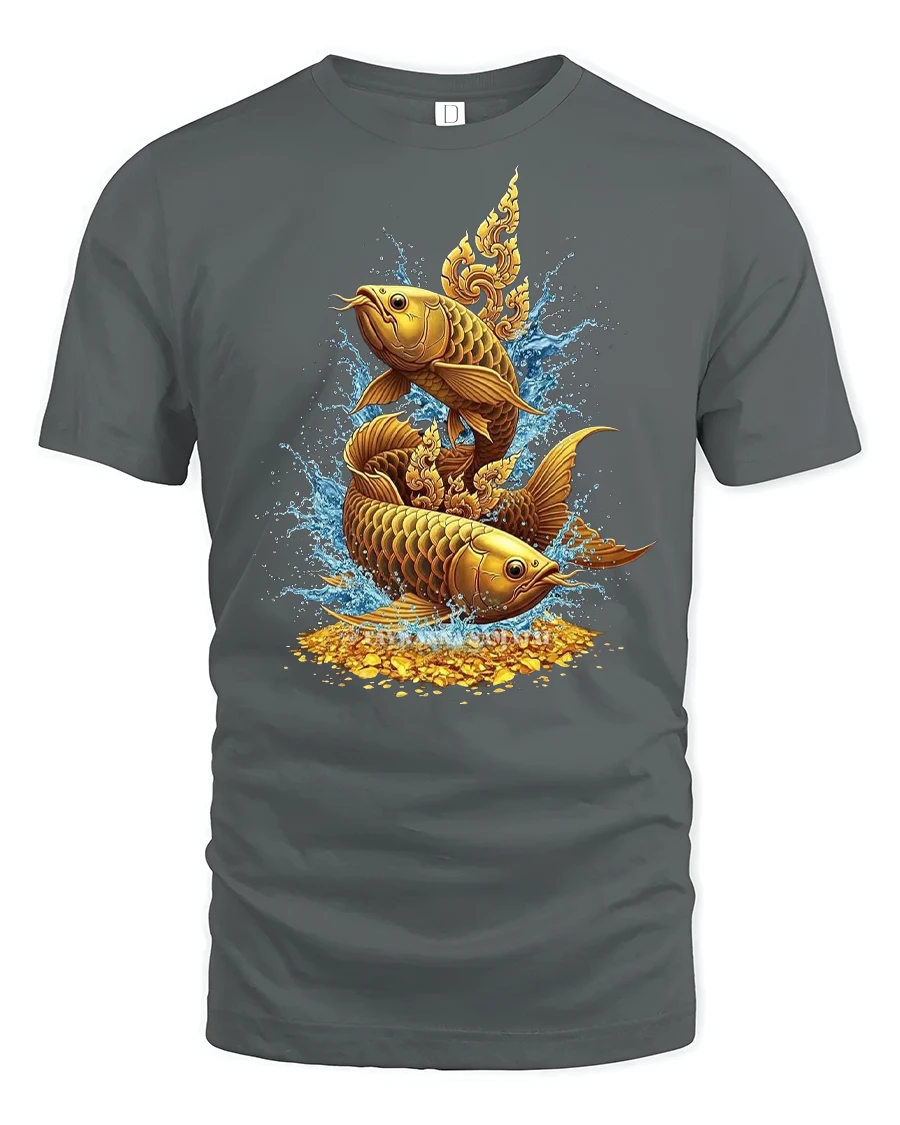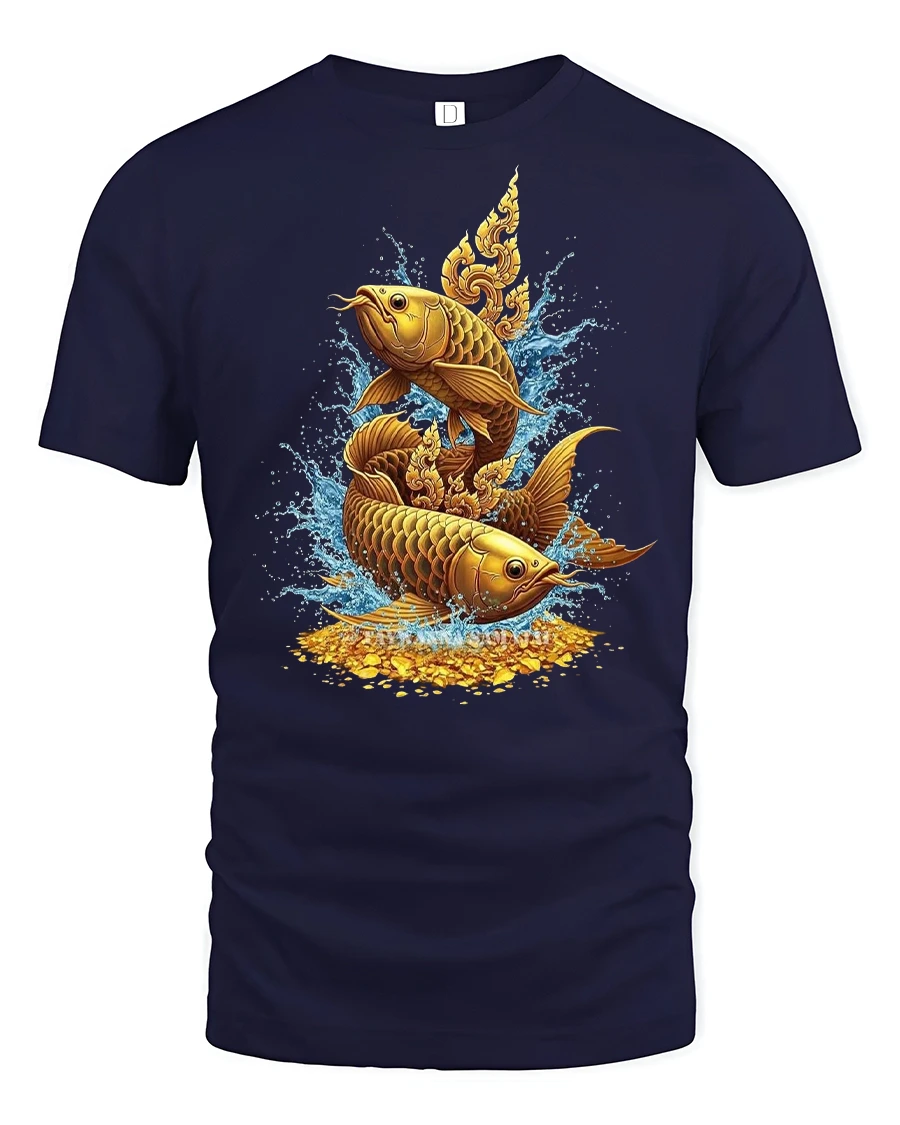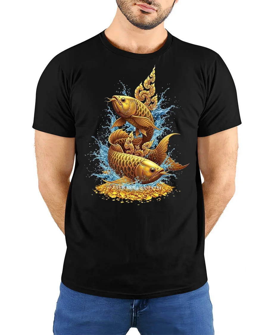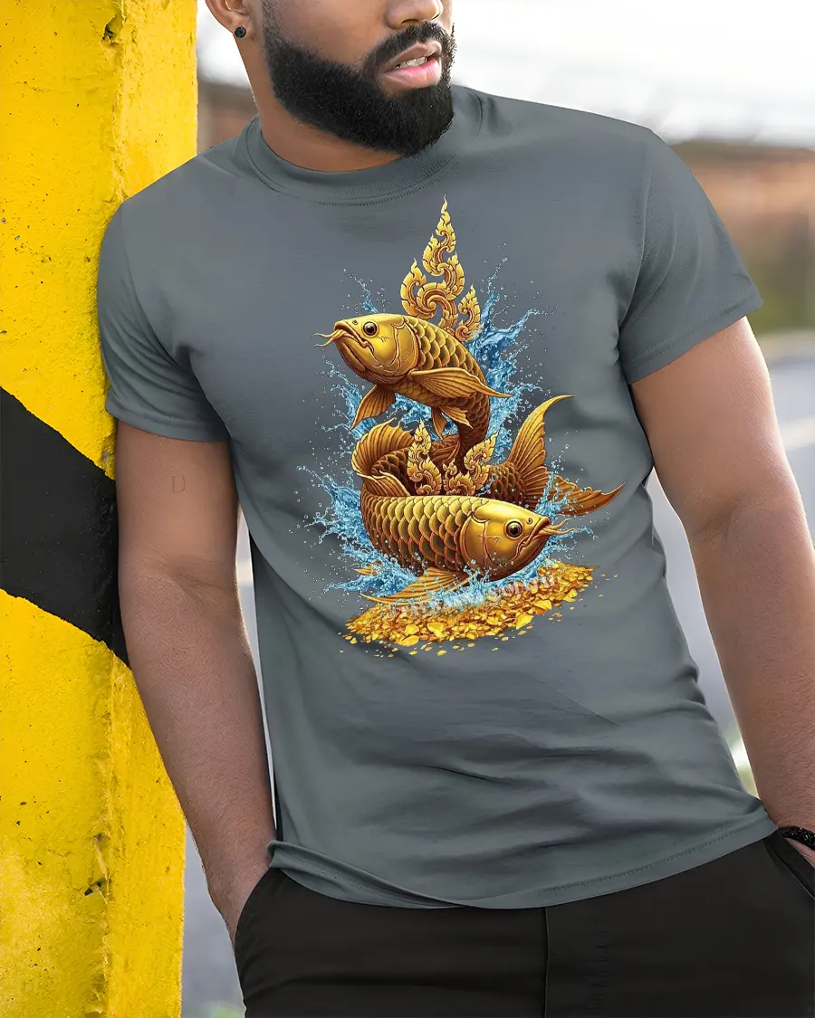 The Golden Koi Fish Fortune Graphic T-Shirt for Men is a powerful design inspired by symbols of prosperity, wealth, and good luck. Featuring two golden koi fish splashing in dynamic motion, this tee radiates strength, elegance, and timeless style. The artwork captures intricate details, making it a statement piece for those who love meaningful and bold designs.