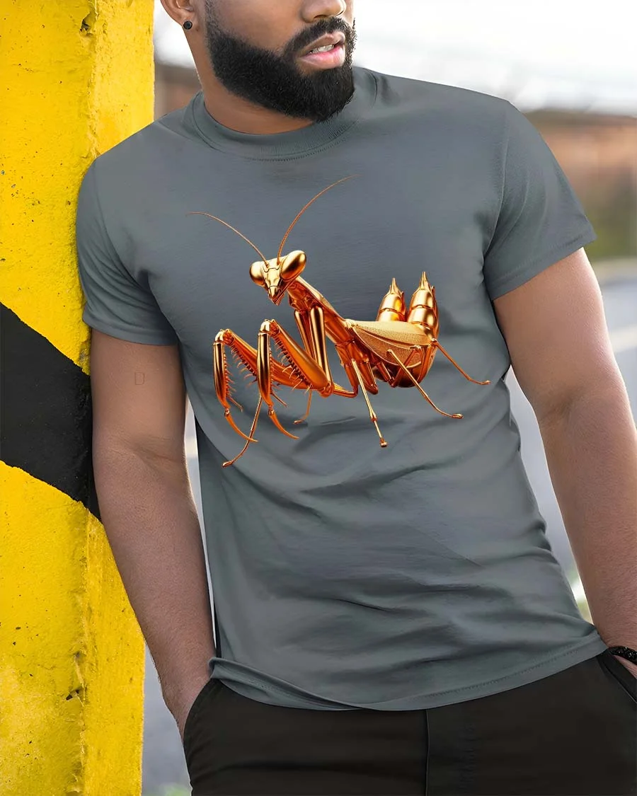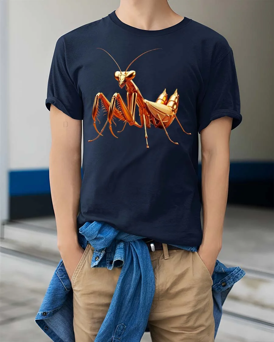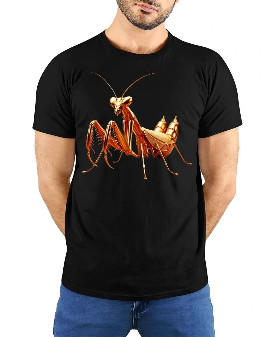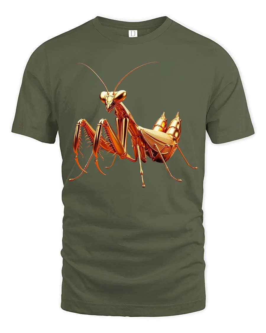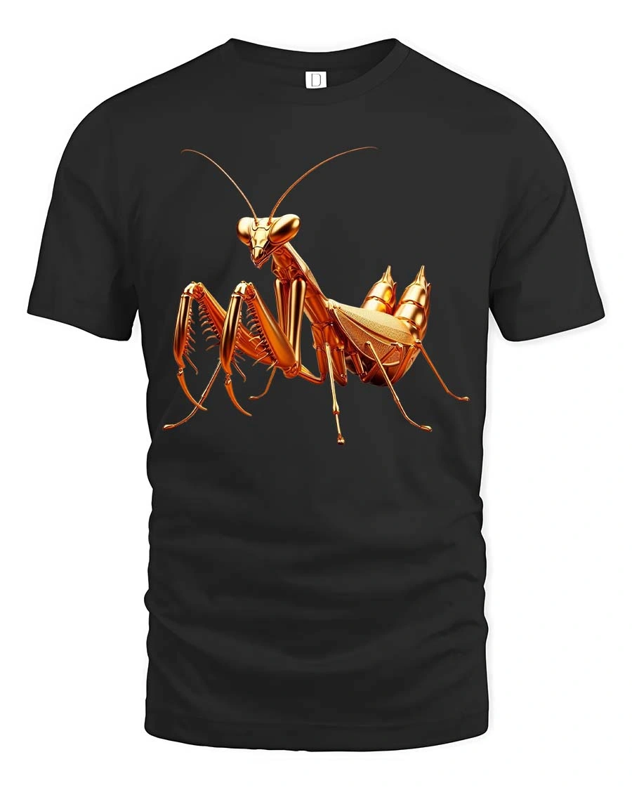 Golden Praying Mantis Insect Graphic Tshirt Luxury Style features a visually striking illustration inspired by the elegance and precision of nature.