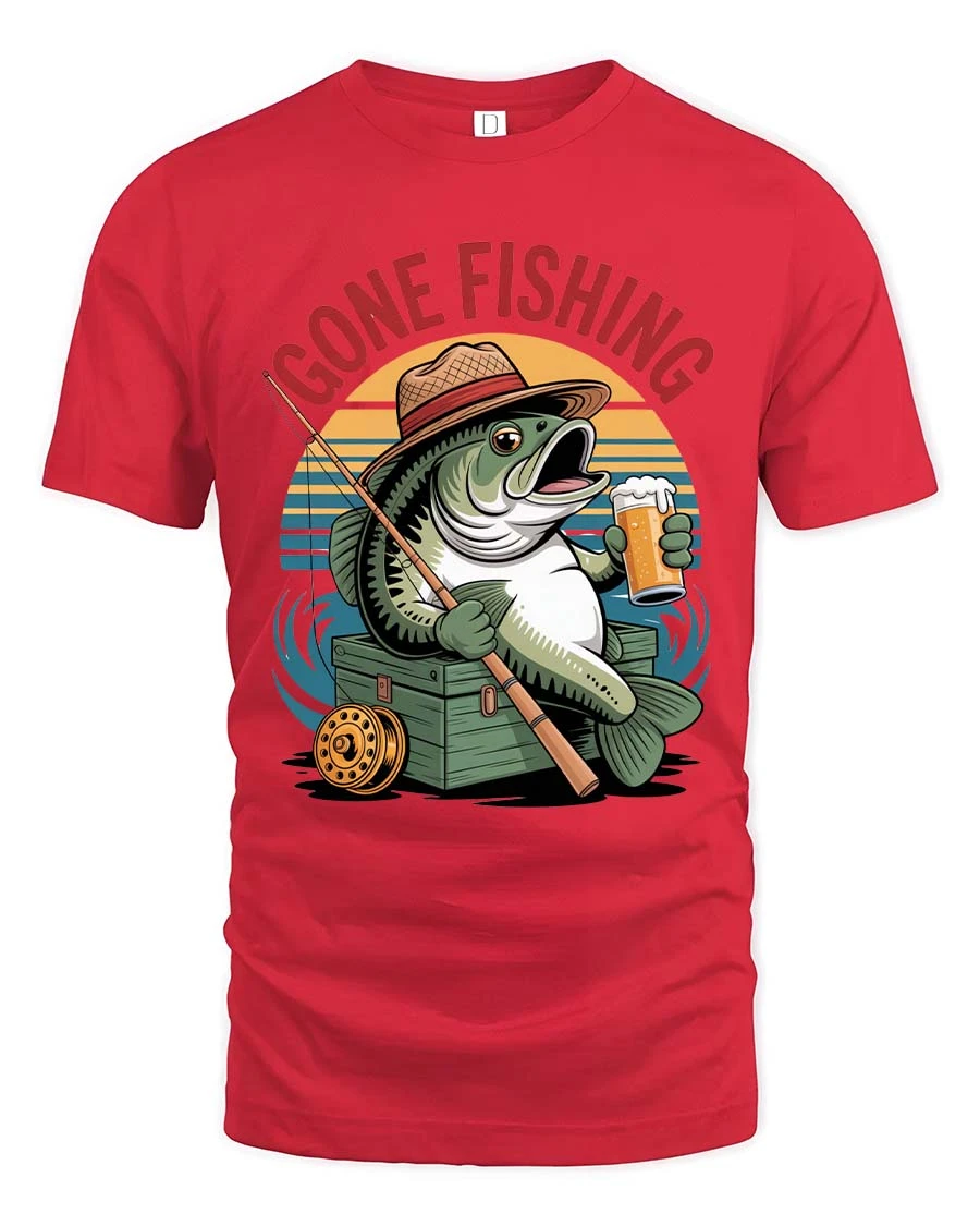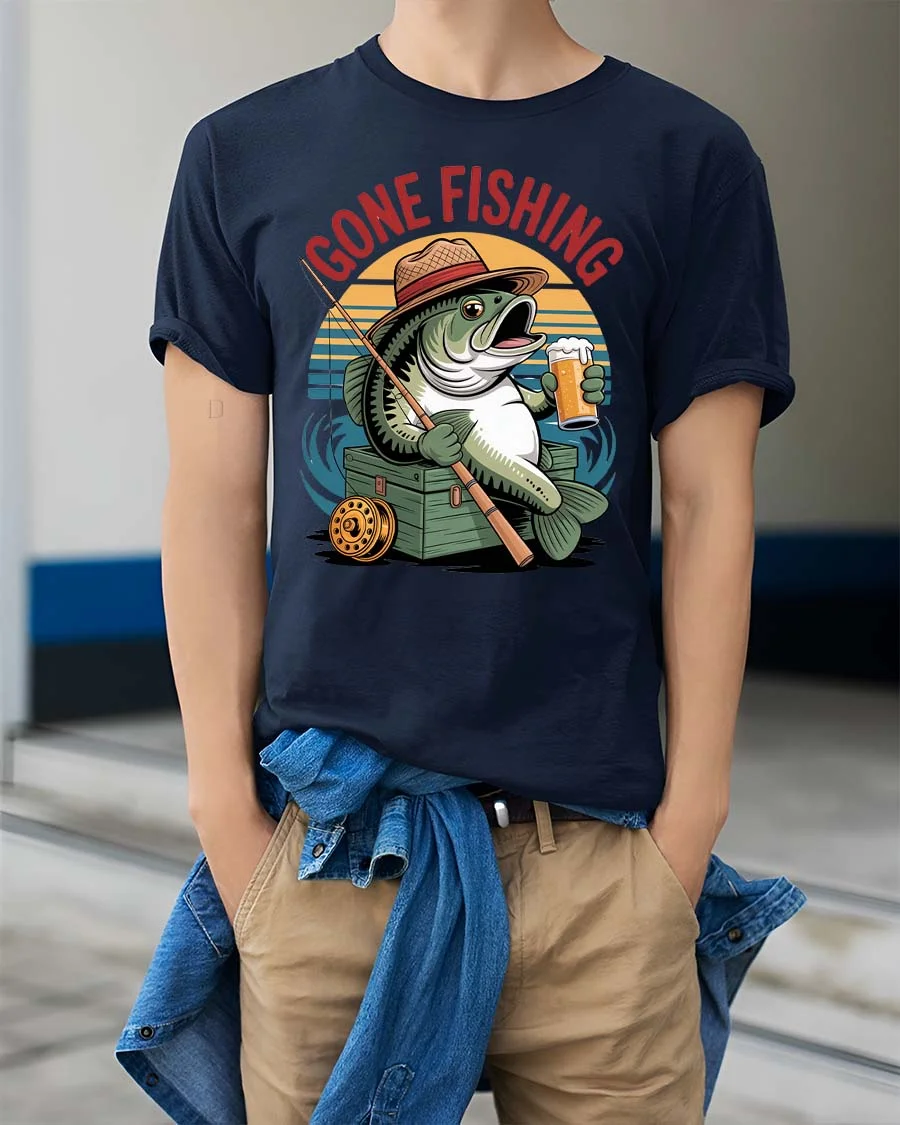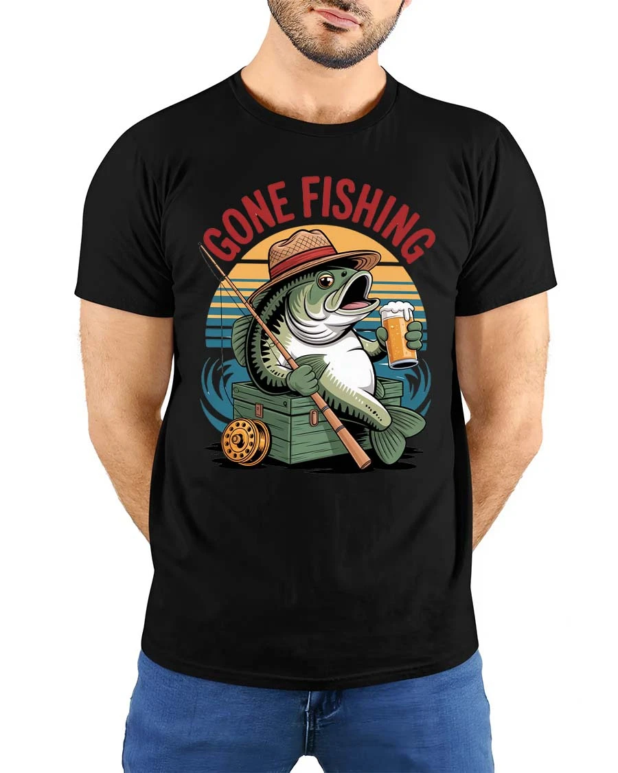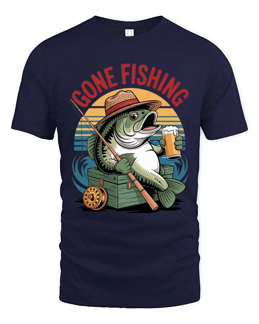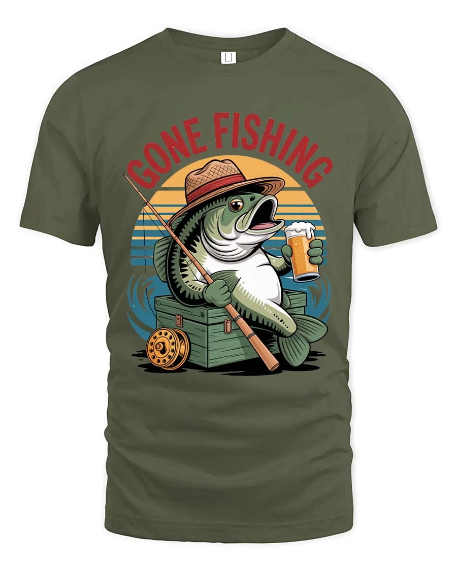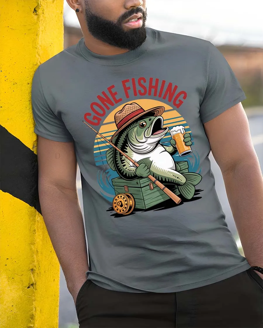 Gone Fishing Funny Fish Beer Graphic T Shirt Vintage Style combines humor and classic fishing culture into a playful artistic design.