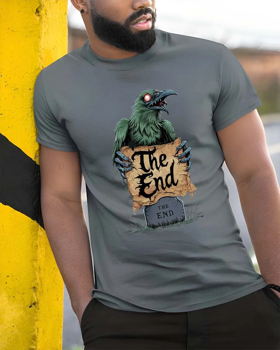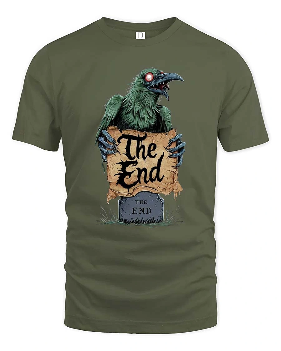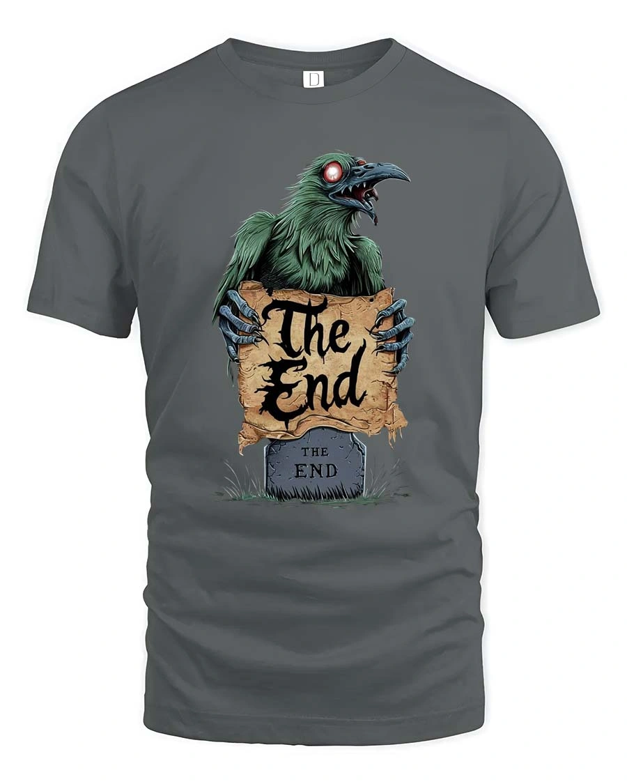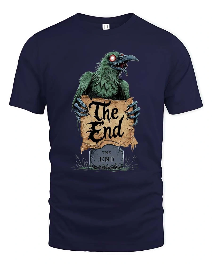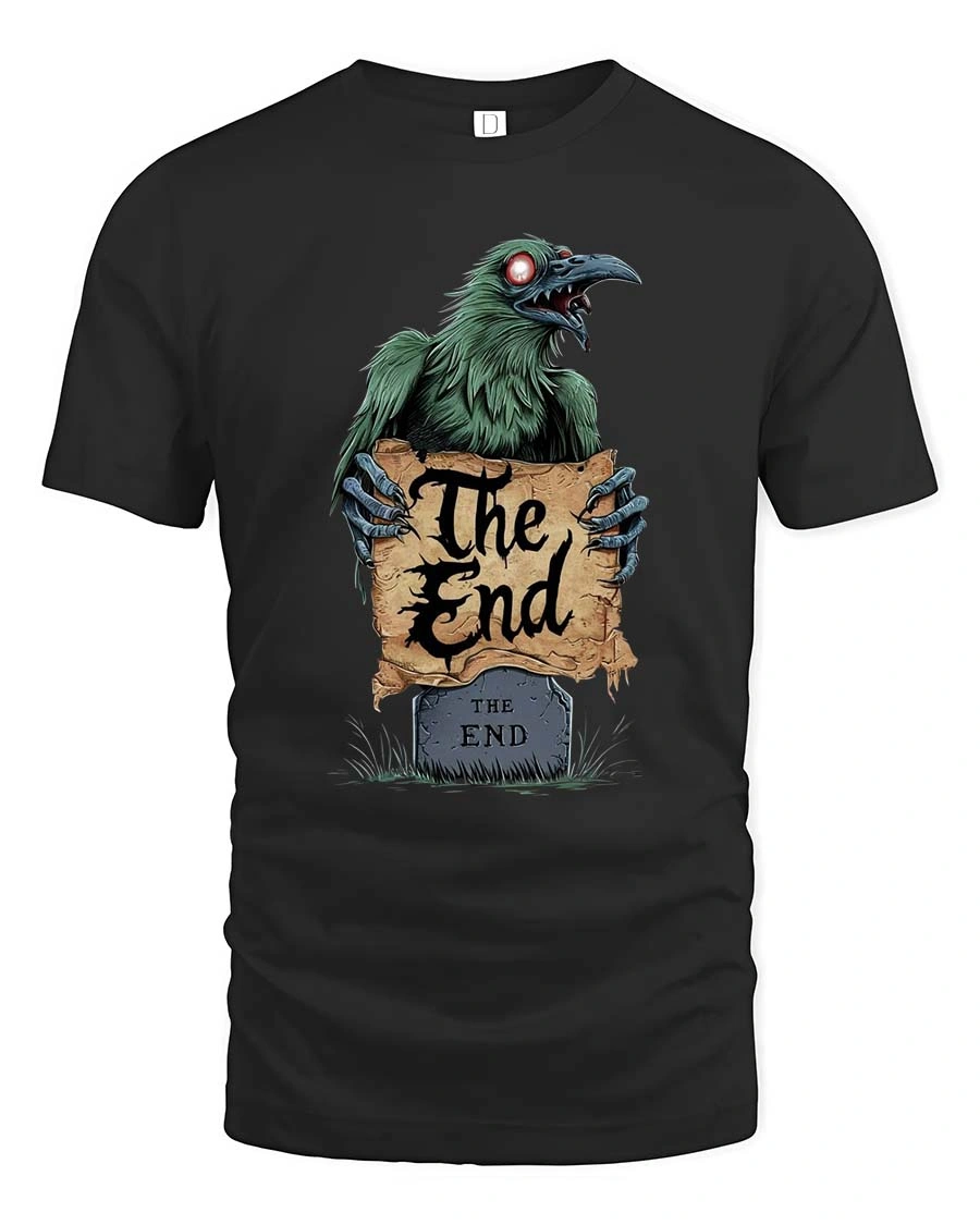 Embrace dark humor and gothic style with this eerie Raven “The End” Horror T-Shirt. The design features a sinister raven with glowing eyes rising from behind a tombstone while holding a worn parchment that reads “The End.” With its creepy graveyard aesthetic and gothic lettering, the artwork creates a mysterious and haunting vibe perfect for fans of dark fantasy and horror art.