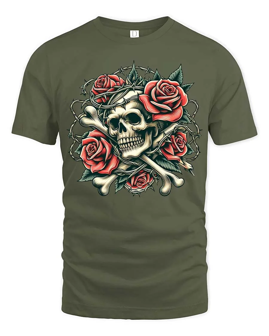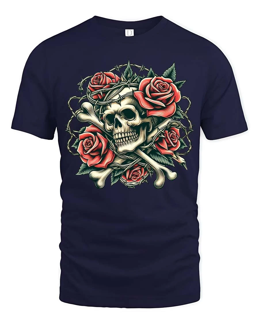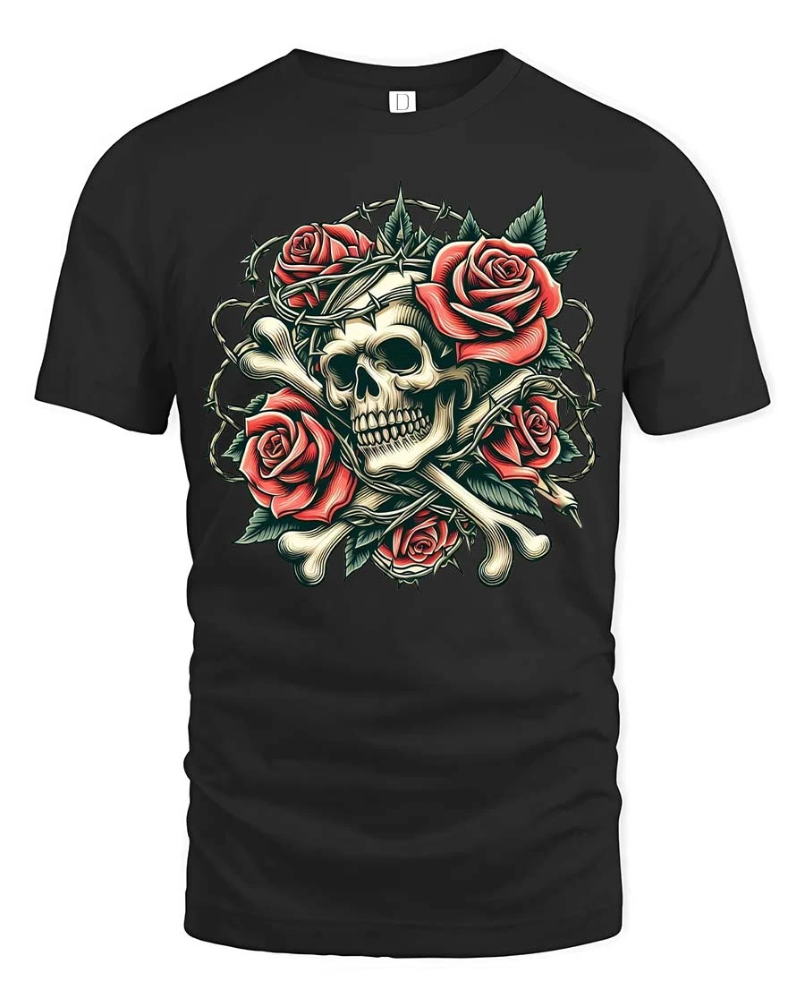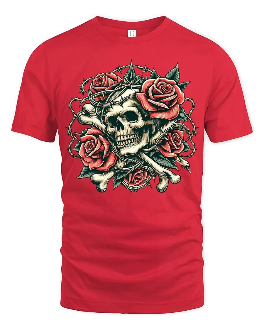 Gothic Skull Rose Thorn Graphic T Shirt Dark Vintage Style blends dramatic symbolism with artistic elegance.