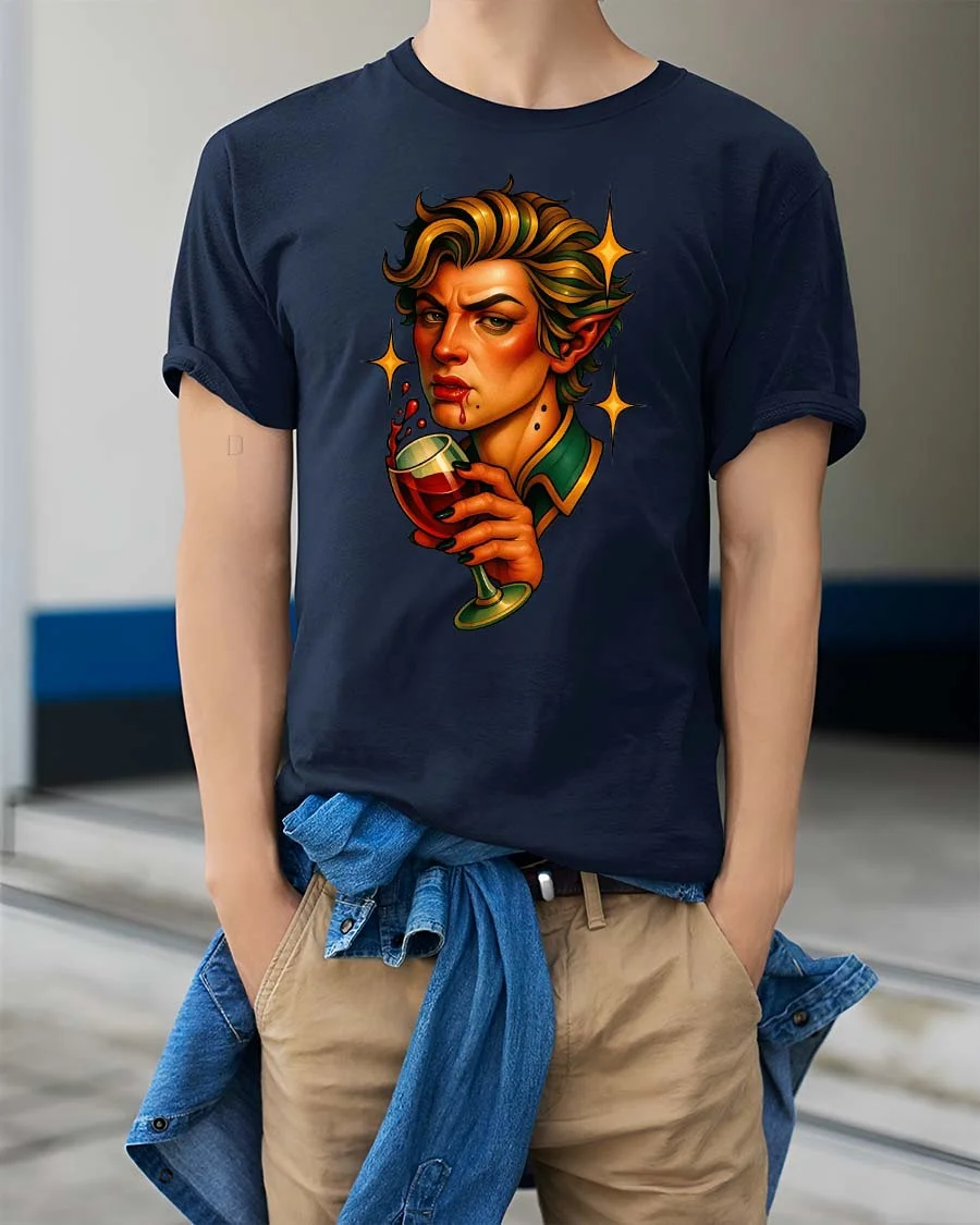 Gothic Vampire Elf Drinking Wine Graphic Tshirt Dark Fantasy brings together bold fantasy style and dark humor in a striking illustration that instantly grabs attention.