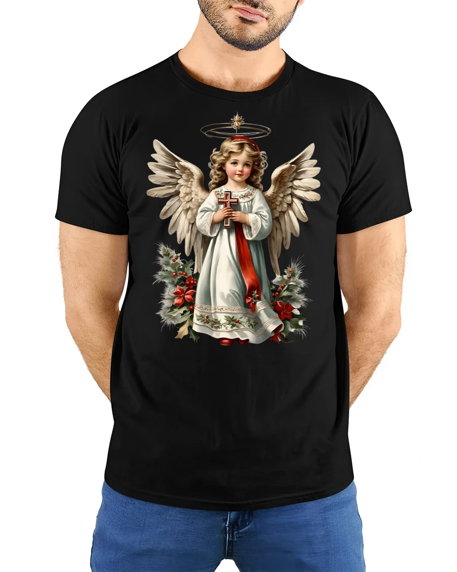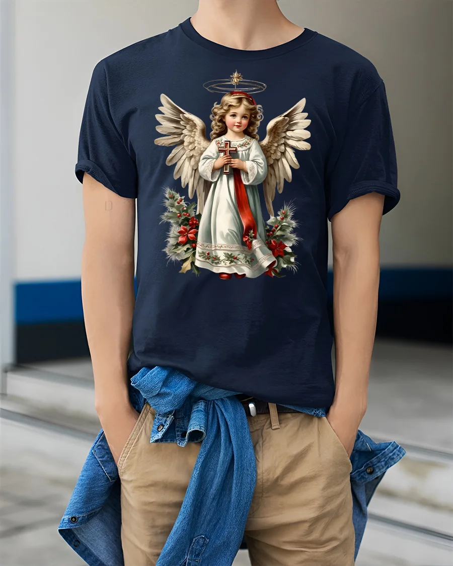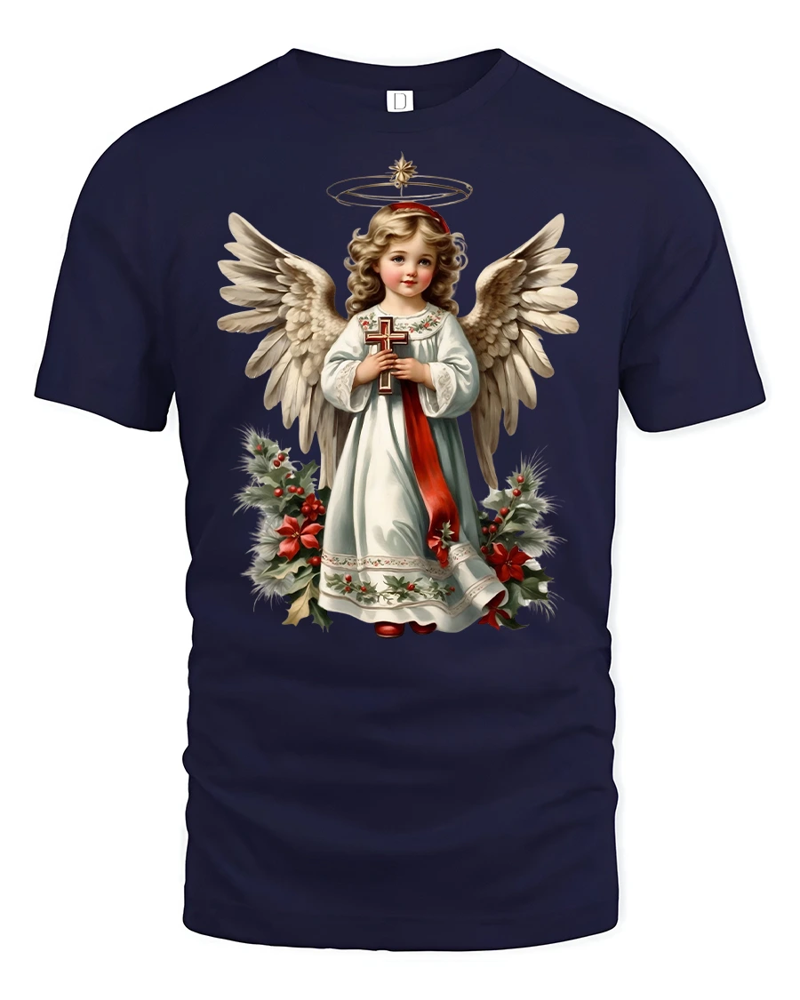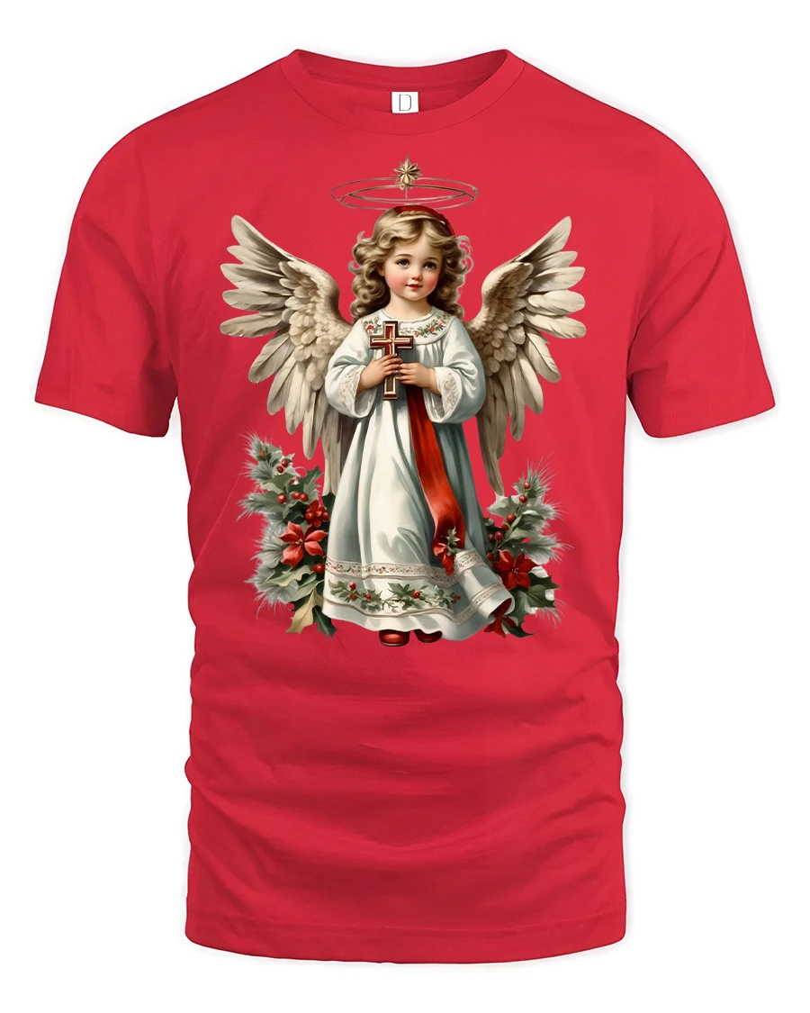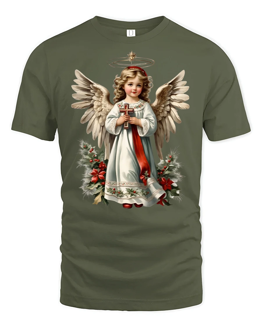 This tee also makes a wonderful gift for family and friends who cherish Christmas traditions. Pair it with jeans, cozy pants, or holiday accessories for a complete seasonal outfit. Celebrate the holidays with faith, beauty, and comfort in this angel-inspired Christmas t-shirt.